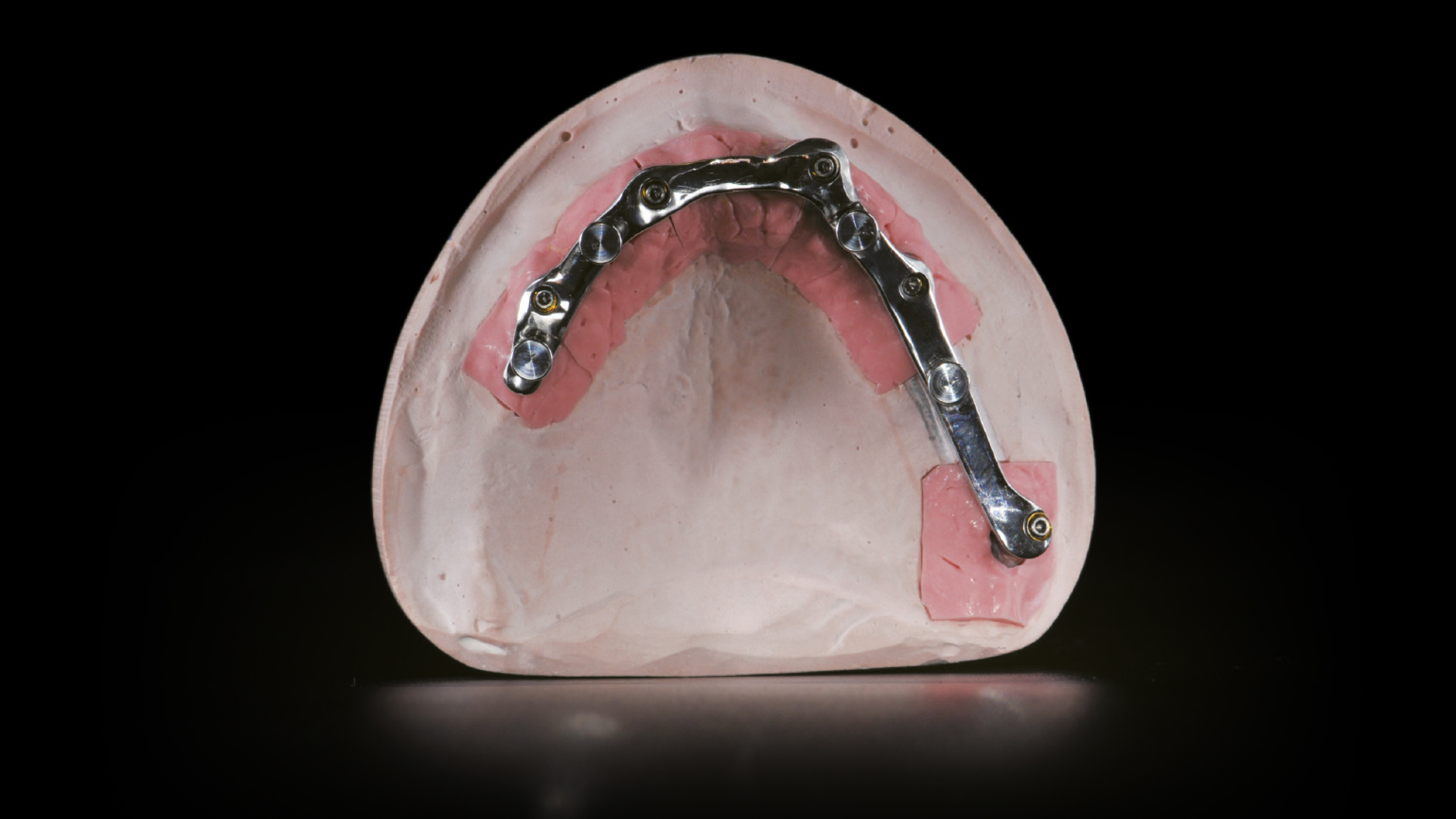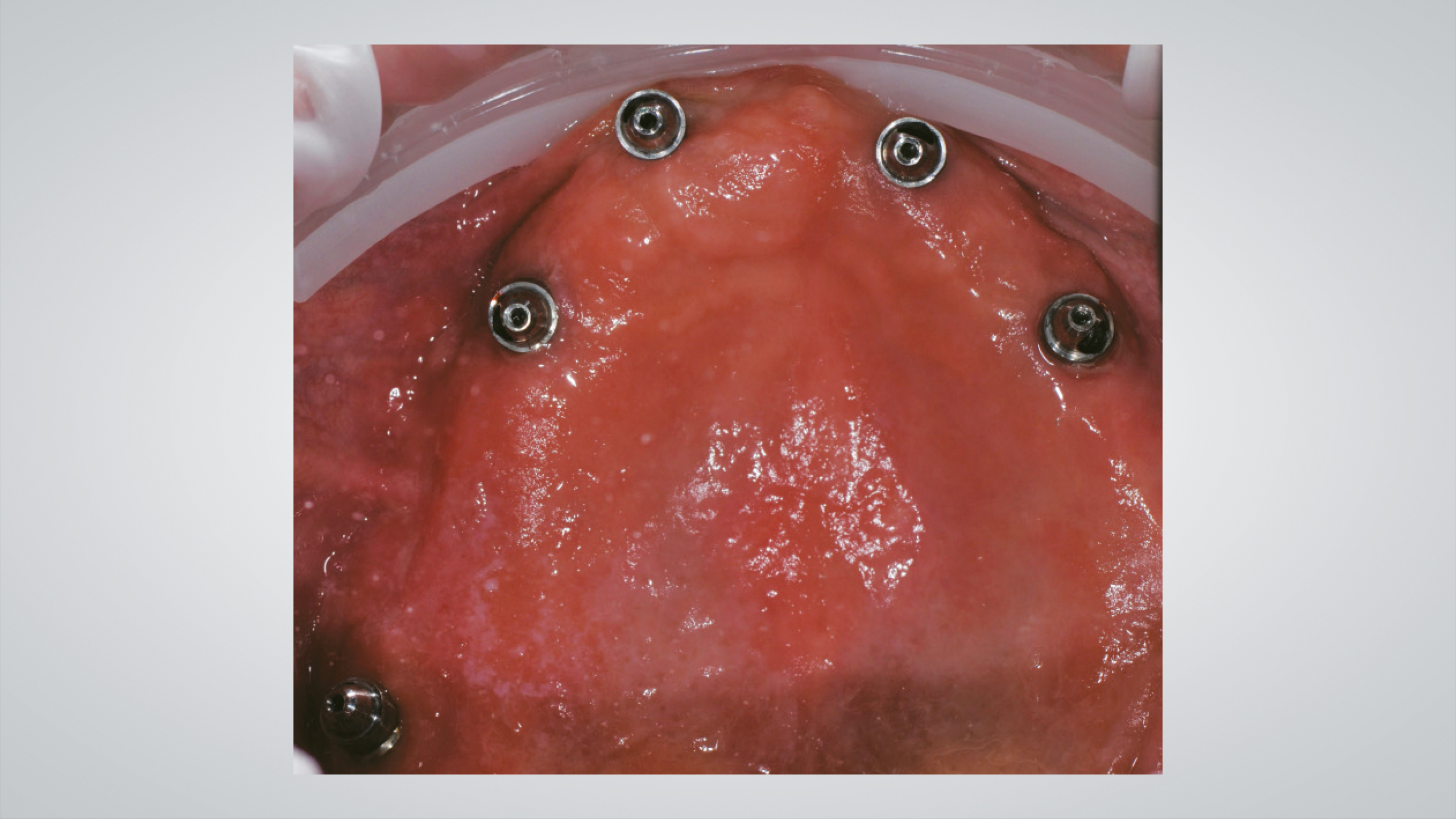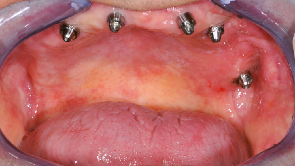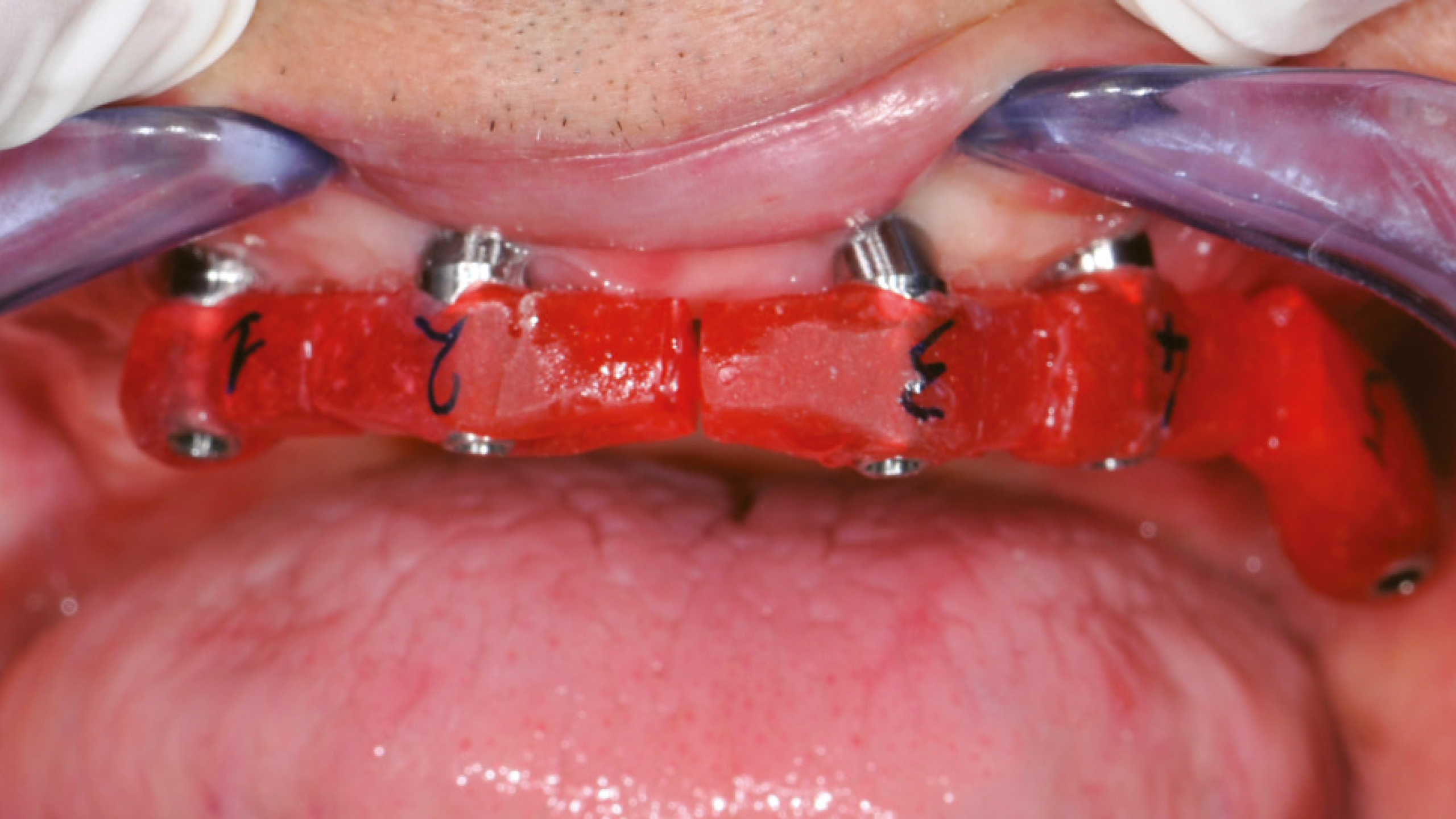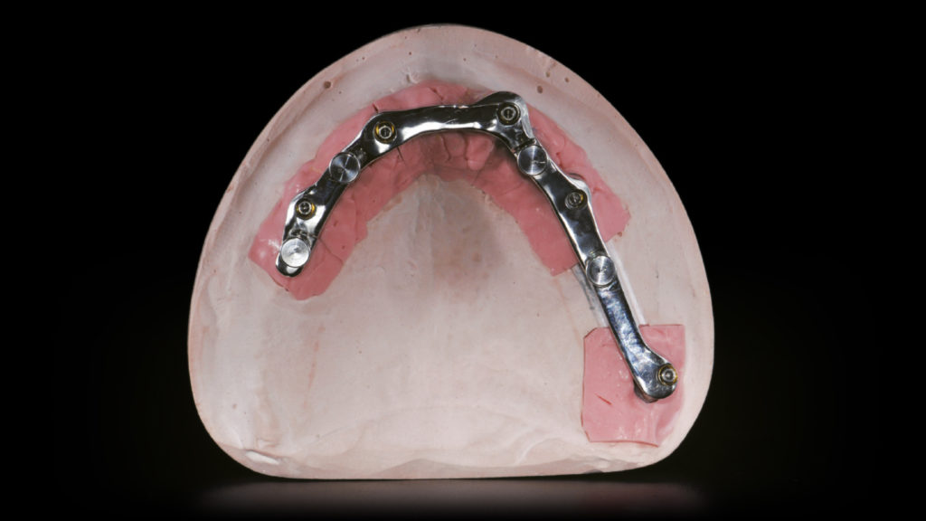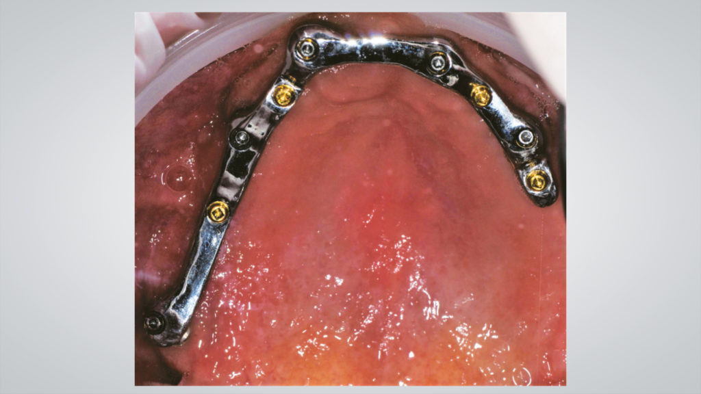 Der Steg wurde intraoral positioniert und anschließend mit Titannitrid (TiN)-beschichteten Schrauben fixiert, die mit