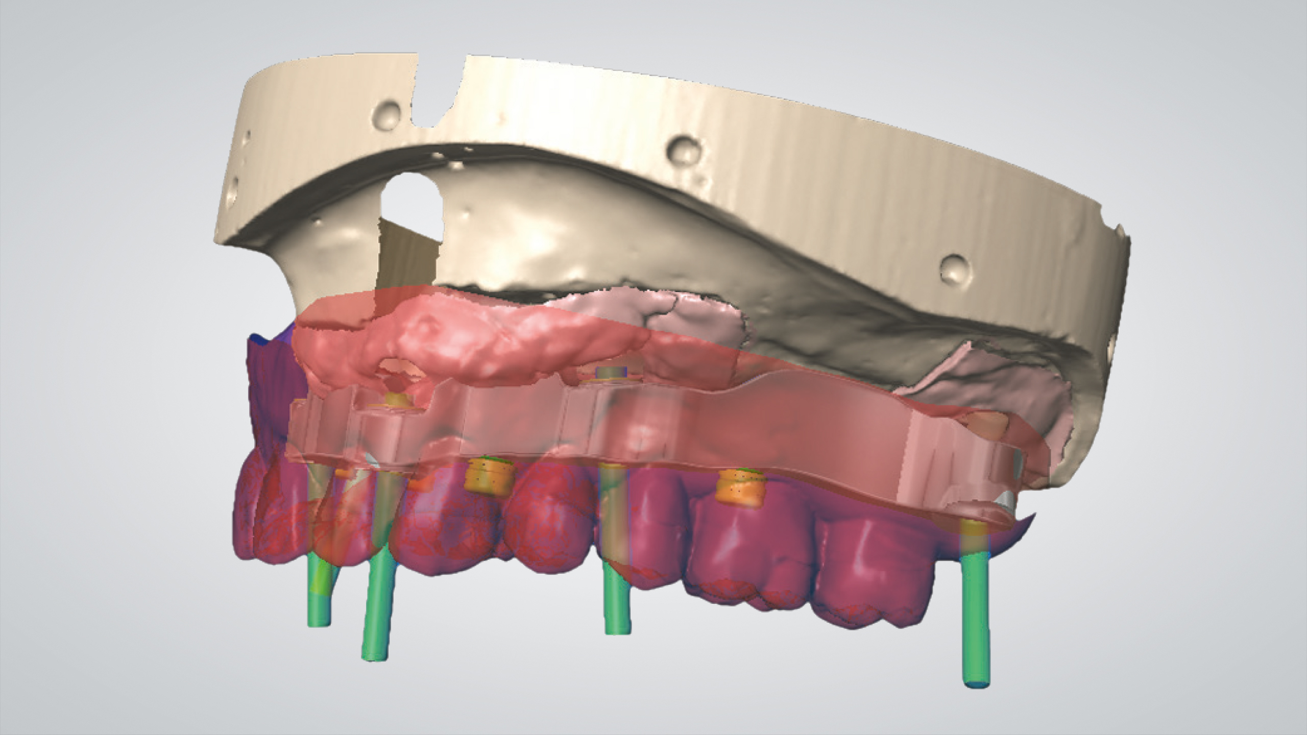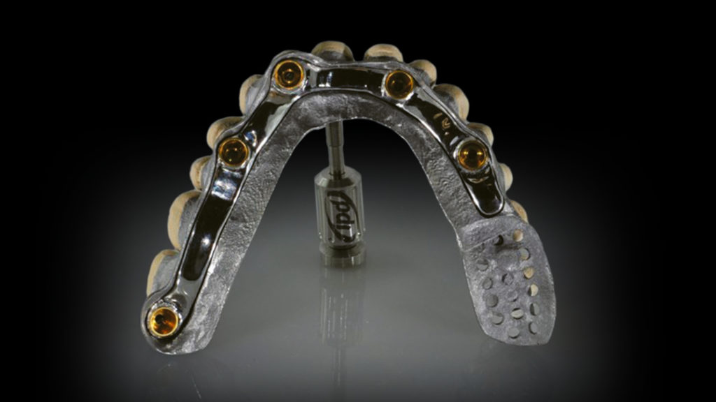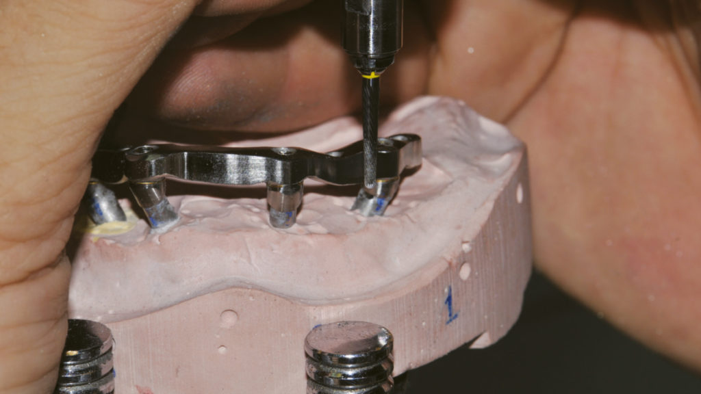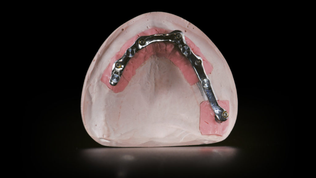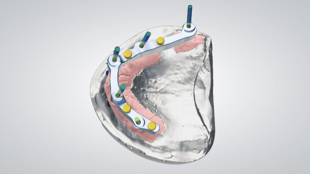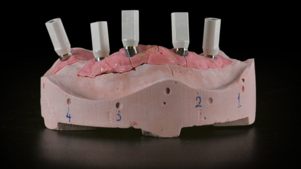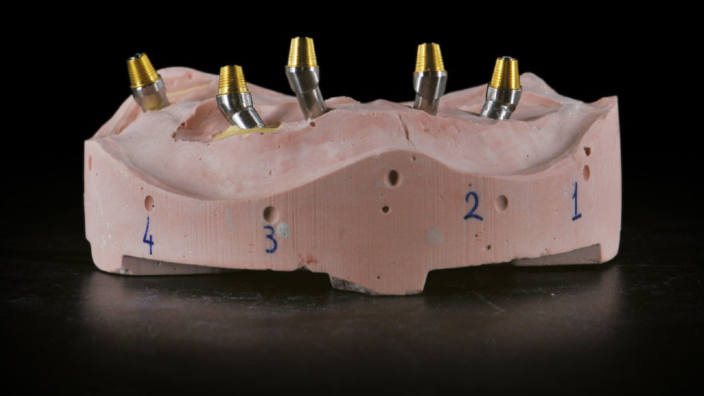 Bei zahnlosen Patienten mit starkem Knochenabbau ist meist eine implantatgetragene Rehabilitation sinnvoll. Bei divergierenden Implantatpositionen erfordert dies häufig einen Ausgleich durch abgewinkelte Abutments. Im vorliegenden Fall bestand die prothetische Lösung aufgrund der starken Knochenresorption in der Herstellung eines verschraubten Stegs mit einer abnehmbaren Prothese. Es wurden innovative digitale Arbeitsablaufprotokolle und CAD-Technologien eingesetzt.
