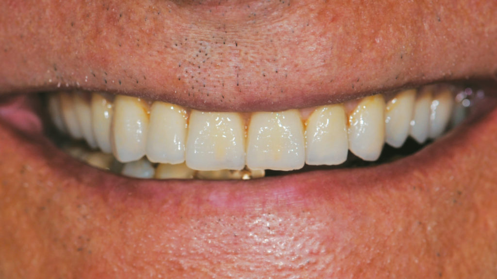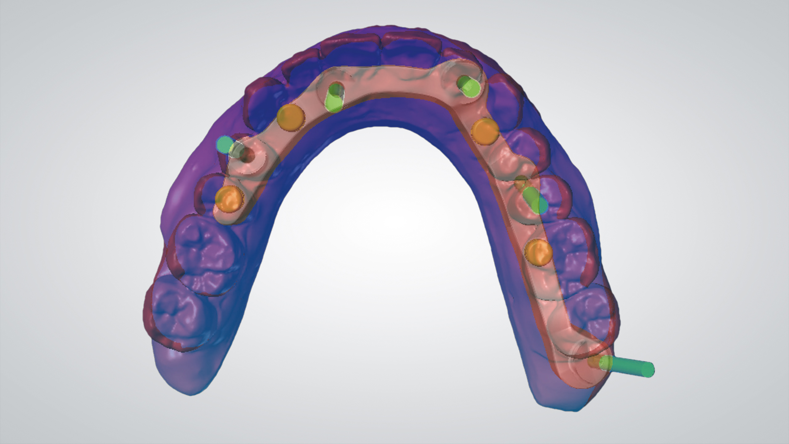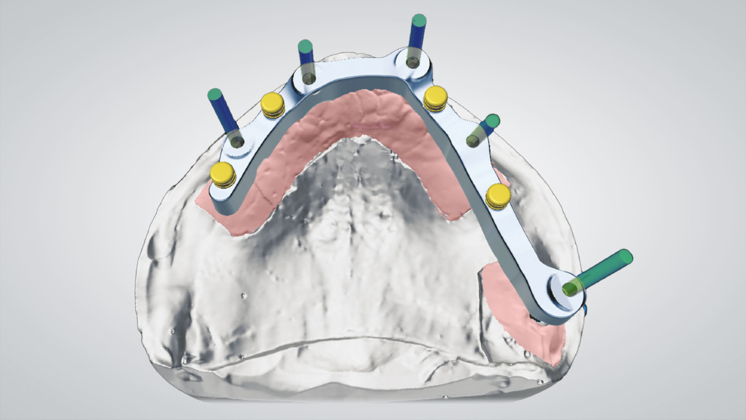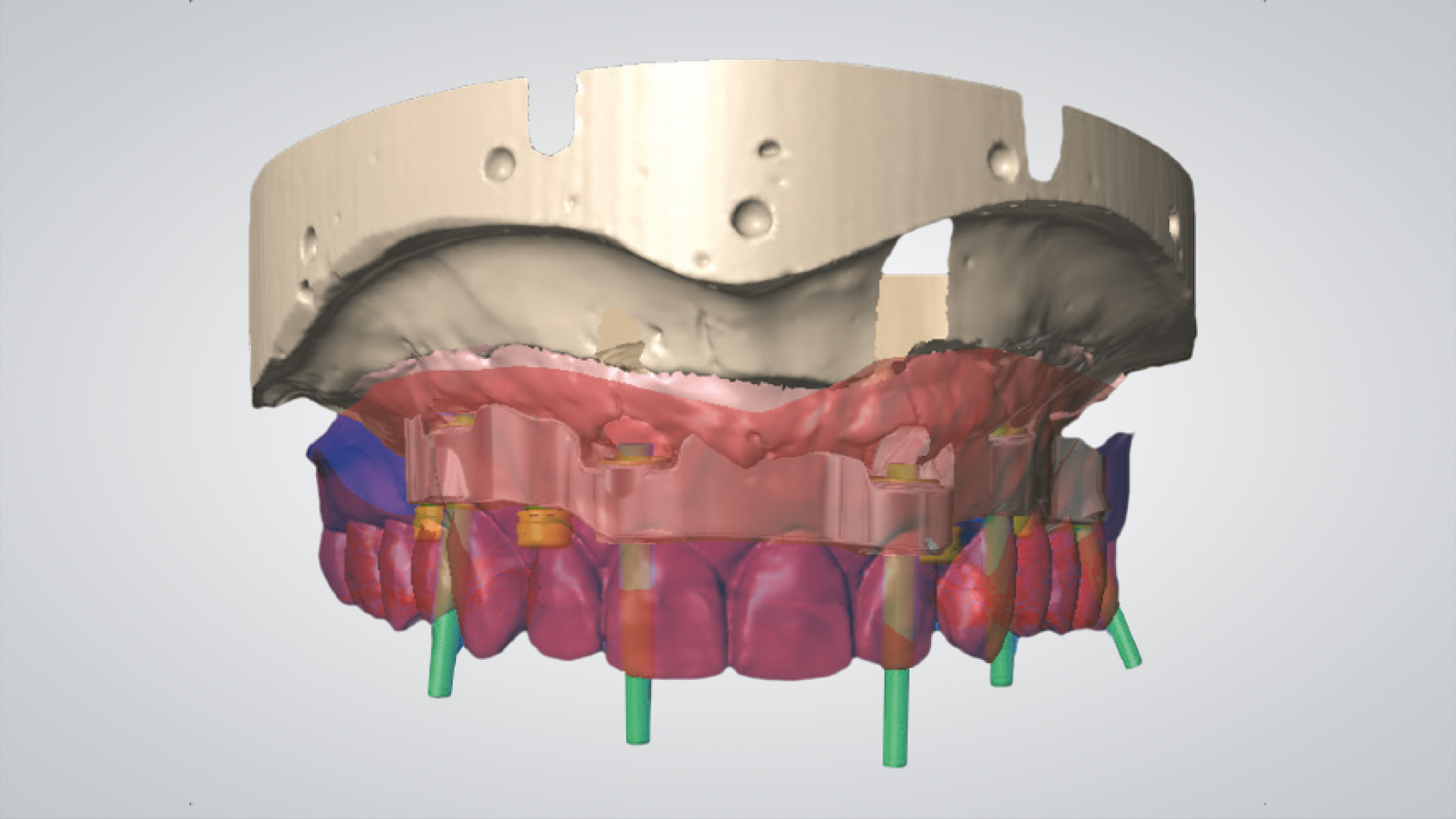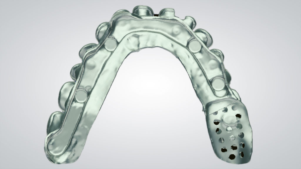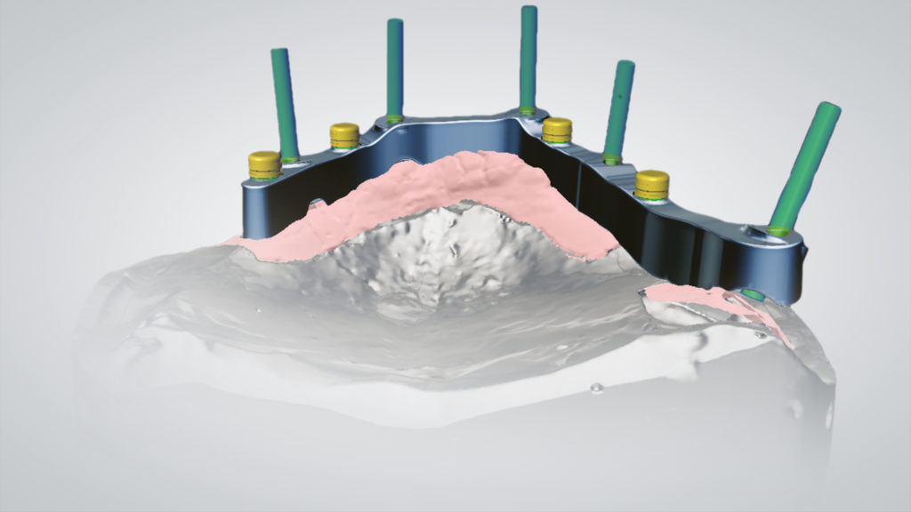 Der Einsatz von CAD ermöglicht es, eine bereits entworfene Prothese in eine ästhetischere und funktionellere zu verwandeln. Die Wahl fiel auf die abgewinkelten IPD Multi-Unit-Abutments, die eine ausgezeichnete mechanische Verbindung mit jedem auf dem Markt erhältlichen Implantat ermöglichen, was zu einer Reduzierung der Lagerhaltung und der Kosten führt. Nach dem Einrasten des IPD Multi-Unit-Abutments in das Implantat werden sie mit einer IPD-Hohlschraube temporär und mechanisch fixiert, um die Präzision zu gewährleisten. Die Scankörper wurden gescannt, der Steg wurde CAD-gestützt designt, lasergesintert und dann im Labor poliert. Es folgte ein weiterer Scan des Stegs, der uns die CAD-Konstruktion des Prothesengerüsts ermöglichte, wobei wir berücksichtigten, dass eine strenge Passung auf dem Steg erforderlich war. Dank der OT-Equator (Rhein83)-Attachments mit niedrigem Profil war die Prothese stabil, saß präzise auf dem Steg und ließ sich abnehmen.