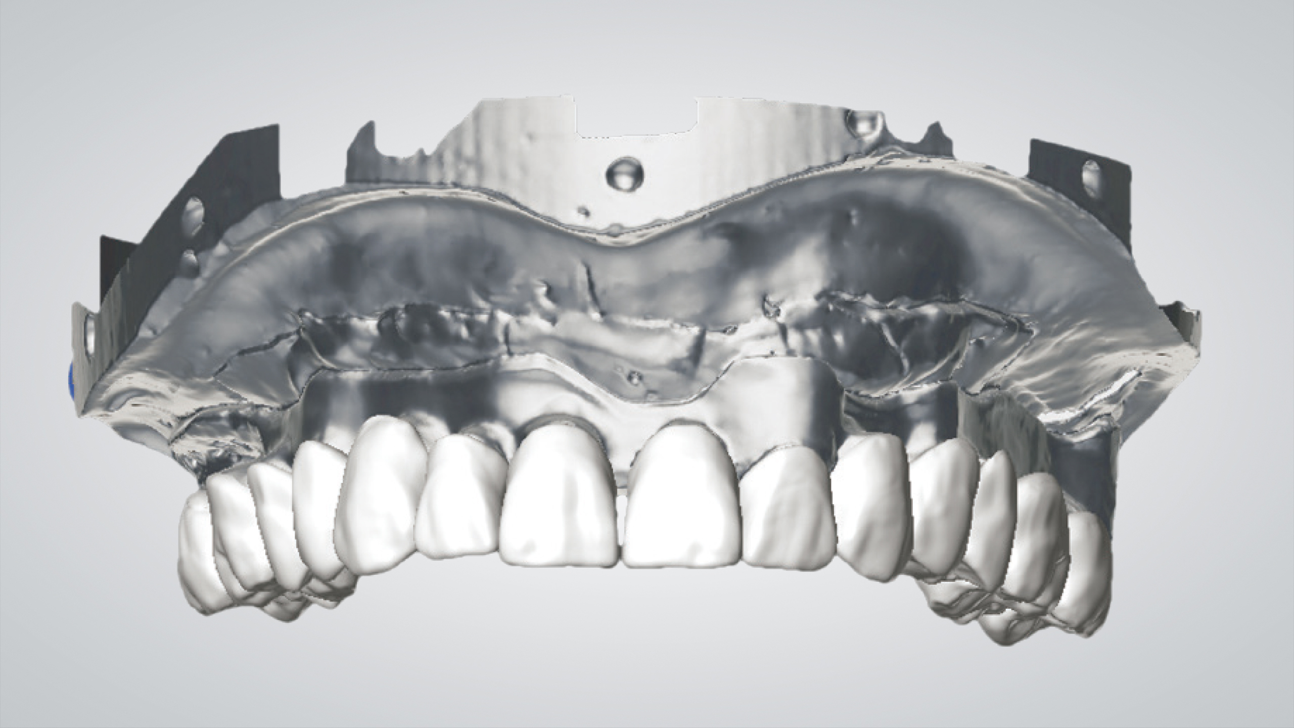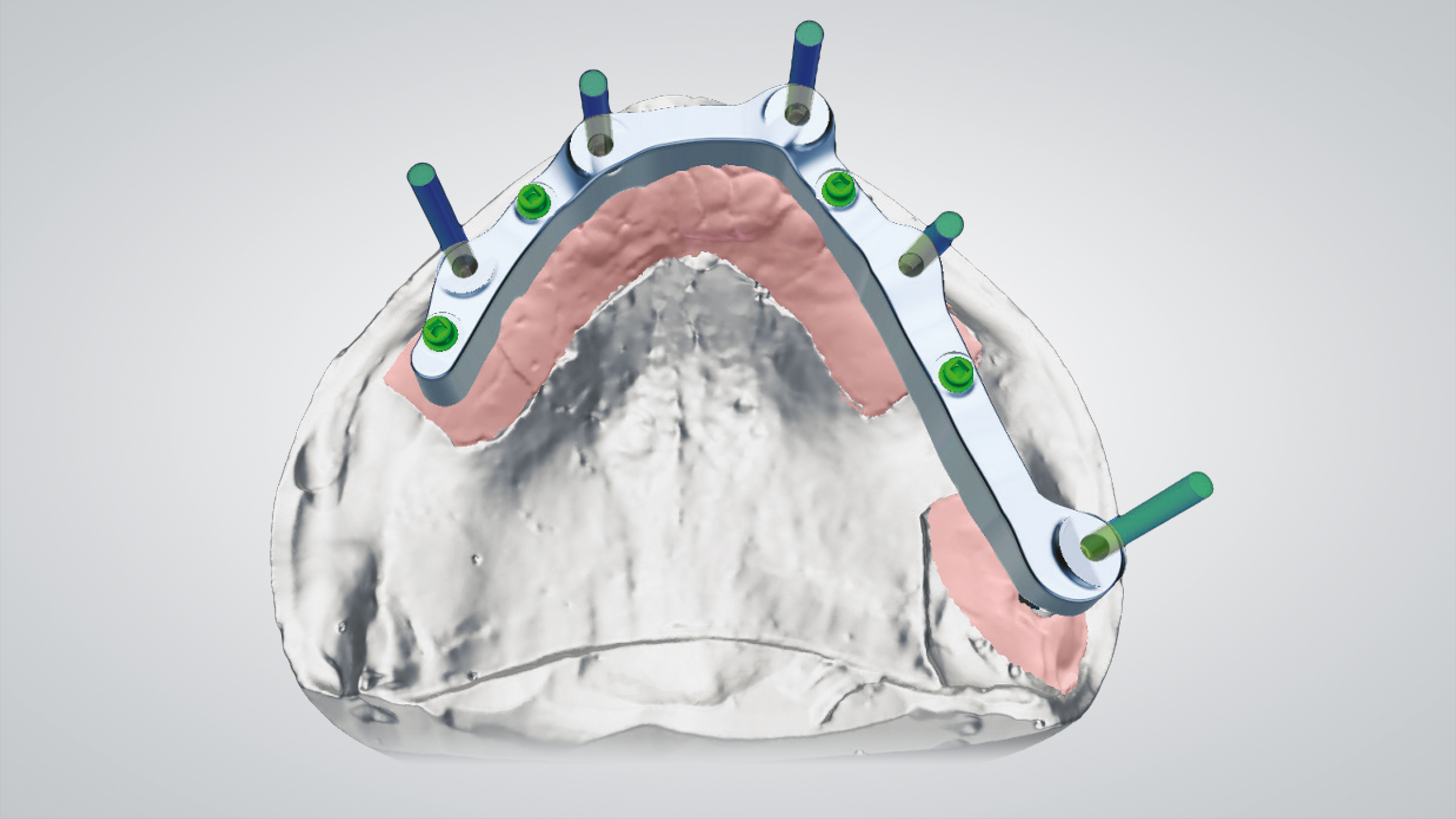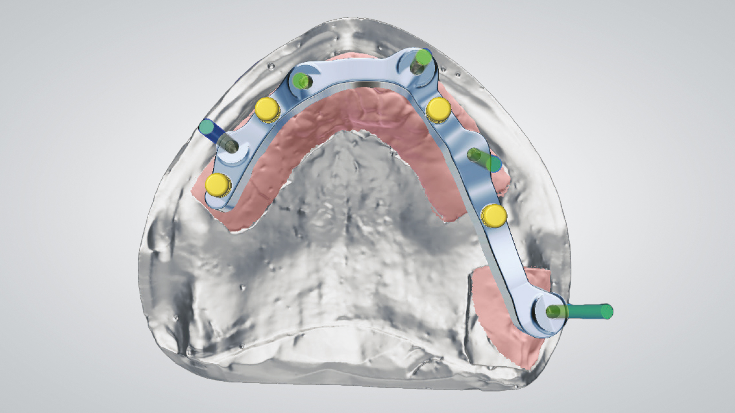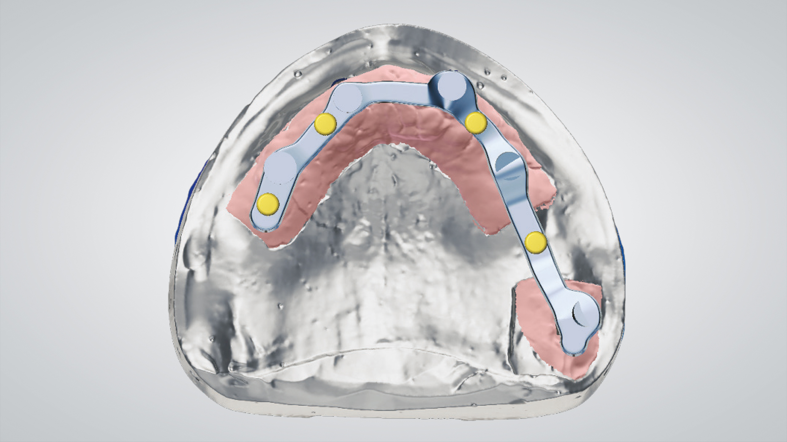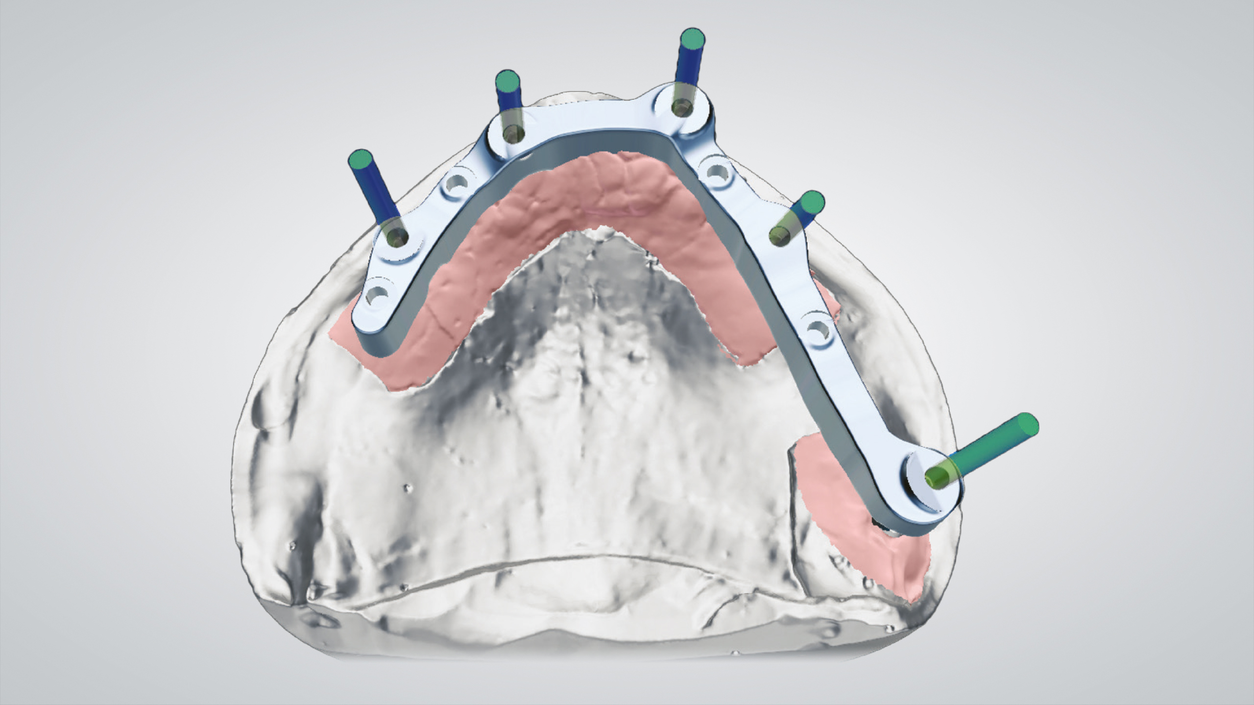 Der Einsatz von CAD ermöglicht es, eine bereits entworfene Prothese in eine ästhetischere und funktionellere zu verwandeln. Die Wahl fiel auf die abgewinkelten IPD Multi-Unit-Abutments, die eine ausgezeichnete mechanische Verbindung mit jedem auf dem Markt erhältlichen Implantat ermöglichen, was zu einer Reduzierung der Lagerhaltung und der Kosten führt. Nach dem Einrasten des IPD Multi-Unit-Abutments in das Implantat werden sie mit einer IPD-Hohlschraube temporär und mechanisch fixiert, um die Präzision zu gewährleisten. Die Scankörper wurden gescannt, der Steg wurde CAD-gestützt designt, lasergesintert und dann im Labor poliert. Es folgte ein weiterer Scan des Stegs, der uns die CAD-Konstruktion des Prothesengerüsts ermöglichte, wobei wir berücksichtigten, dass eine strenge Passung auf dem Steg erforderlich war. Dank der OT-Equator (Rhein83)-Attachments mit niedrigem Profil war die Prothese stabil, saß präzise auf dem Steg und ließ sich abnehmen.