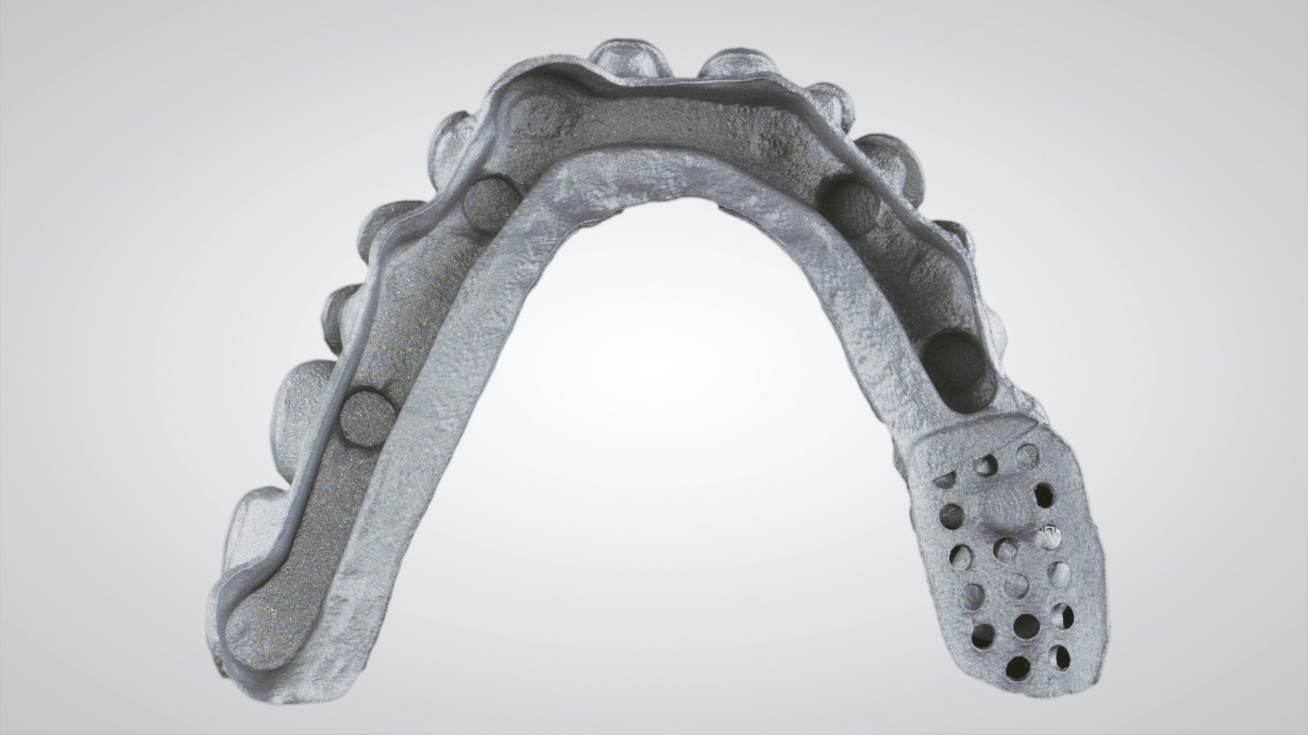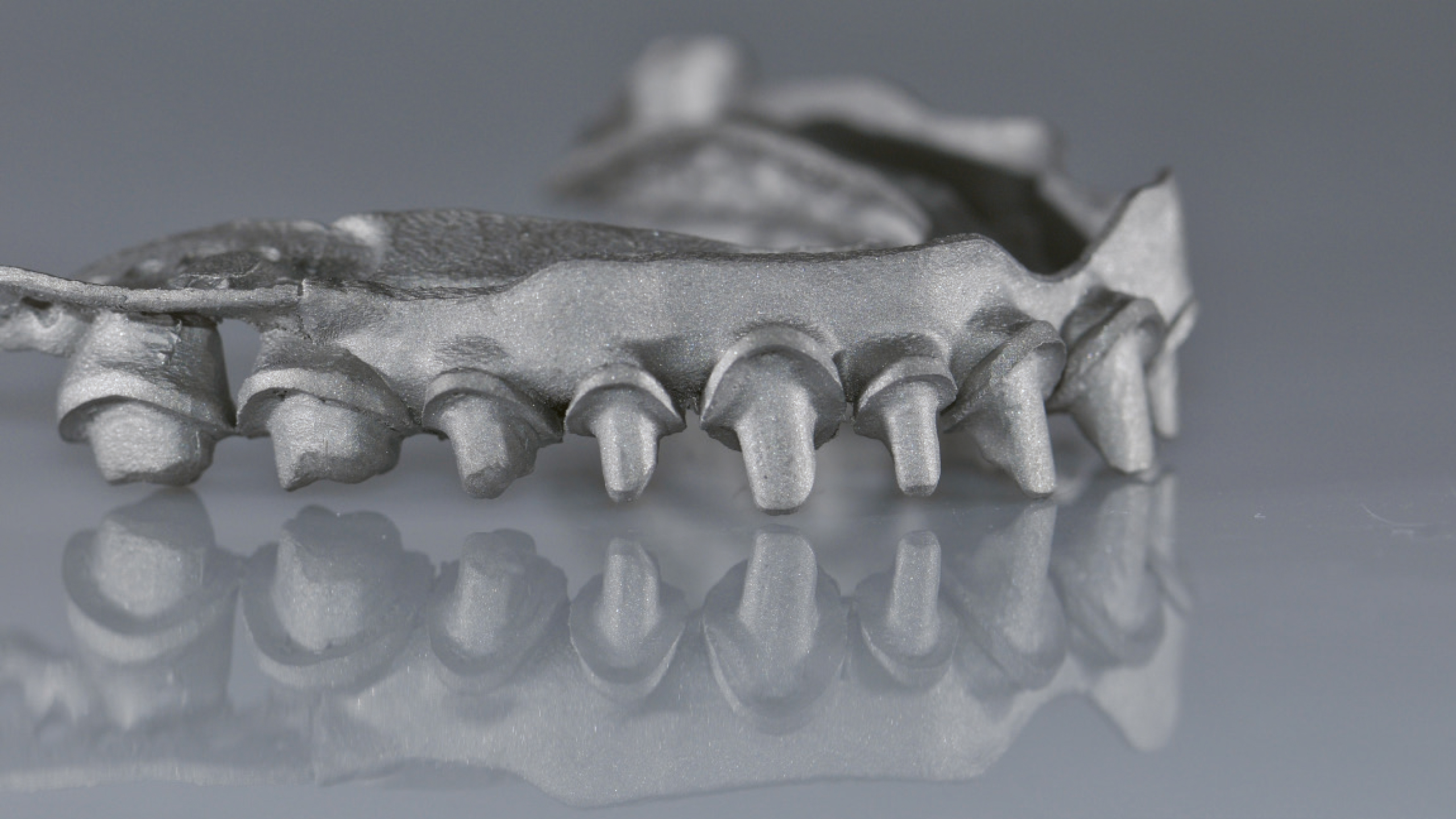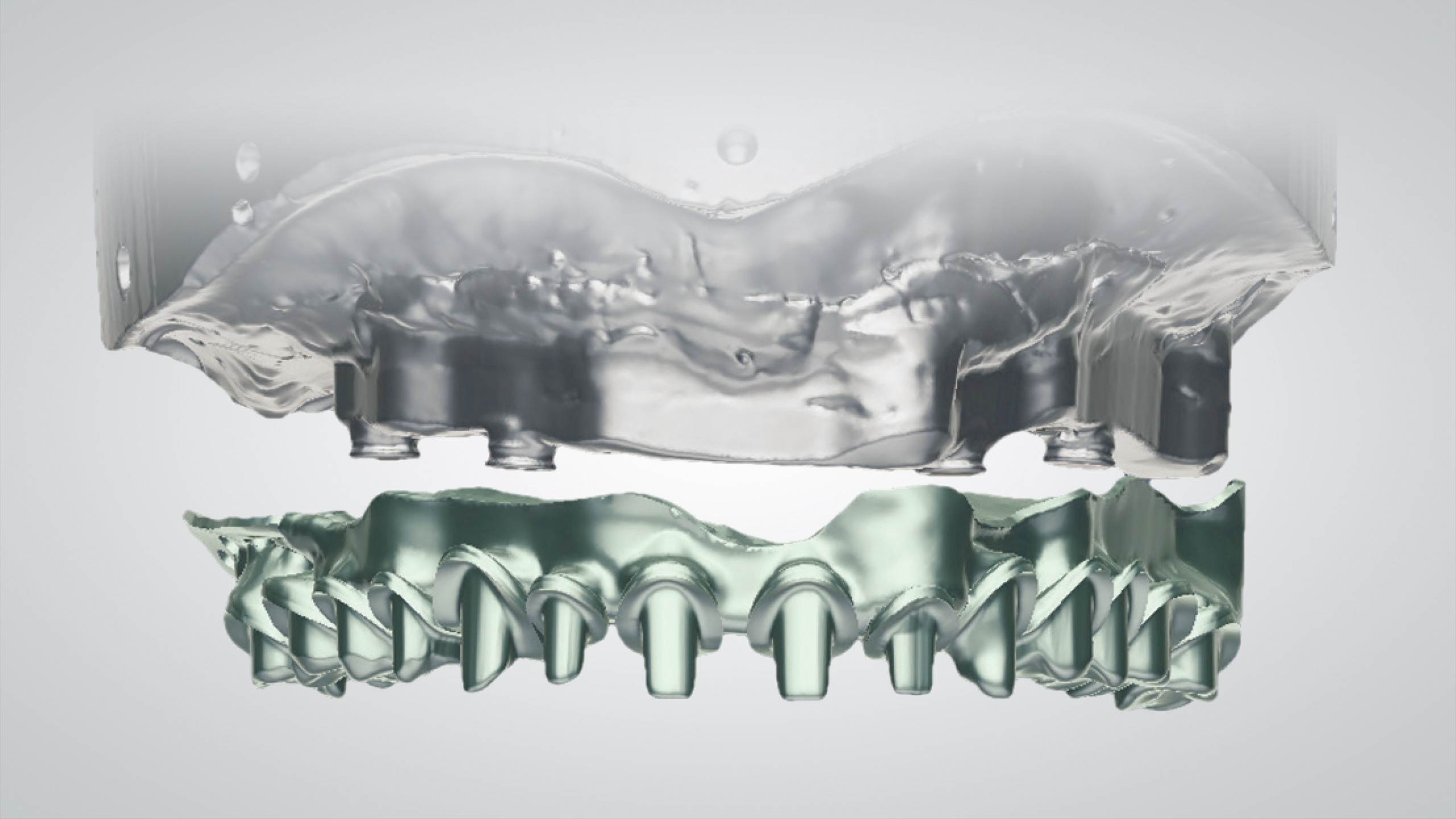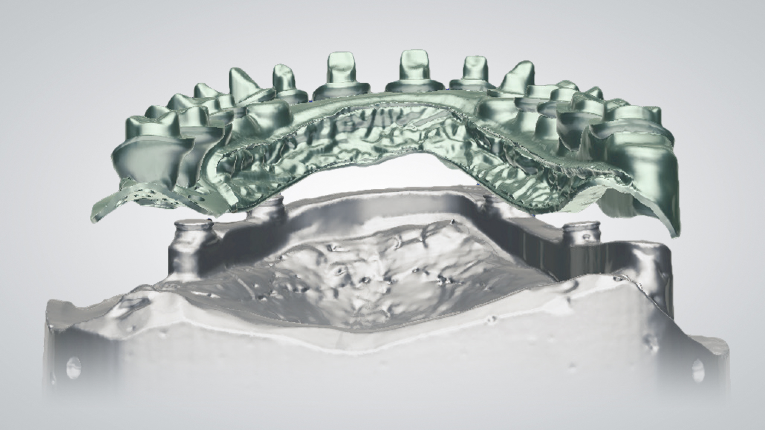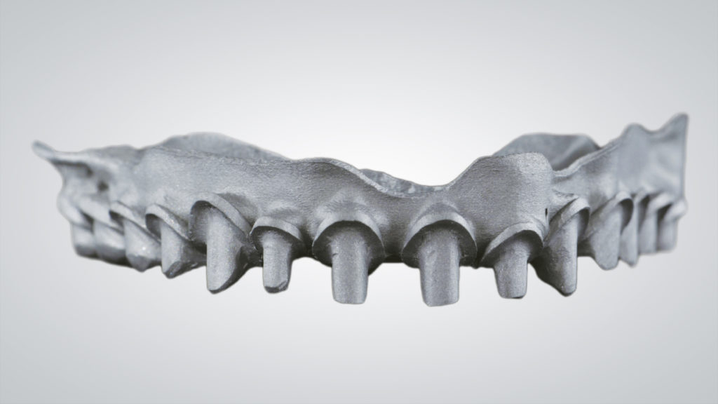CADdent hat seine Fertigungsverfahren um die hochpräzise HYBRID-Fertigung ergänzt. Diese innovative Fertigungsmethode vereint die Vorteile des LaserMelting-Verfahrens mit der CNC-Technik, und ist somit ideal für teleskopierende sowie okklusal direkt verschraubte Arbeiten geeignet. Besonderes Augenmerk liegt bei der inhouse Weiterentwicklung des Fertigungsverfahren auf der Präzision, so kann CADdent nun eine durchgängige Vestibulärfläche mit einer Dicke von nur 0,4 - 0,5 mm realisieren. Zudem ist CADdent das einzige Fertigungszentrum in Deutschland, das die Bearbeitung von Titan im Hybrid-Verfahren anbietet.