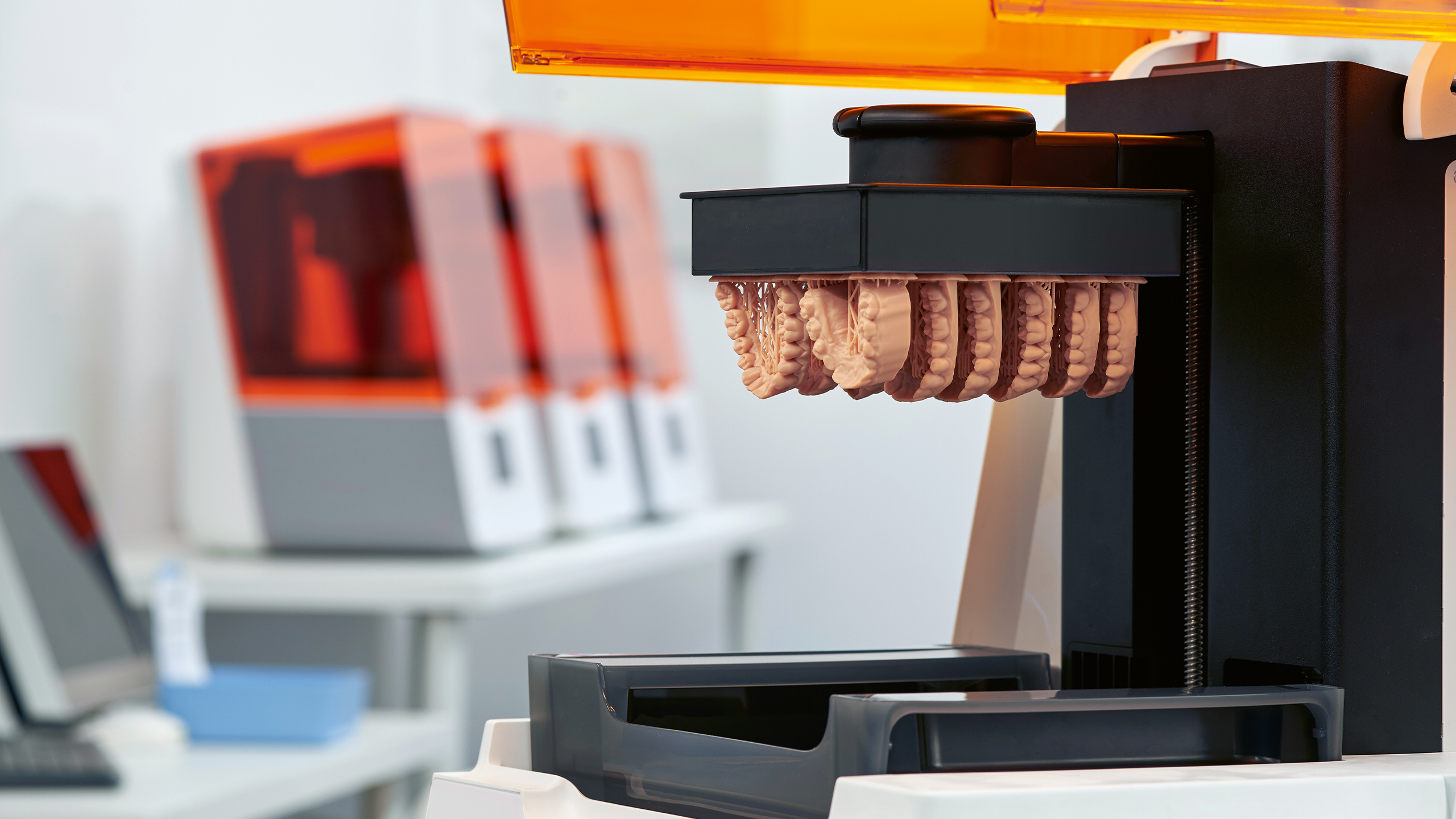 Vor einigen Jahren machte das Dentallabor erste Erfahrungen mit einem 3D-Drucker. Schon kurze Zeit später war das Gerät im Dauereinsatz. Inzwischen hat Kreimer ein weiteres Modell in seinen Fertigungsalltag integriert. Zu seinem ersten digitalen Kollegen, dem Form2 (Formlabs), kam zusätzlich der Form 3B (Formlabs) (Abb. 2) hinzu. Kreimers neueste Errungenschaft wurde speziell für die Zahnmedizin entworfen. Es ist der bisher genaueste Drucker, dem die „Low Force Stereolithography“-Technologie zugrunde liegt. Das Gerät erreicht Druckergebnisse mit sehr hoher Oberflächenqualität und -klarheit. Zudem punktet dieser Desktop-3D-Drucker mit kompakter Größe und seiner Benutzerfreundlichkeit. Einzelne Bauteile können leicht von jedem Nutzer ausgewechselt werden. Der Ferndruck per App ist eine weitere Option. Während die 3D-Drucker fester Bestand im Arbeitsalltag von Stephan Kreimer sind, verwenden etwa 70 Prozent seiner Kunden Intraoralscanner. Das führt dazu, dass Kreimers Drucker Tag und Nacht in Verwendung sind. Der Einsatz der 3D-Drucker verschafft Vorteile in puncto Qualität, Reproduzierbarkeit und Skalierbarkeit. Der Produktion geht jedoch stets eine digitale Konstruktion voraus. Durch den Intraoralscanner in der Zahnarzt­praxis oder durch einen Desktopscanner im Dentallabor werden Patientendaten digitalisiert. Anschließend werden die Daten in eine dentale CAD-Software importiert, in der das Design der Restauration vorgenommen wird. Die STL-Ausgabe der CAD Software kann mit einer speziellen Software für den 3D-Druck vorbereitet werden. Nach dem Druck werden die Objekte in Isopropanol (99 Prozent) gereinigt und mit einem Lichthärtegerät endgehärtet. Die manuelle Bearbeitung durch einen Zahntechniker, um das Dentalprodukt zu veredeln, bleibt nach wie vor Handarbeit.