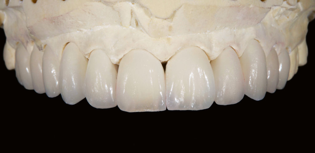 Nach der Abformung wurden Situationsmodelle angefertigt und in habitueller Interkuspidation artikuliert. Es folgte ein ästhetisches Wax-up im Oberkiefer, das mit einem Silikonschlüssel gesichert und darüber dann mittels provisorischen Kronen- und Brückenmaterials in den Mund der Patientin übertragen wurde. Um den bukkalen Korridor mehr aufzufüllen, erstreckte sich das Mock-up von Zahn 16 auf Zahn 24. Nachdem einige Feinheiten im Dialog mit der Patientin additiv und subtraktiv angepasst worden waren, wurde die Situation überabgeformt. Nach lokaler Anästhesie folgte die Präparation durch das Mock-up hindurch. So wird wirklich nur so viel entfernt, wie für die ästhetische Korrektur notwendig. Es war das erklärte Ziel, die Patientin im Schmelzbereich non- beziehungsweise minimalinvasiv zu versorgen. Der Oberkiefer wurde abgeformt und auf dieser Basis ein Meistermodell mit feuerfesten Stümpfen der zu versorgenden Zähne hergestellt (Abb. 3).