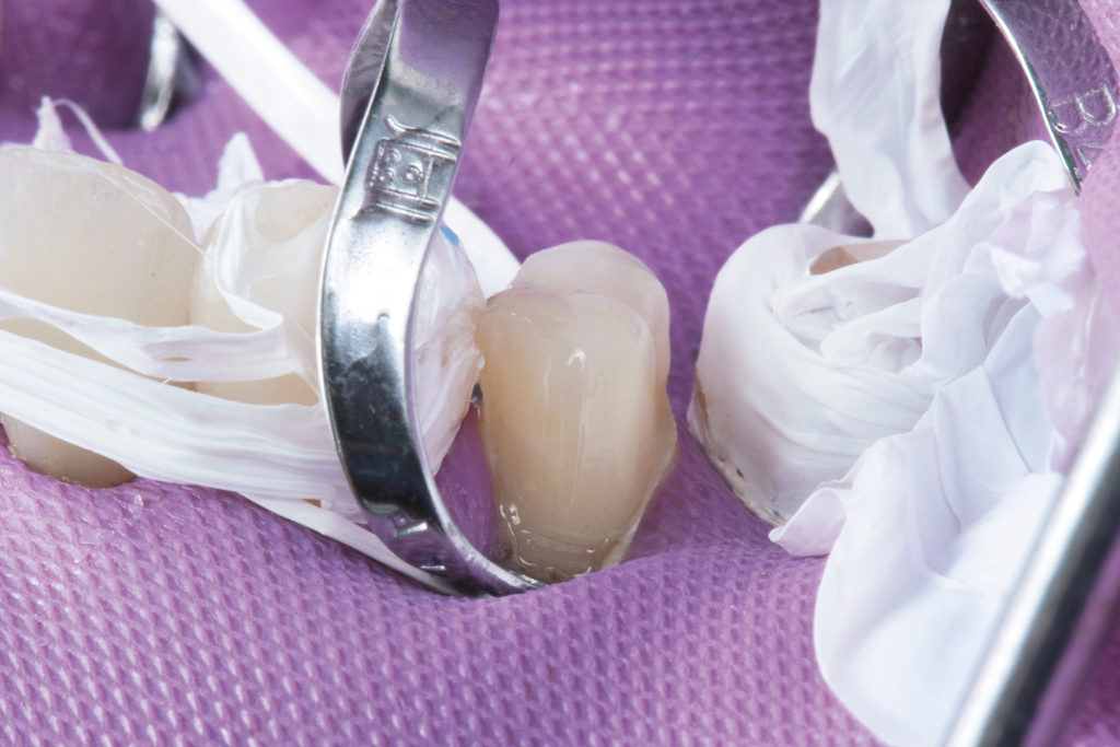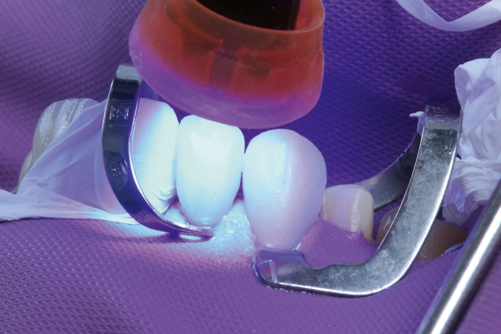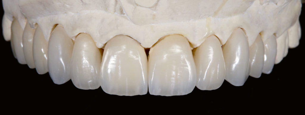Insbesondere wenn es darum geht, rein ästhetischen Bedürfnissen der Patienten gerecht zu werden, muss das Behandlerteam einen Spagat vollziehen. Da eine ästhetische Korrektur oftmals nicht ohne Präparation möglich ist, muss mit Bedacht und somit möglichst minimalinvasiv vorgegangen werden. Es gilt, mit so wenig Manipulation wie möglich so viel Veränderung wie nötig zu erreichen. Dies hat zur Folge, dass dem Zahntechniker für die Formkorrektur nur sehr wenig Platz zur Verfügung steht – ein Umstand, dem mit entsprechendem Material begegnet werden kann. Die zur Lösung dieses Veneerfalls gewählte natürliche Feldspat-Verblendkeramik Vita VMK Master-Schichtkeramik bringt dafür die nötigen lichtdynamischen Eigenschaften mit, um selbst bei geringsten Platzverhältnissen für ein lebendiges Gesamtbild zu sorgen.