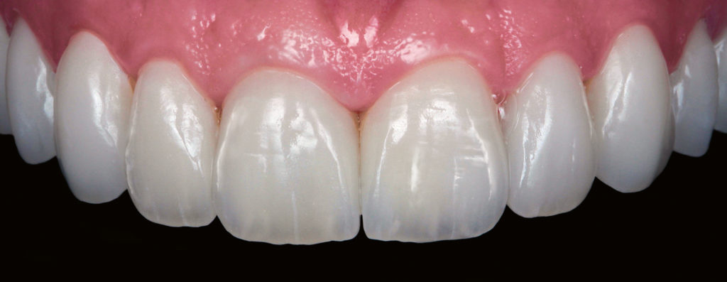 Nach dem abschließenden Brand wurden die elf Veneers vorsichtig ausgearbeitet und poliert (Abb. 6 und 7). Im Rahmen der klinischen Einprobe mit Glyceringel zeigte sich die Patientin sofort begeistert von ihrem neuen Erscheinungsbild. Somit konnte der Kofferdam angelegt und mit der Konditionierung der Klebeflächen der Veneers mit Flusssäure und Silan begonnen werden konnte (Abb. 8 und 9). Nachdem der vestibuläre Schmelz der Zähne sukzessive mit Phosphorsäure geätzt worden war, wurde jeweils das Adhäsiv Clearfil SE Bond aufgetragen und ausgehend vom zweiten Quadranten ein Veneer nach dem anderen mit Befestigungskomposit eingegliedert (Abb. 19 und 11). Das Ergebnis überzeugte alle an der Restauration Beteiligten, und insbesondere die Patientin war mit ihren neuen Zähnen sehr glücklich (Abb. 12 bis 14). Die Veneers wirken absolut natürlich und überzeugen durch ein ausgewogenes Farb- und Lichtspiel.