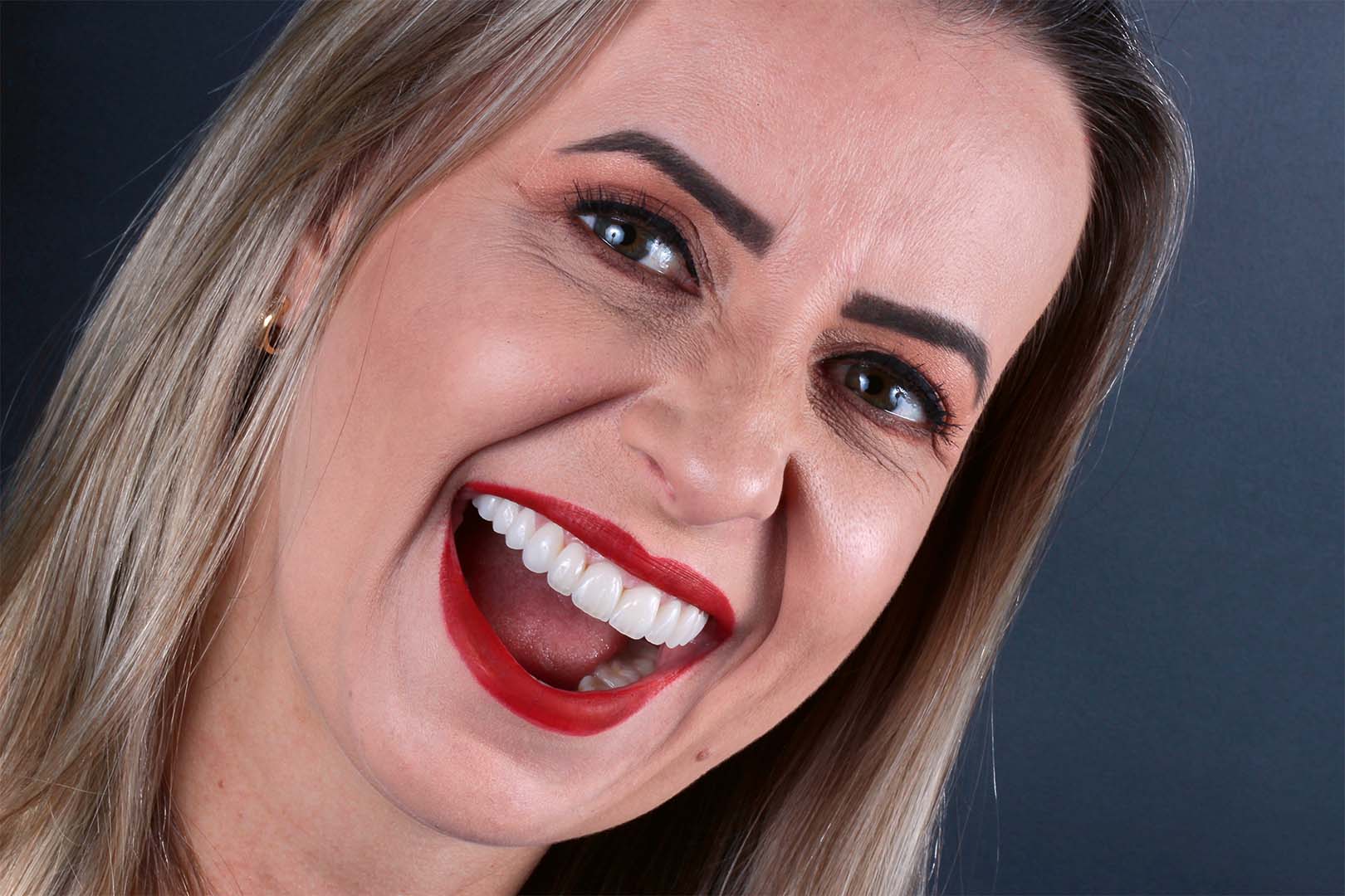 Die zum Zeitpunkt der Behandlung 38-jährige Patientin wurde in der Zahnarztpraxis von Dr. Rafael Ballista vorstellig, da sie mit dem ästhetischen Erscheinungsbild ihrer Oberkieferfrontzähne unzufrieden war. Nach multiplen Füllungstherapien mit Komposit wirkte die Oberkieferfront leblos und strukturlos. Der Inzisalkantenverlauf befand sich von Zahn 13 auf 23 auf einer Linie, was unnatürlich wirkte. Die mittleren Schneidezähne zeigten ein unterschiedliches Längen-Breiten-Verhältnis (Abb. 1). Beim Lächeln fiel auf, dass der bukkale Korridor beidseitig zu stark ausgeprägt war, weshalb der Oberkiefer im Verhältnis zur Mundbreite zu klein wirkte (Abb. 2). Nach eingehender Beratung entschied sich die Patientin für eine Rehabilitation der ästhetischen Zone mit individuell auf feuerfesten Stümpfen geschichteten Veneers aus der Vita VMK Master-Verblendkeramik.