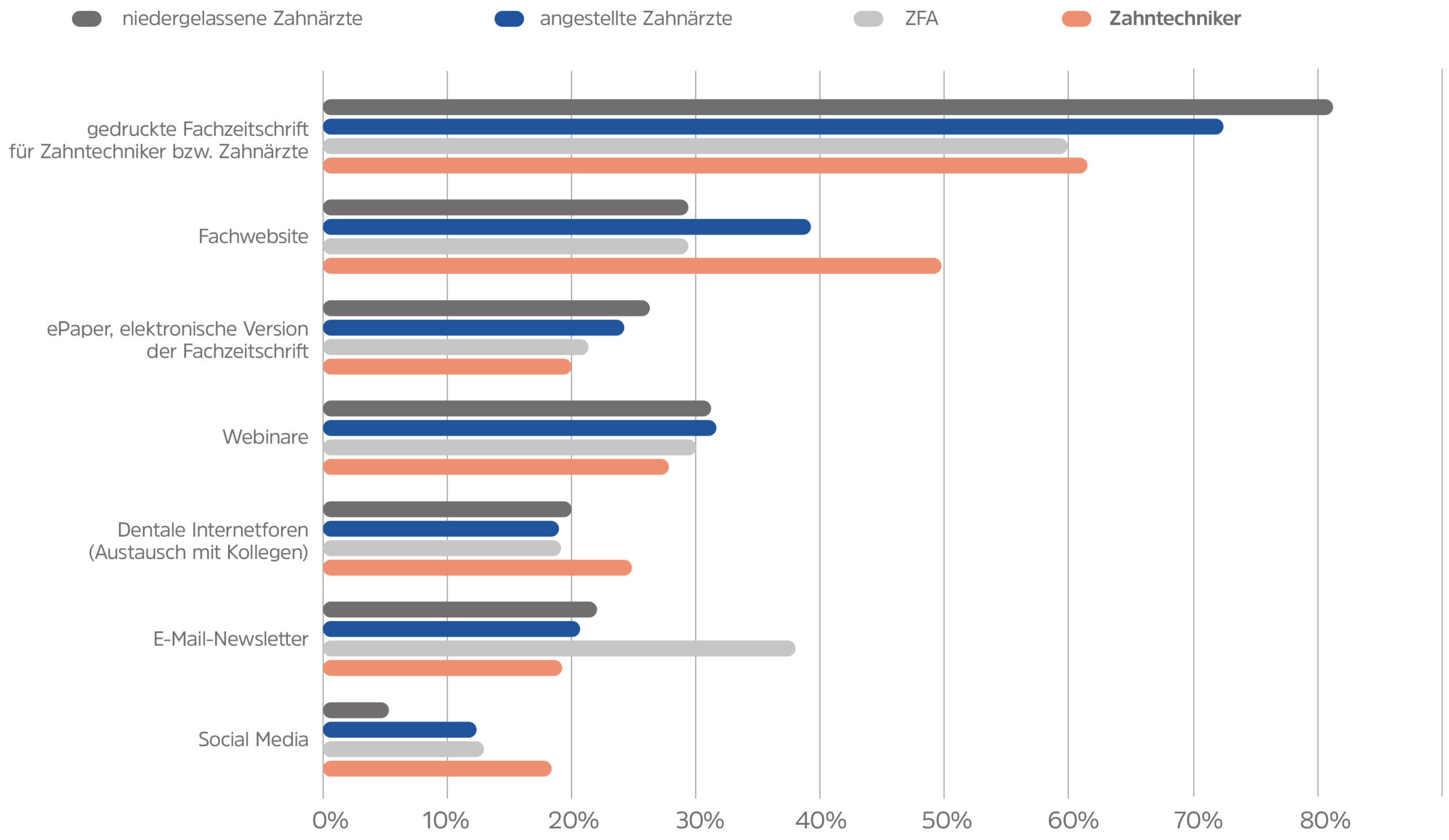 Papier oder online? Auf Firmenwebsites oder über das Dentaldepot? Lieber Videos oder Text? Zahntechniker, Zahnärzte und das Fachpersonal der Zahnarztpraxen ziehen viele verschiedene Quellen heran, um sich beruflich zu informieren. Welche Medien sie am liebsten nutzen, zeigt eine neue Studie.