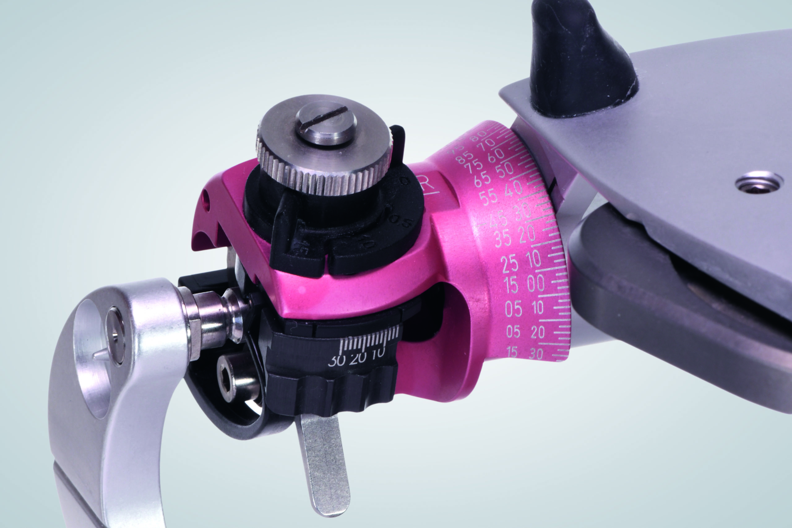 Anschließend wird mit einer Hand das Artikulatoroberteil mit dem Modell auf dem Registrat fixiert und mit der anderen Hand das Kondylengehäuse gedreht, bis es die Kondylen berührt. Diese Position wird verriegelt, der Wert wird abgelesen und im Registrierprotokoll notiert. Mit dem anderen Gelenk des Artikulators wird ebenso verfahren. Auch dieser Wert wird im Registrierprotokoll notiert (Abb. 19 und 20).