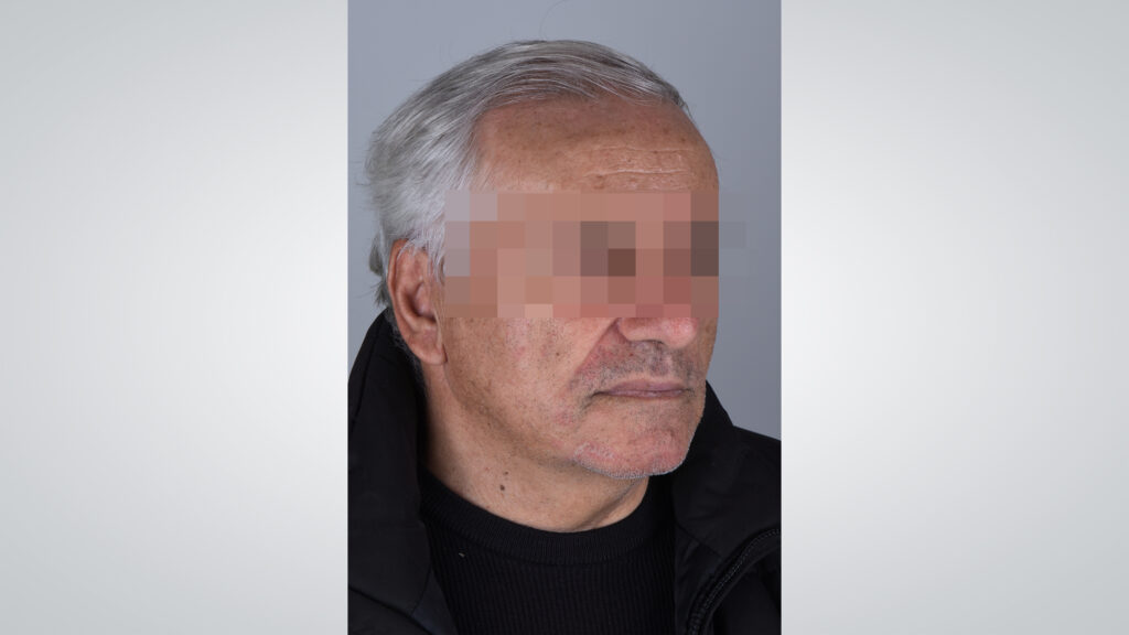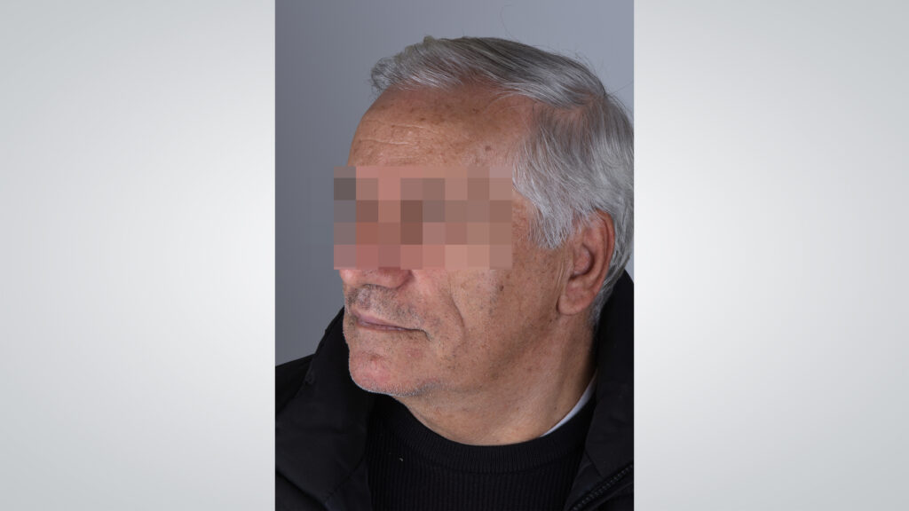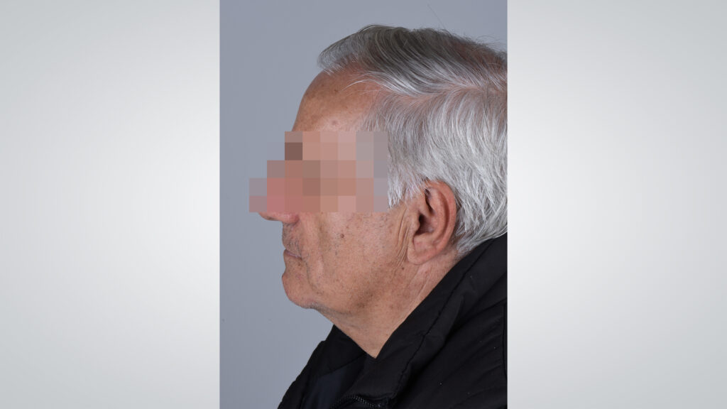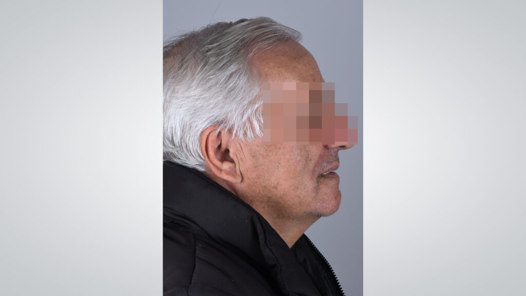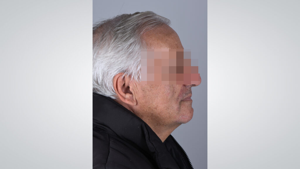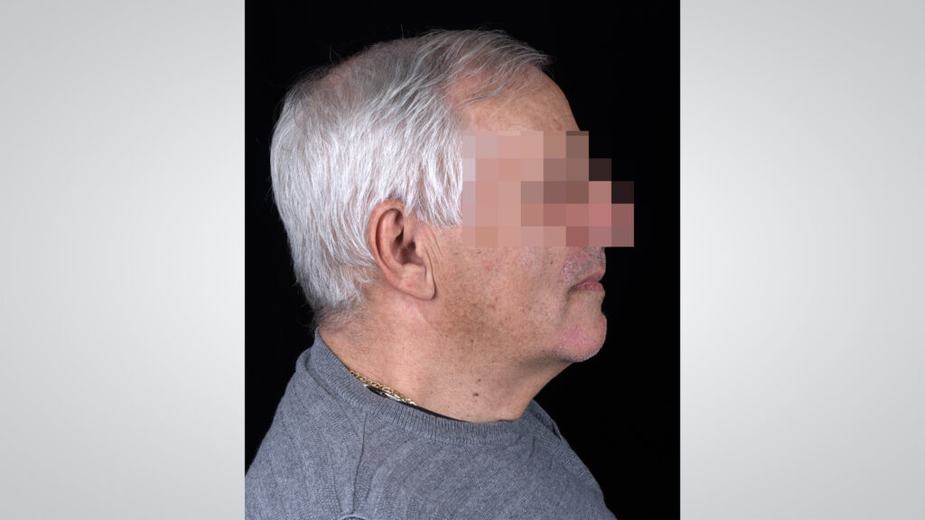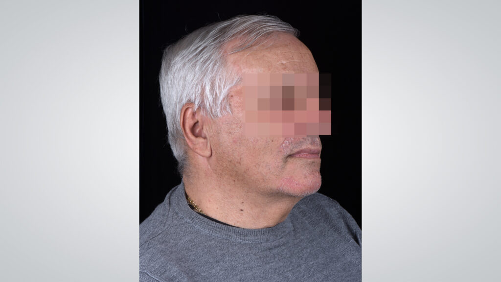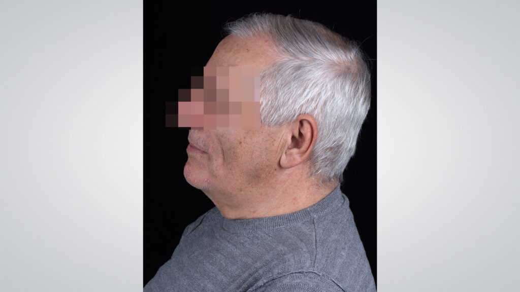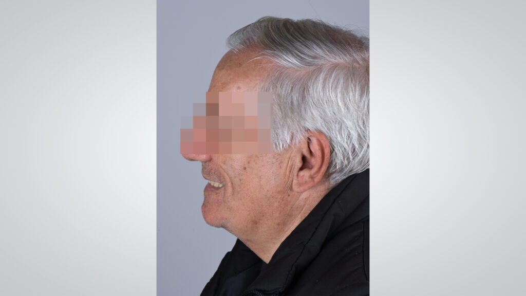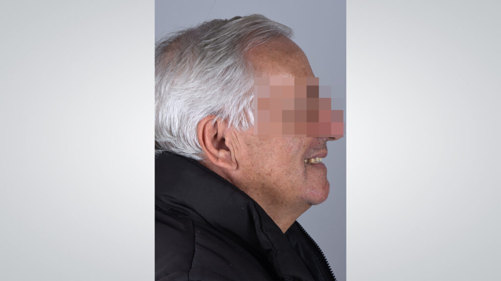34 - Die Gesichtszüge des Patienten zeigten sich mit eingegliederter Kieferrelationsbestimmung entspannt und Lippen sowie Wangen gut unterstützt.
