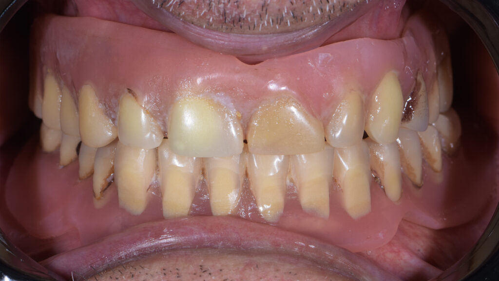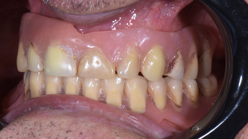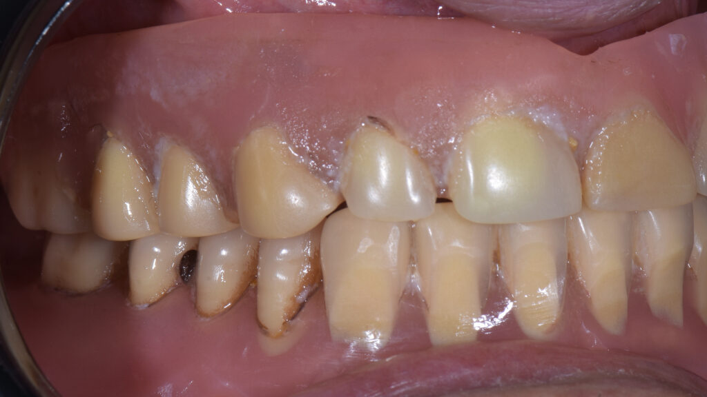 21 - Situation mit eingegliederten Altprothesen und Kieferkammsituation mit Halteelement im Oberkiefer. Beide Prothesen waren mehrfach erweitert und umgebaut worden.