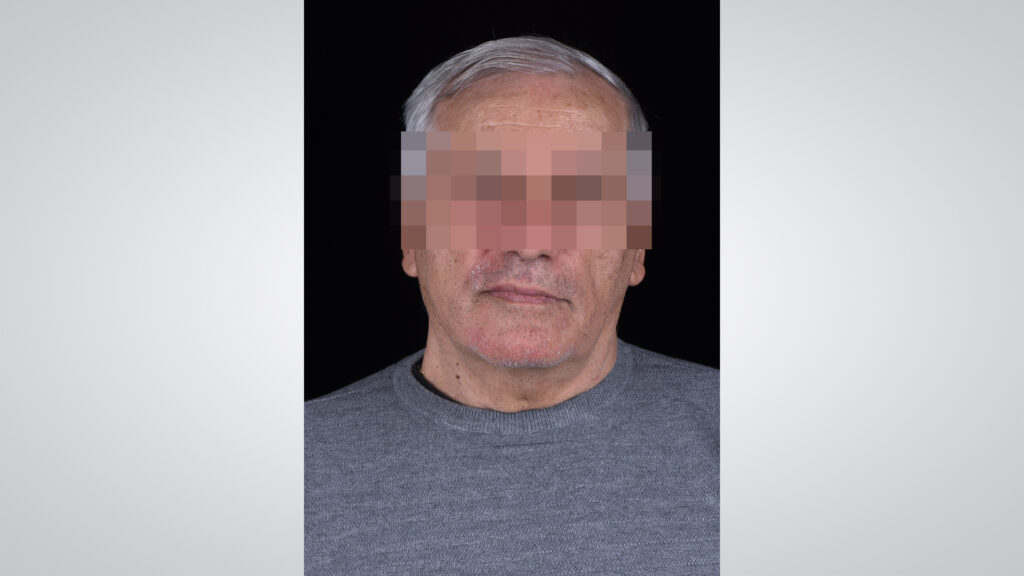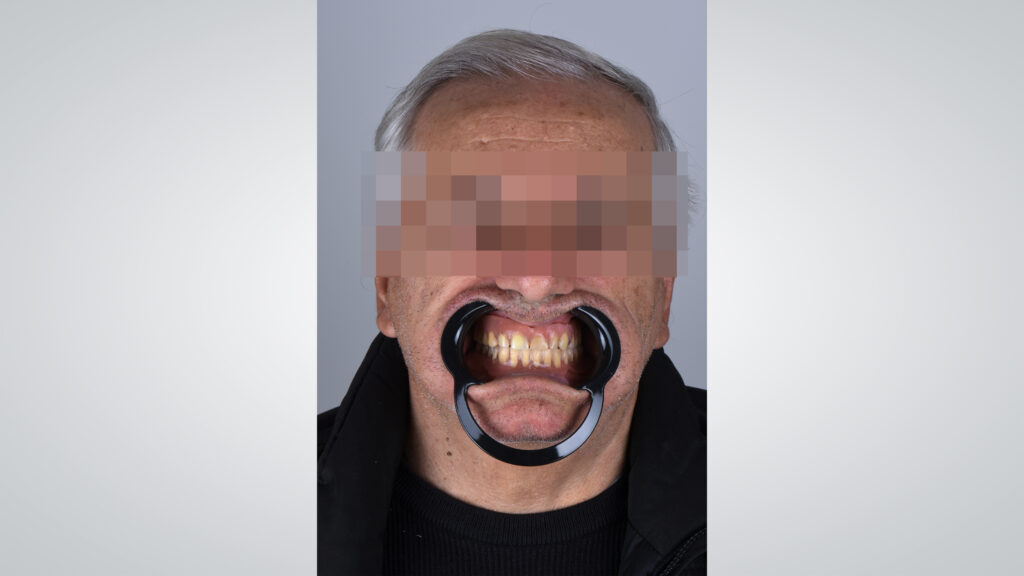 05 - Ein 73-jähriger Patient wurde in der Praxis vorstellig, weil er mit dem Sitz seiner totalprothetischen Versorgung unzufrieden war. Ausgangssituation mit geschlossenem Mund.