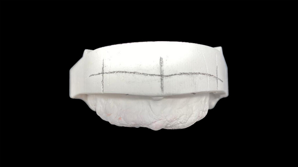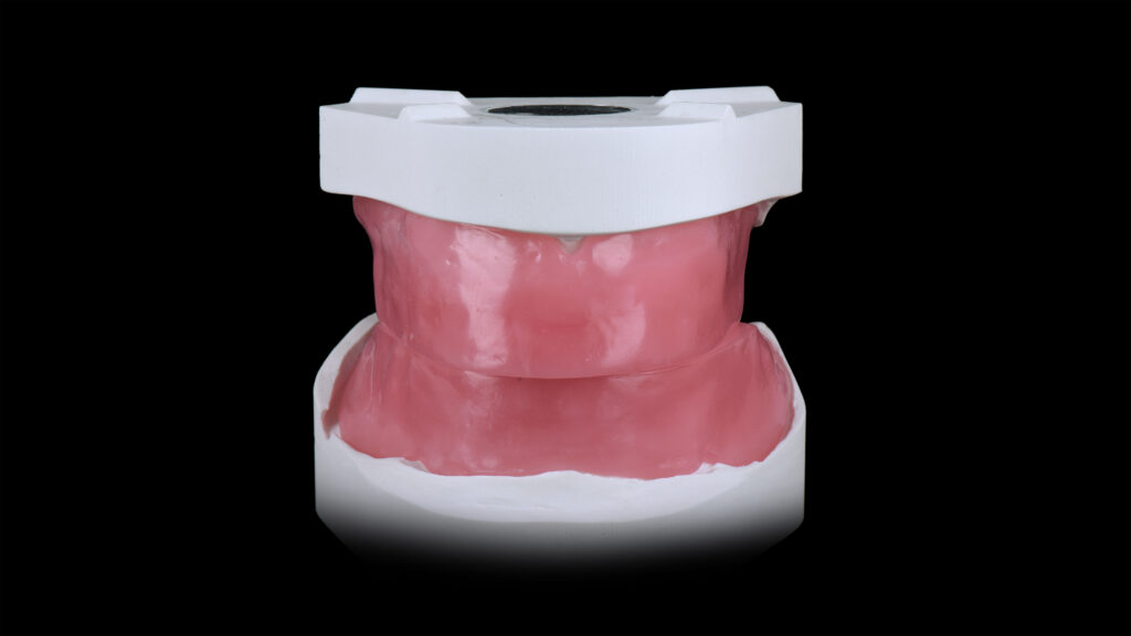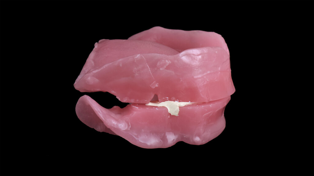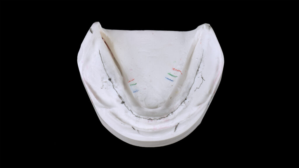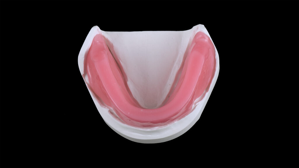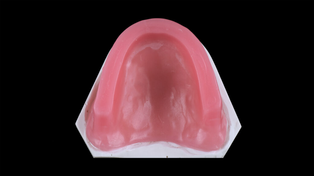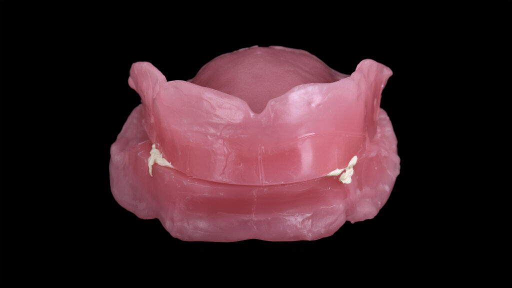 25 - Der palatinale und linguale Anteil der Wachswallfront wurde reduziert, um der Zunge mehr Platz zu geben und dem Patienten das Sprechen zu erleichtern.
