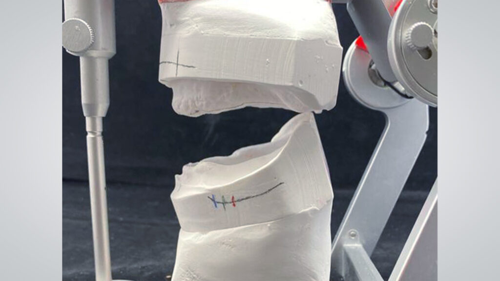 31 - Nach Ausrichtung der Wachswälle und Einstellung der vertikalen Höhe wurden die Wachswälle über retentive Einkerbungen miteinander verschlüsselt.
