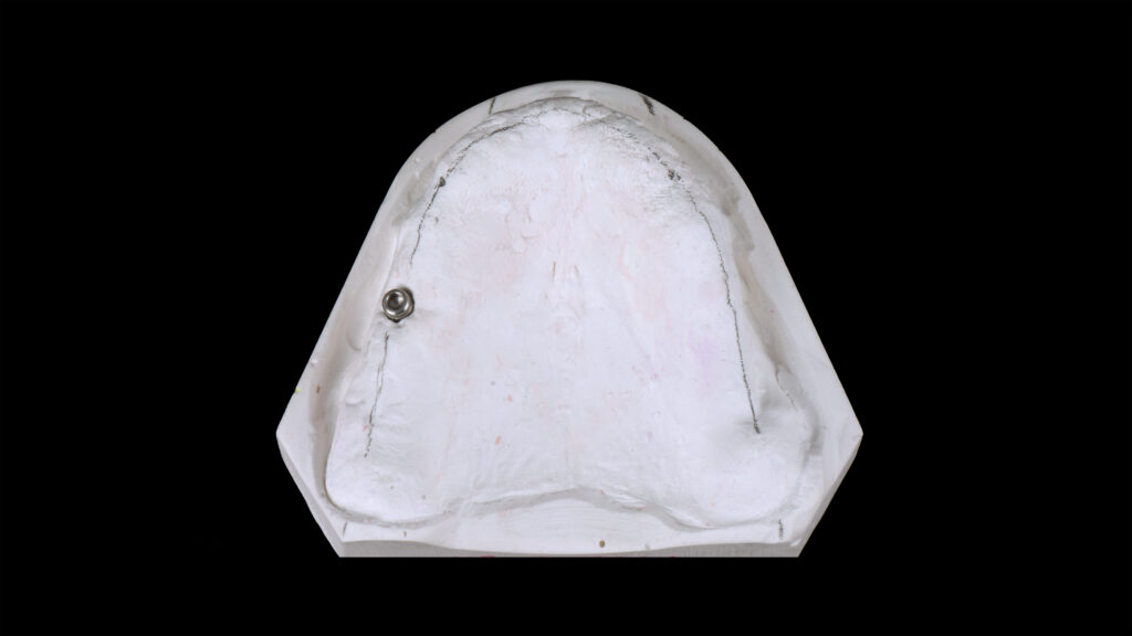 26 - Der palatinale und linguale Anteil der Wachswallfront wurde reduziert, um der Zunge mehr Platz zu geben und dem Patienten das Sprechen zu erleichtern.