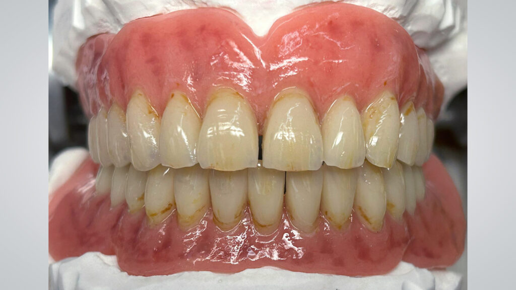 54 - Die fertig ausgearbeitete und polierte totalprothetische Arbeit präsentierte sich schon extraoral absolut natürlich.