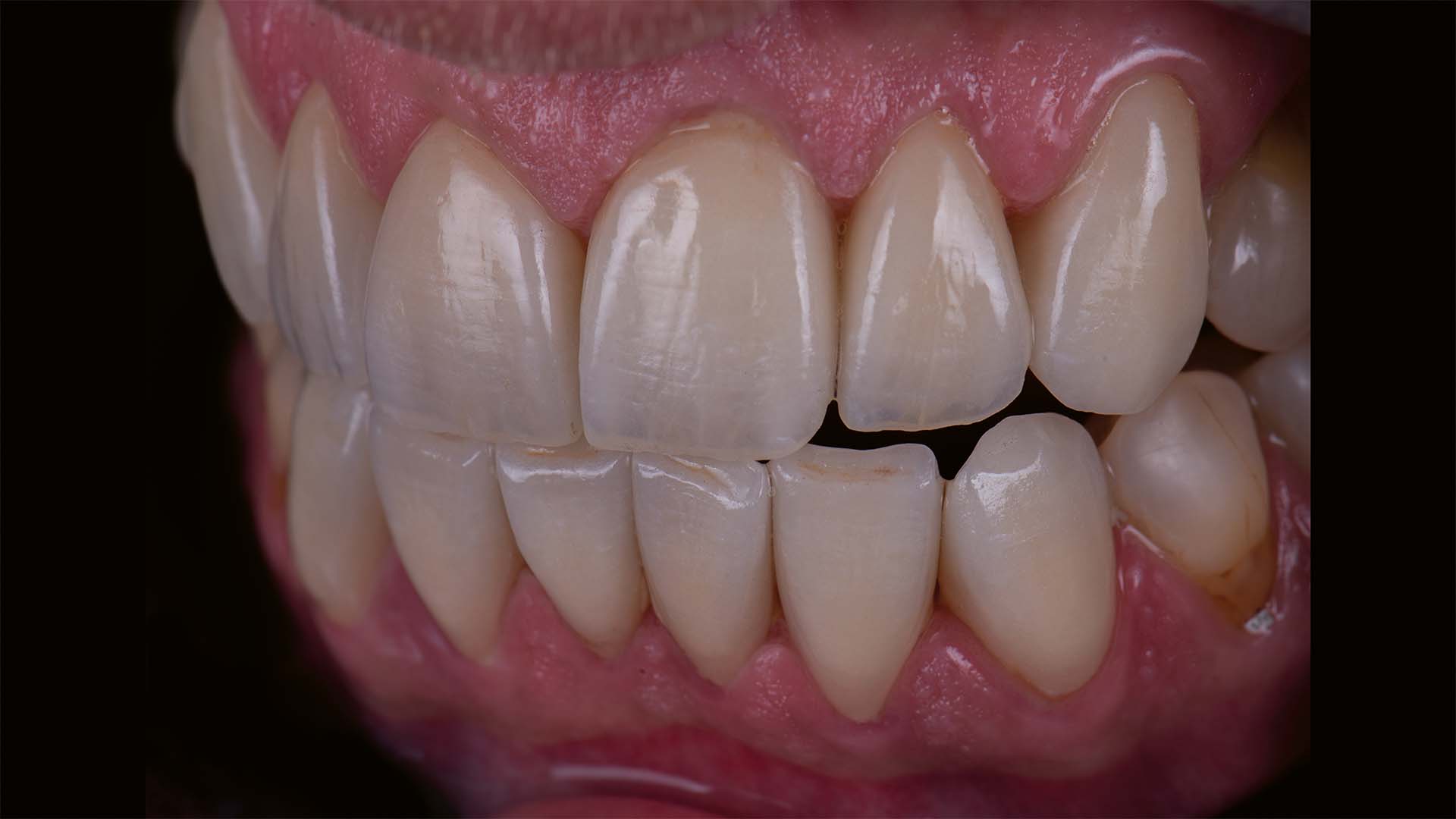 Durch das Kombinieren von gepressten Veneer-Gerüsten aus Lithiumdisilikat-Keramik (zum Beispiel Amber Press, HASS Bio) mit dem Auftragen einer dünnen Schicht an Verblendkeramik (IPS e.max Ceram, Ivoclar) erzielten wir im gezeigten Fall lichtoptische Eigenschaften, die aus unserer Sicht überzeugend sind und für sich sprechen. Durch die chromatische, leicht opaleszierende Wirkung der Amber-Keramik entsteht eine Lebendigkeit, die natürlich schönen Zähnen entspricht – unaufdringlich schön.