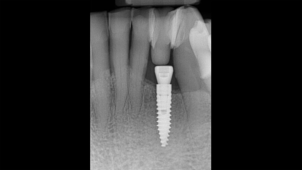 01 - Röntgenbild mit inseriertem Implantat regio 32 und provisorischer Versorgung mit der natürlichen Zahnkrone