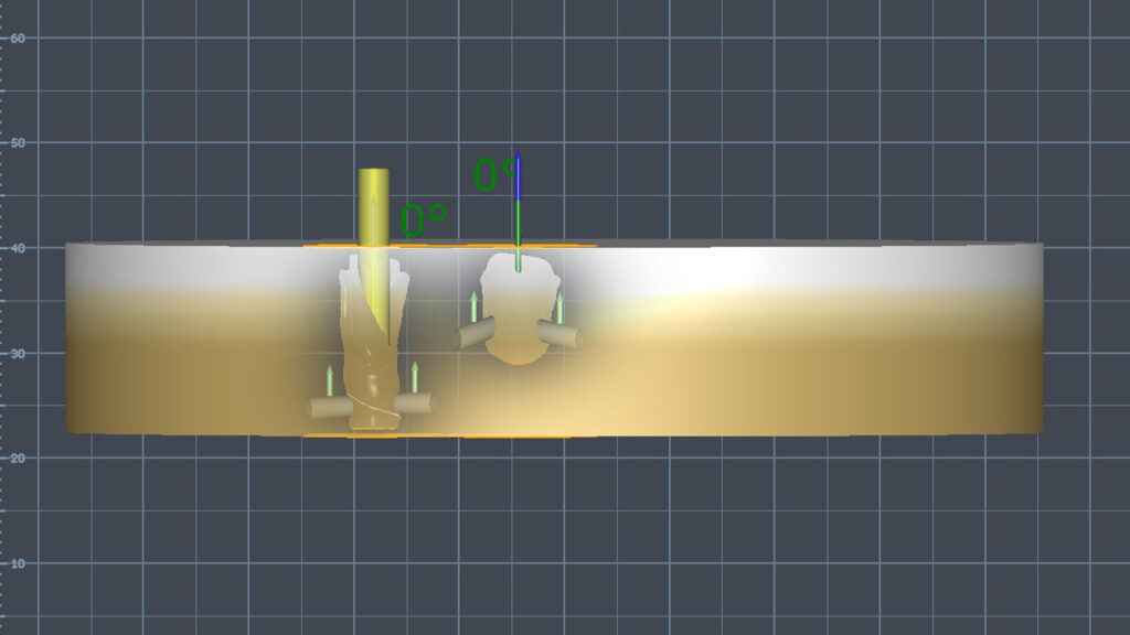 07 - Nesting der beiden Bauteile (Implantatkrone und Veneer) im mehrschichtigen Blank entsprechend den spezifischen Anforderungen an das Zirkonoxid (hohe Festigkeit im unteren Bereich und hohe Festigkeit sowie Transluzenz im Inzisalbereich)