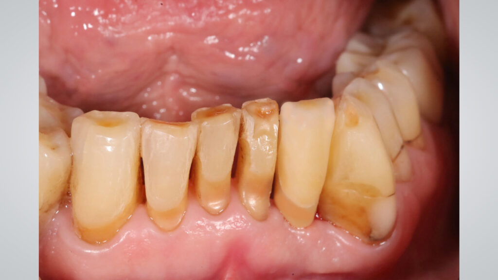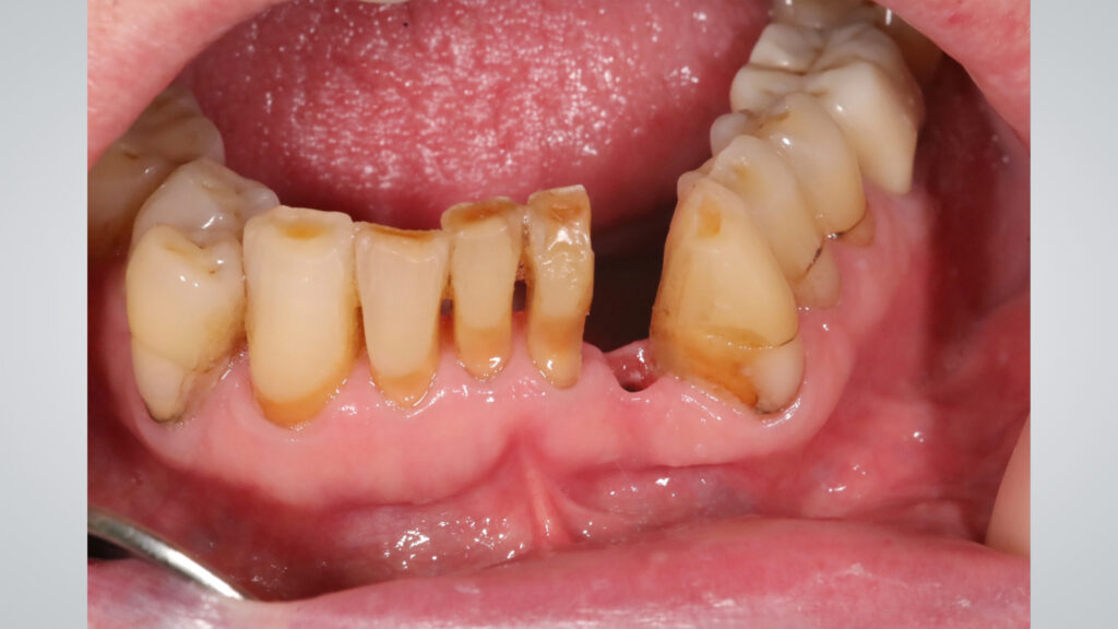 Zahntechnische Herausforderung Die Lücke zwischen den Zähnen 31 und 33 war zu schmal, um ein individuelles Abutment und eine Krone zu integrieren (Abb. 2). Auch eine okklusal verschraubte Restauration stellte keine optimale Lösung dar, da es keine Titanklebebasis für die abgewinkelten Schraubenkanäle gibt. Somit wäre der Schraubenkanal von vestibulär sichtbar gewesen wäre, was aus ästhetischen Gründen nicht akzeptabel ist (Abb. 3 und 4).
