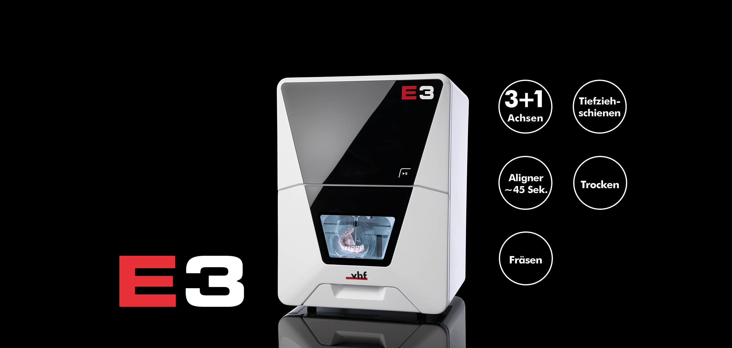 Die E3 ist eine sehr kompakte Fräsmaschine aus der neuen EASE CLASS, die vhf speziell für das Austrennen verschiedenster Formen von Tiefziehschienen wie Alignern, Aufbissschienen, Knirscherschienen und weiteren Varianten bis hin zum Sportmundschutz entwickelt hat. Die von vhf eigens für diesen Zweck entwickelte Software TRIMCAM erkennt die sogenannte Trimline, an welcher die Schiene später ausgefräst wird, automatisch aus den vorliegenden Planungsdaten. Die Fixierung des Werkstücks in der E3 erfolgt schnell und ohne Werkzeug: Dazu wird die Schiene einfach in die Halterung eingeklipst. Anschließend wird beispielsweise ein Aligner in durchschnittlich 45 Sekunden ausgefräst, so dass ganze Serien in kürzester Zeit erstellt werden können. Dabei profitiert der Anwender von der hohen Qualität der CNC-Fertigung. Es fällt praktisch keine Nacharbeit an. Dank ihrer vollständigen Druckluftfreiheit, ihres kompakten Gehäuses, das nur unwesentlich mehr Stellfläche als ein A3-Blatt benötigt, und ihres geringen Gewichts von nur 25 kg kann die E3 praktisch überall aufgestellt und betrieben werden.