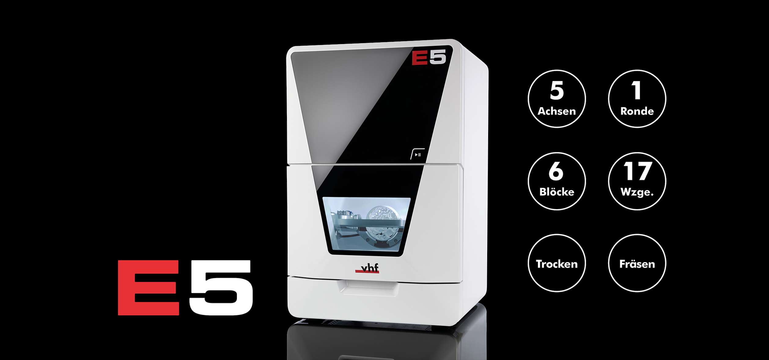 Die E5 von vhf ist eine Trockenfräsmaschine für Ronden, die dank ihrer fünf Achsen auch komplexe Indikationen mit höchster Präzision meistert. Als Teil der EASE CLASS arbeitet die E5 komplett druckluftfrei und wiegt nur 47 kg. Dies ermöglicht sowohl einen kostengünstigen Betrieb als auch maximale Freiheit bei der Wahl des Aufstellortes. Realisiert hat vhf dies durch sein zum Patent angemeldetes und mit dem German Innovation Award ausgezeichnetes AIRTOOL. Das Spezialwerkzeug erzeugt mittels Turbinenschaufeln einen Luftstrom, der das Werkstück während des Fräsens frei von Spänen hält. Zudem punktet die E5 durch Servicefreundlichkeit und eine einfache Handhabung. Kompromisslos aus hochwertigen Industriekomponenten aufgebaut, sorgt sie für einen zuverlässigen Betrieb und stellt sicher, dass sich fast alle in der Dentaltechnik für die Trockenbearbeitung relevanten Materialien bearbeiten lassen.