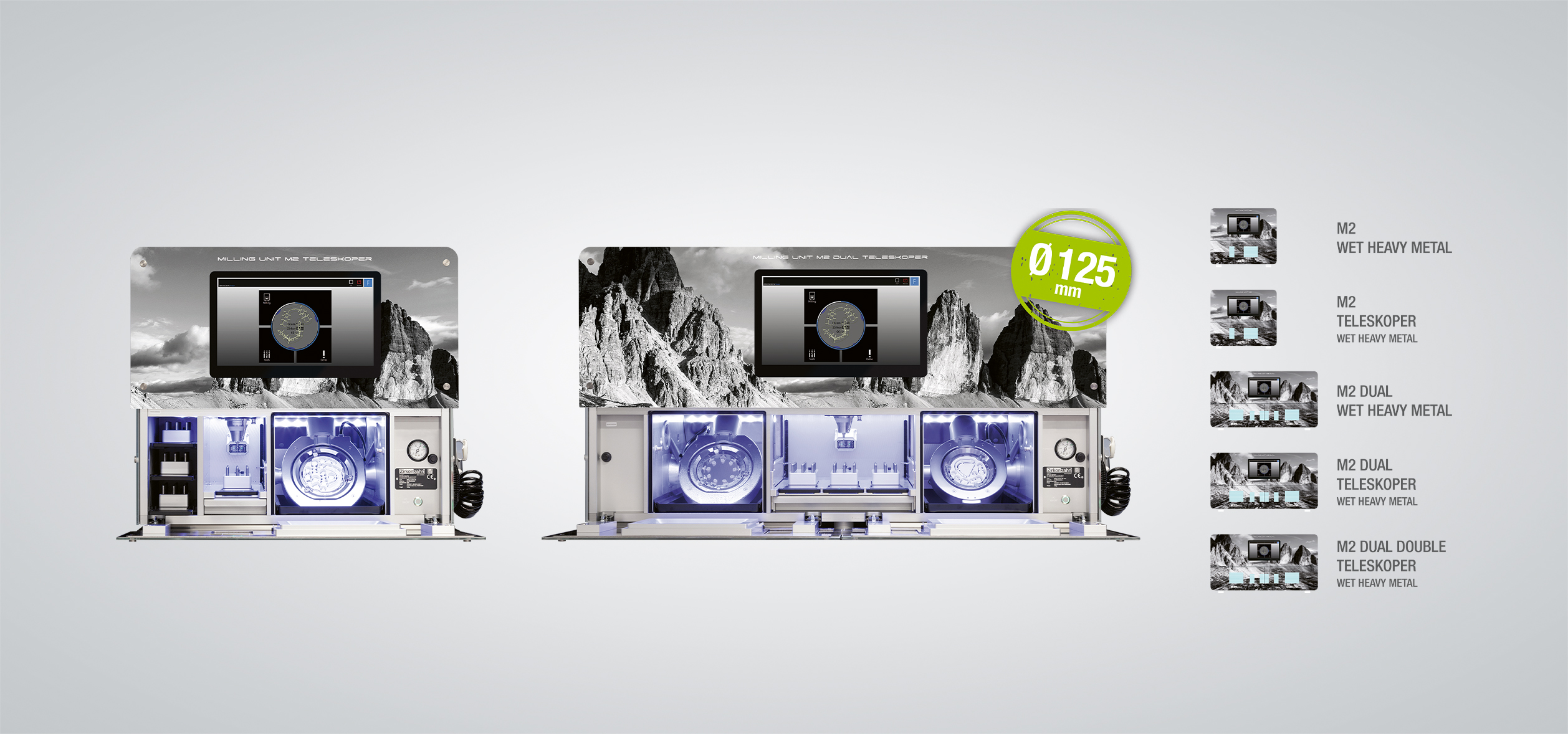 Die offene Fräsgerät-Komfortlinie M2 steht für modernen Bedienkomfort und Flexibilität. Sie umfasst 5 Fräsmaschinen mit vollautomatischer 5+1-Achsen-Simultan-Frästechnologie. Das Highlight im Hinblick auf die Flexibilität ist der extragroße Teleskoper Orbit (Ø 125 mm). In Kombination mit speziellen Haltern können damit alle gängigen weichen und harten Dentalmaterialblanks mit einem Ø von 95 mm, 98 mm, 106 mm und sogar 125 mm bearbeitet werden. Die Blanks lassen sich aus dem Orbit entnehmen und später wieder im Mikrometerbereich an derselben Stelle im Orbit einsetzen. Alle M2-Fräsgeräte sind Stand-Alone-Lösungen: über den integrierten PC mit Touchscreen lassen sich Kalibrier- und Fräsvorgänge direkt am Fräsgerät starten und Bearbeitungswerkzeuge laden. Die optische Werkzeugerkennung sorgt für mehr Sicherheit beim Fräsen. Die M2 Dual Fräsgeräte besitzen zwei getrennte Fräskammern. Außerdem verfügen alle Fräsgeräte über eine vor Verunreinigung geschützte Werkzeugkammer mit automatischem bis zu 3x21-fachem Werkzeugwechsler. Die automatische Selbstreinigungsfunktion, das Cleaning Kit und der Ioniser (optional) sorgen in den Fräsgeräten der Linie für eine einfache Reinigung und einen sauberen Bearbeitungsprozess.