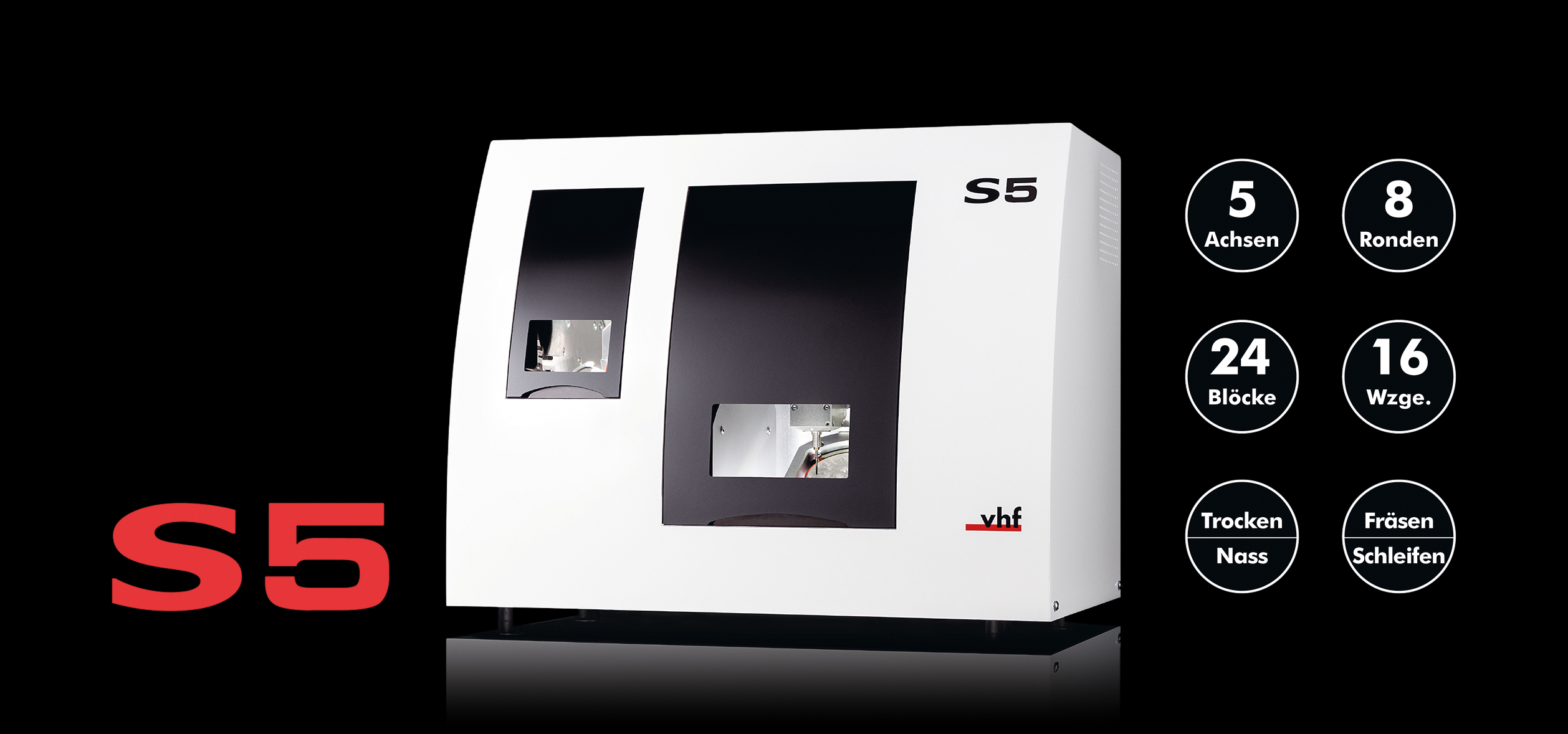 Die S5 ist eine hoch automatisierte Fräs- und Schleifmaschine. Dank eines 8-fach-Rondenwechslers sowie eines 16-fach-Werkzeugwechslers profitiert man bei dieser PERFORMANCE CLASS-Maschine von Hochleistung ohne Pause. Die Wiederholgenauigkeit von 3μm sorgt dabei für stets erstklassige Ergebnisse und die zweite Drehachse (B-Achse) mit ihrem Neigungswinkel von bis zu ± 30 Grad ermöglicht auch das präzise Fräsen von Hinterschnitten. Die drei integrierten Ionisatoren vermindern den Reinigungsaufwand der S5 erheblich, da sie die statische Ladung von Kunststoffspänen wie die von PMMA weitestgehend neutralisieren. Die hohe Maschinensteifigkeit sowie die kraftvolle Spindel ermöglichen auch die Bearbeitung von Metallen. Mit der separaten Nassschleifoption eignet sich die S5 zusätzlich zur Nassbearbeitung von Glaskeramik oder Titan.