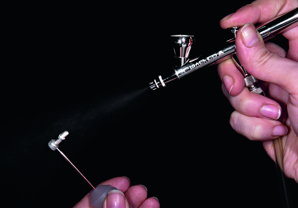 Das Abscheiden des Sekundärgerüsts auf die Primärkrone (zum Beispiel aus CoCr oder ZrO2) erfolgt direkt auf die mit Leitsilberlack bedeckte Oberfläche. Das Galvanisierungsverfahren selbst beruht auf der Elektrolyse. Grundbaustein ist eine Elektrolysezelle, die sich aus einer Anode (positiver Pol), einer Kathode (negativer Pol) und dem Elektrolyten (optisch glasklares Bad) zusammensetzt (Abb. 5). Die Anode besteht aus einem platinüberzogenen Titanstäbchen. An der Kathode befindet sich das zu galvanisierende Objekt, beispielsweise die mit Leitsilberlack benetzte Primärkrone (Abb. 6 und 7). Der Lack auf der zu galvanisierenden Fläche stellt die Leitfähigkeit als Voraussetzung für das Abscheiden der Metallionen her (Abb. 8 und 9). Während des Galvanisierungsprozesses ist das Objekt vollständig vom Elektrolyt umgeben. Der Stromfluss für die Ionenabgabe wird über verschiedene Salze erreicht (Abb. 10 bis 12). Zudem sind im Galvanobad pH-Puffer, Stabilisatoren und Glanzbildner-Zusätze vorhanden. Der Glanzzusatz steuert den Aufbau einer gleichmäßigen Goldschicht. Der Abscheidungsvorgang wird von einem Mikroprozessor gesteuert.