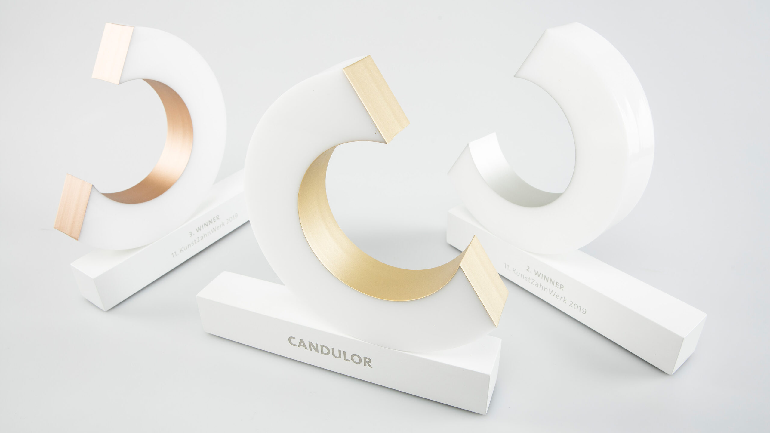 Die Trophäen für die Sieger des Candulor KunstZahnWerk Wettbewerbs 2023.