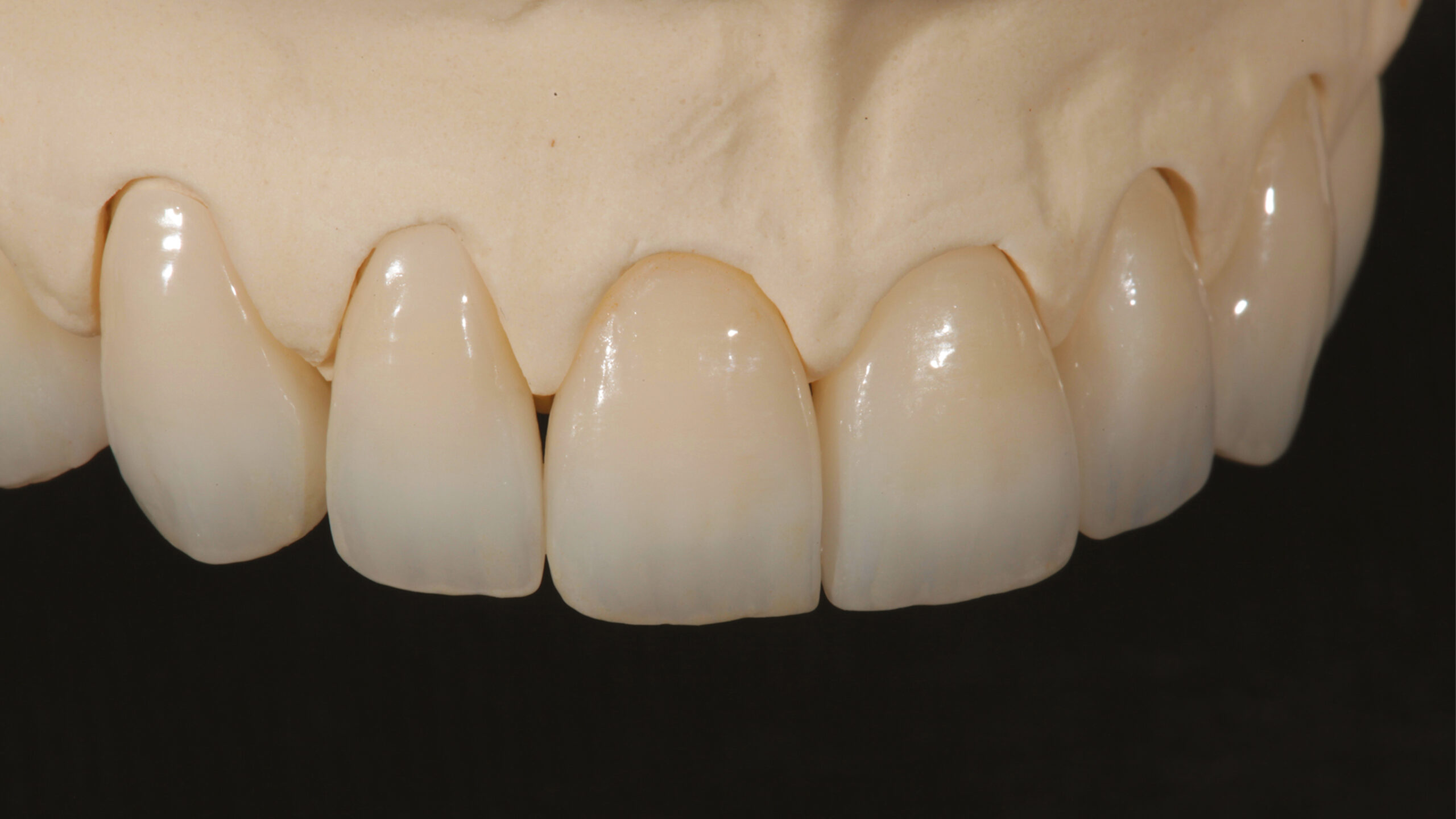 Alle klinischen Informationen, das Wax-up und das Modell der provisorischen Versorgungen wurden an das Labor weitergeleitet. Dort wurde ein analoges Modell der Provisorien angefertigt. Das Modell wurde gescannt und die virtuellen Daten zur Auswahl der idealen Zahnformen aus der Softwarebibliothek genutzt. Anschließend wurde ein digitales Wax-up für die voll‧anatomischen Restaurationen aus IPS e.max ZirCAD Prime (Abb. 4) entworfen. Insbesondere die Farbabstufung der IPS e.max ZirCAD Prime Disc erleichterte die effiziente Herstellung der Frontzahnrestaurationen. Beim Farbton A2, 20 mm, wird die Farbe in der Nähe der A1 abgestuft. Die Disc präsentiert auch eine gewisse inzisal ansteigende Transluzenz (Abb. 5). Sobald der Entwurf fertiggestellt war, wurde ein Modell der Präparate gedruckt, um die Restaurationen nach dem Fräsen zu testen. Nachdem die Passgenauigkeit, die Kontakte und die Form bestätigt worden waren, wurden die Restaurationen gefräst. Nach dem Fräsen (Abb. 6) wurde gesintert (Abb. 7). Das Sintern wurde in diesem Fall früher durchgeführt, um die Eigenfarbe und die Abstufungen der Materialscheibe zu unterstützen. Nach der Sinterung wurden die Kontakte und die Okklusion angepasst und auf dem gedruckten Modell überprüft (Abb. 8). Anschließend wurde Ivocolor Dentin SD2 so dünn wie möglich im Halsbereich aufgetragen. Die Mamelons wurden mit einer Mischung aus Incisal SI1, E01 Weiß und Dentin SD2 supercolour im Bereich der Inzisalkanten hergestellt (Abb. 9). Zuletzt wurde Glasurpaste aufgetragen (Ivocolor Fluo Glasurpaste). Die Restaurationen wurden auf dem Modell platziert, um die Ästhetik zu überprüfen. Mit bloßem Auge erkennt man den stufenlosen Farbverlauf, und die sanften Schattierungen erschienen sehr natürlich (Abb. 10). Werden die Restaurationen von der palatinalen Seite beleuchtet, ist der Verlauf sehr deutlich zu erkennen (Abb. 11). Trotz der Verfärbung der Stümpfe (Abb. 12) sind hochästhetische Versorgungen entstanden, denn die IPS e.max ZirCAD Prime Restaurationen kaschieren die darunterliegende dunkle Farbe (Abb. 13 bis 16).