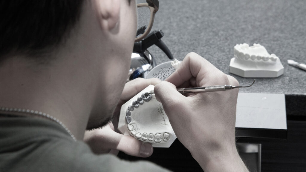 Neben der Leidenschaft benötigen Berufseinsteiger Führung, also Mentoren, die Orientierung geben und zeigen, was möglich ist; was man können sollte und wer man sein könnte. Das heißt, alle, die zu uns kommen, um zu lernen, sind begeistert, weil sie bei uns ein Gefühl dafür bekommen, wie es ist, wenn man seine Sache richtig gut macht. Wir haben neben Zahntechnikern auch ständig – meist junge – Zahnärzte bei uns, die eine dreimonatige praktische Ausbildung erhalten. Am Ende bekommt jeder Zahnarzt, der 1.000 Zähne im Ober- und Unterkiefer am Phantomkopf präpariert hat, das Dante-Alighieri-Diplom verliehen, denn erst dann beherrscht er das Präparieren blind. Das ist wie Klavierspielen. Hat man die Passage entsprechend oft geübt, kann man sie blind spielen.