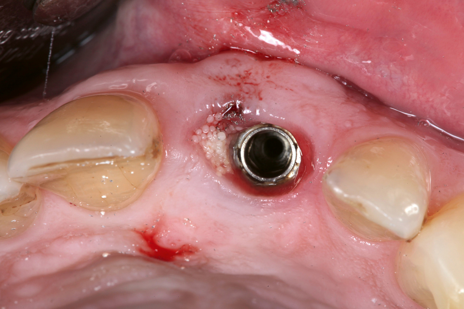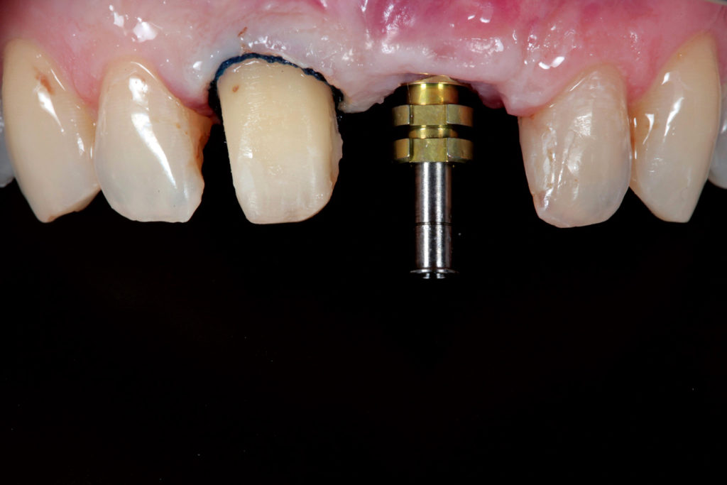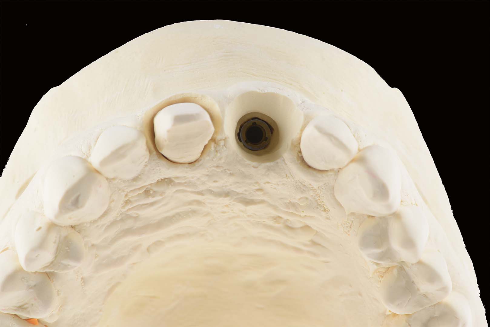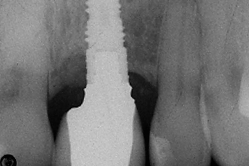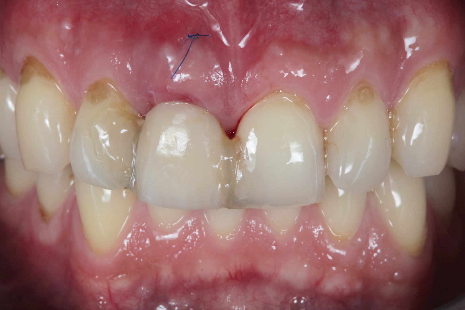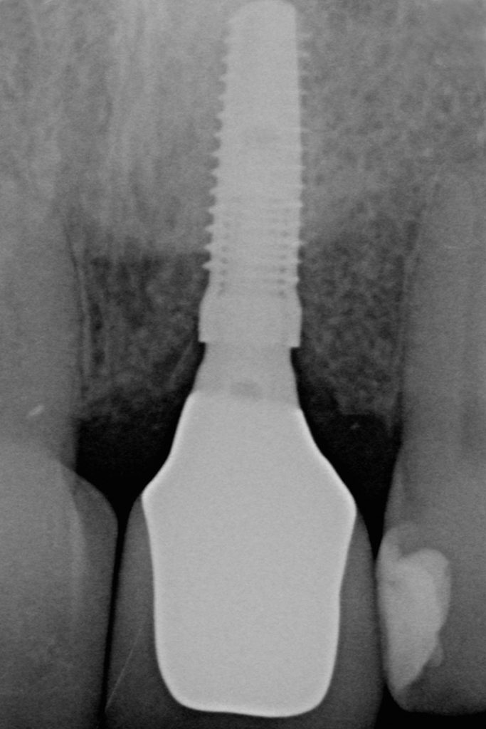 Nach der Explantation des Implantats regio 21 wurden in korrekter dreidimensionaler Position ein Implantat mit tiefer, konischer Verbindungsgeometrie und Indexierung inseriert und Hart- sowie Weichgewebe aufgebaut. Als Interimsersatz wurde der Patient während der Einheilphase mit einer provisorischen Klebebrücke versorgt (CoCr-Gerüst, mit Komposit verblendet).