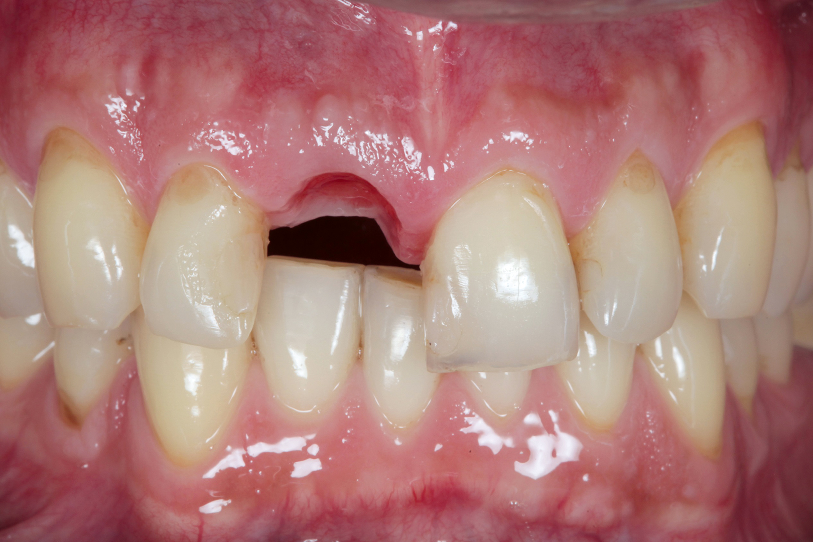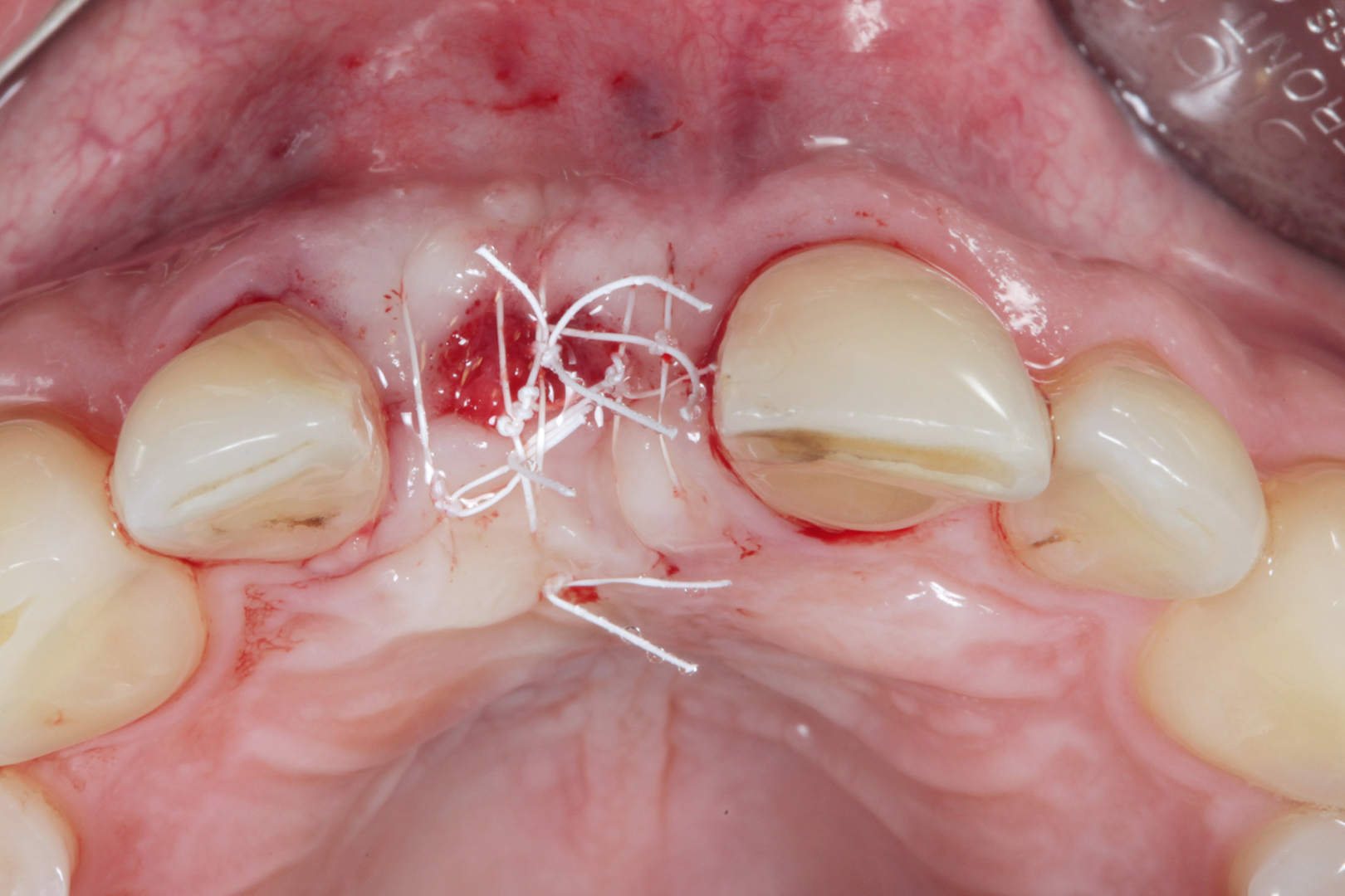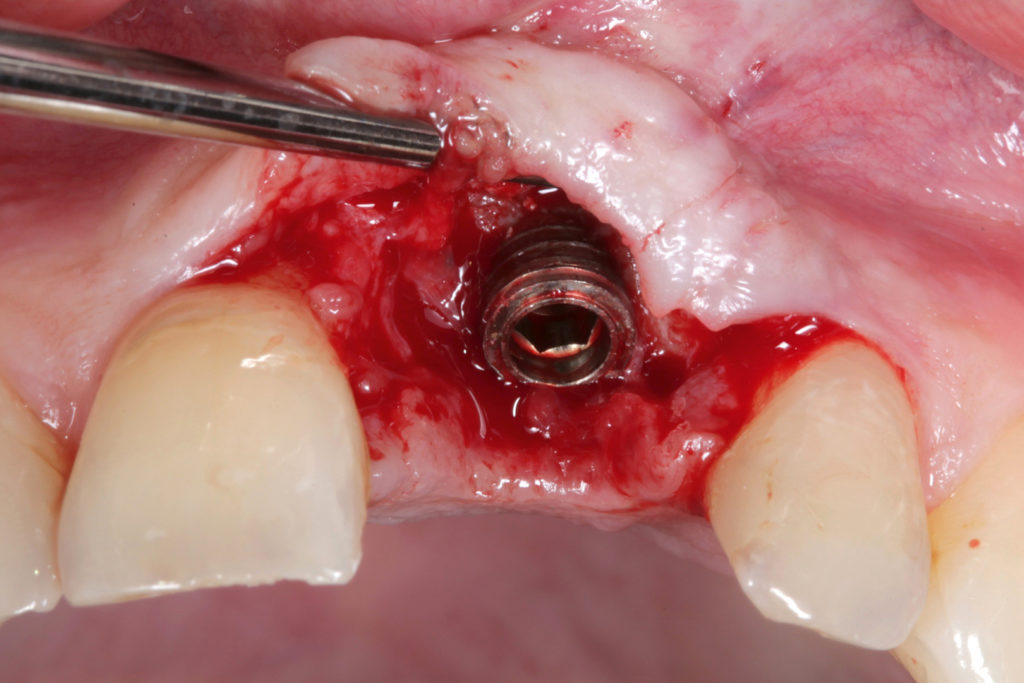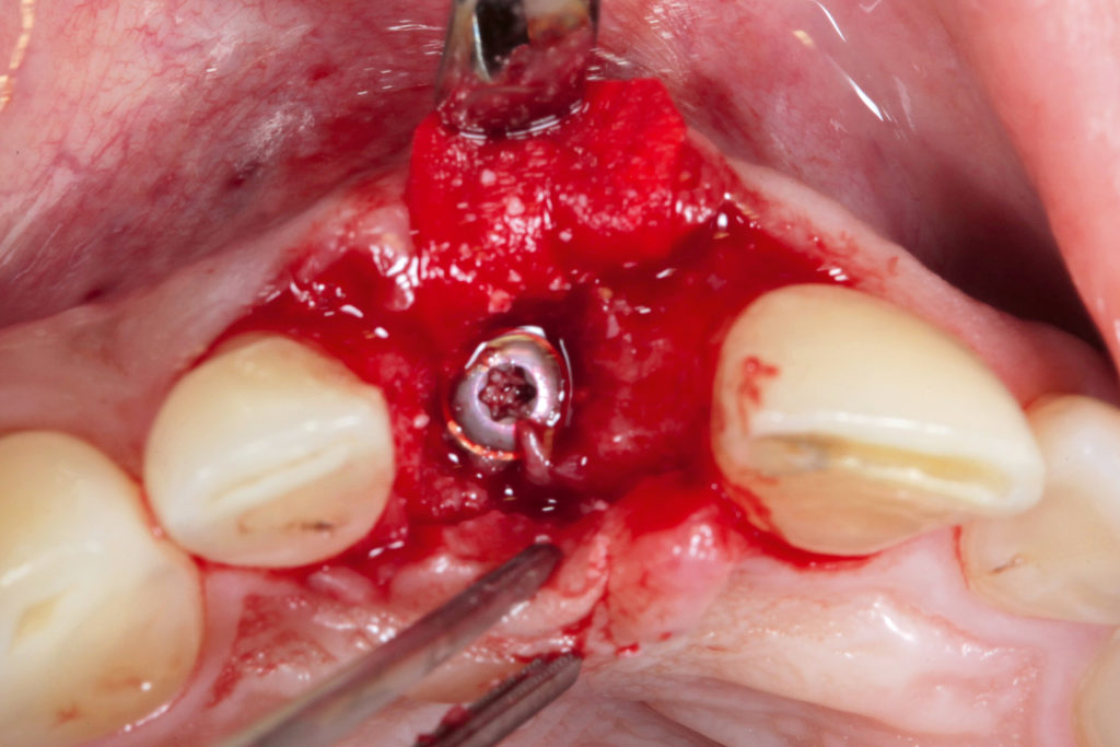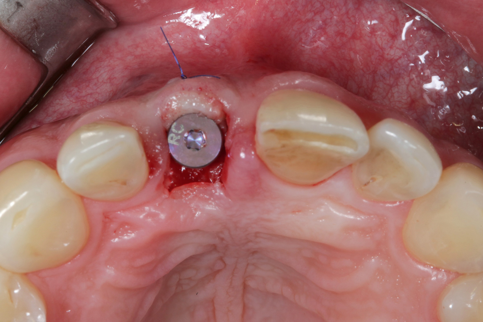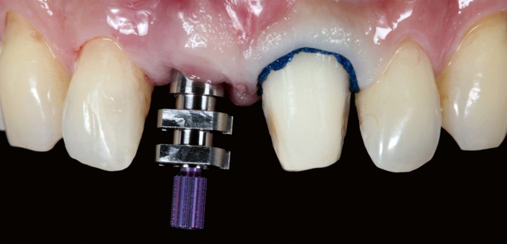 Nach der Explantation des Implantats regio 21 wurden in korrekter dreidimensionaler Position ein Implantat mit tiefer, konischer Verbindungsgeometrie und Indexierung inseriert und Hart- sowie Weichgewebe aufgebaut. Als Interimsersatz wurde der Patient während der Einheilphase mit einer provisorischen Klebebrücke versorgt (CoCr-Gerüst, mit Komposit verblendet).