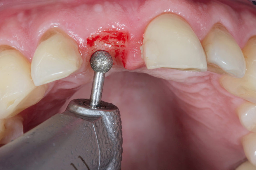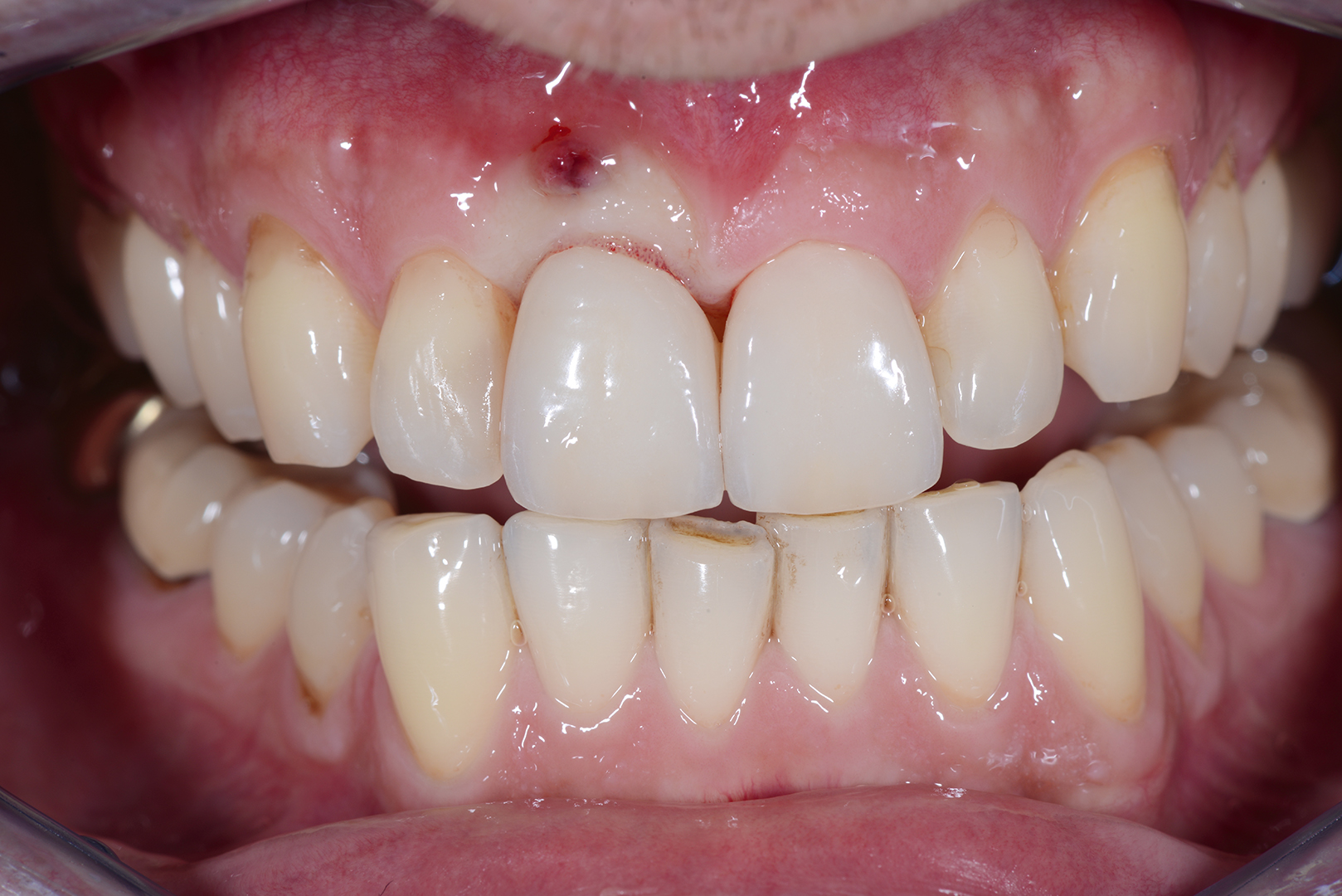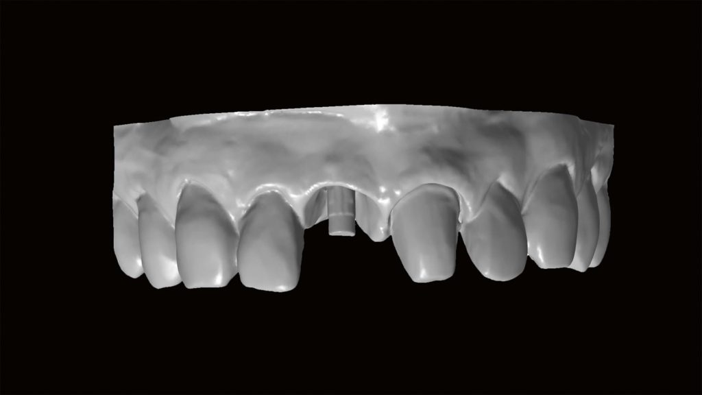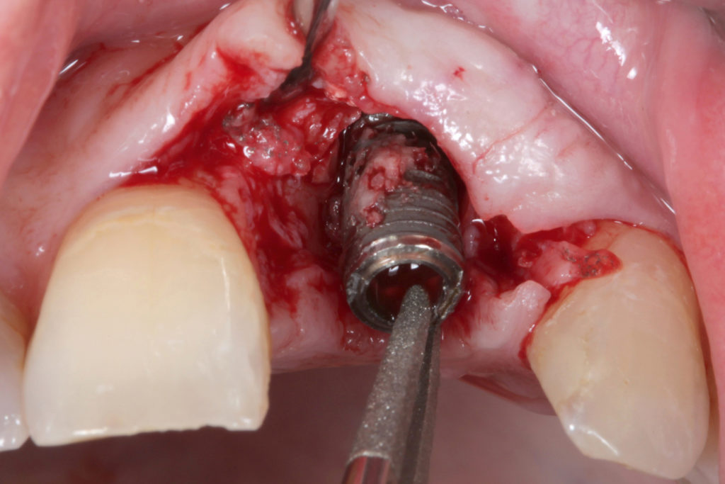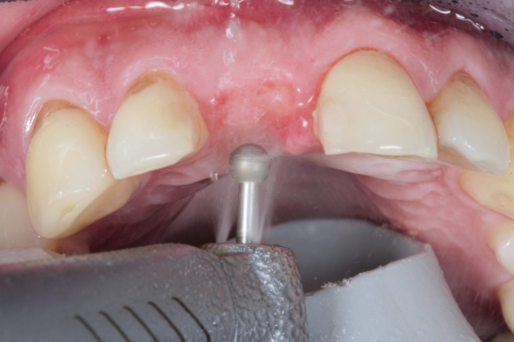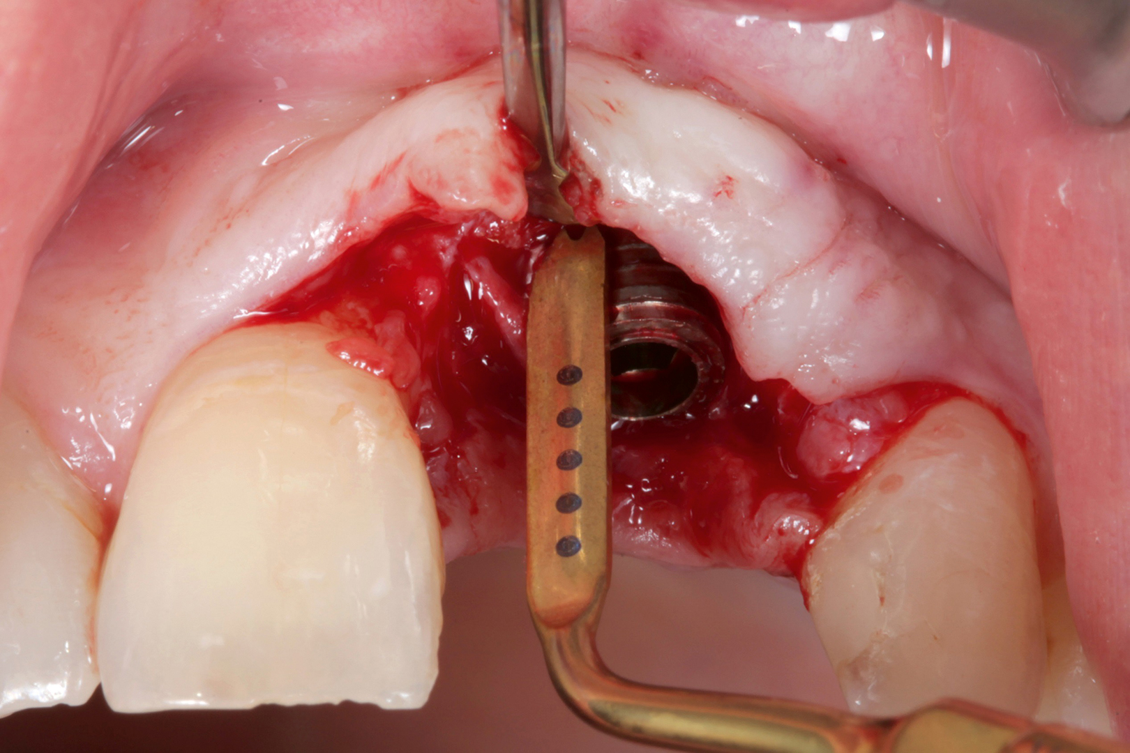 Nach der Explantation des Implantats regio 21 wurden in korrekter dreidimensionaler Position ein Implantat mit tiefer, konischer Verbindungsgeometrie und Indexierung inseriert und Hart- sowie Weichgewebe aufgebaut. Als Interimsersatz wurde der Patient während der Einheilphase mit einer provisorischen Klebebrücke versorgt (CoCr-Gerüst, mit Komposit verblendet).