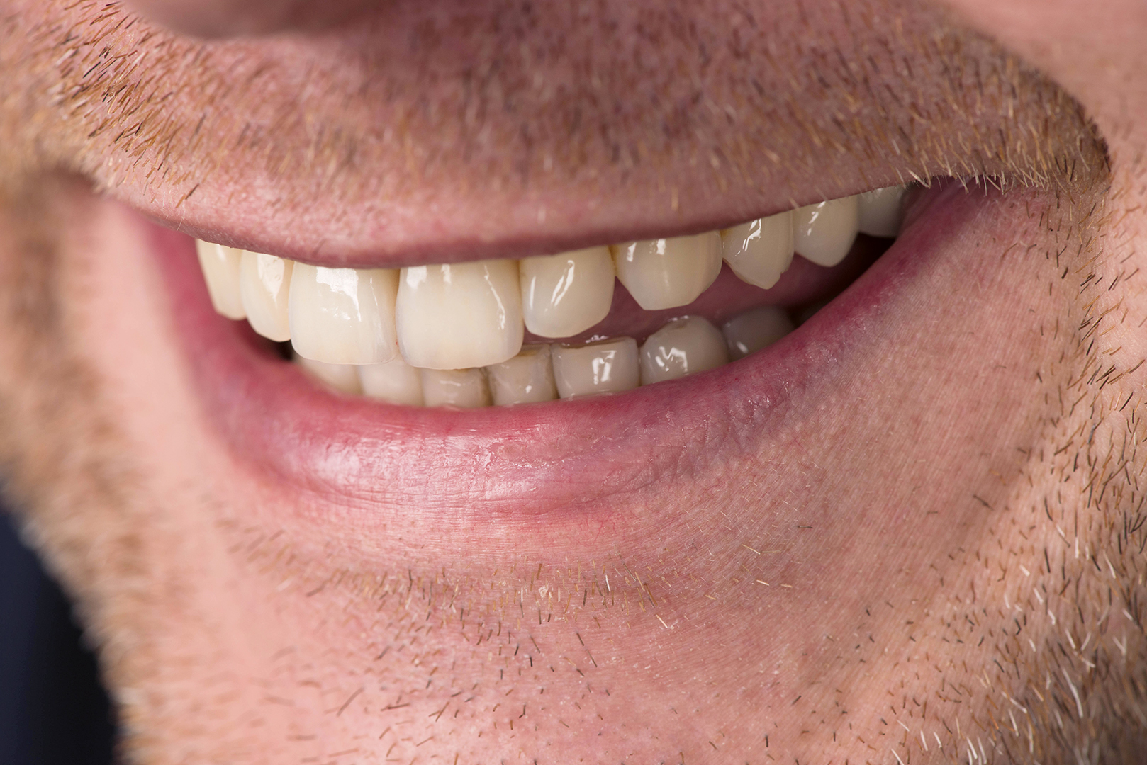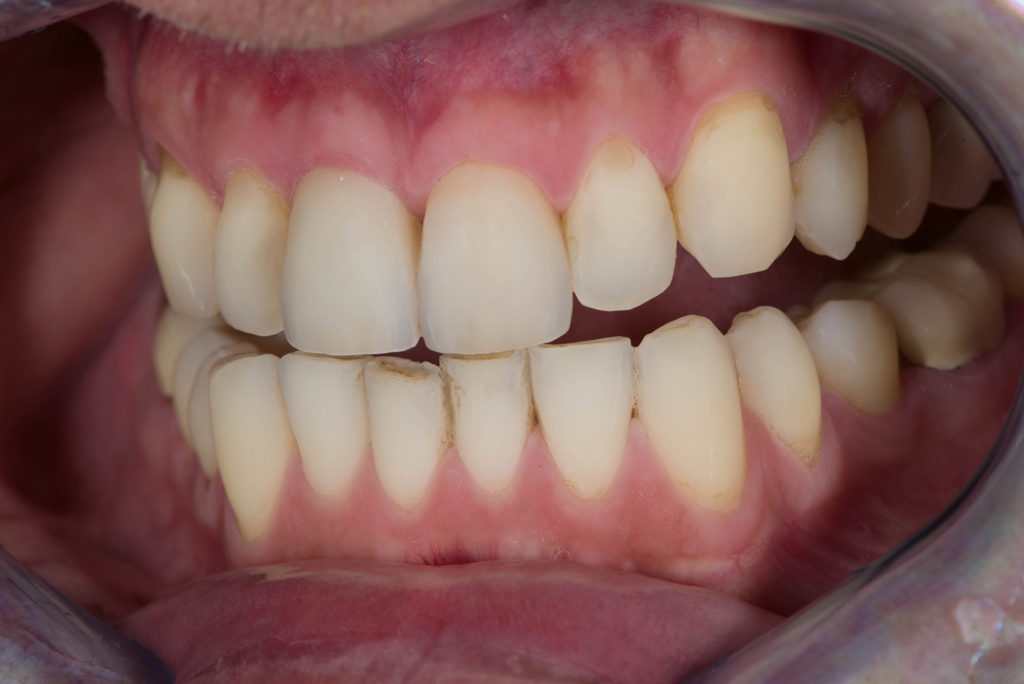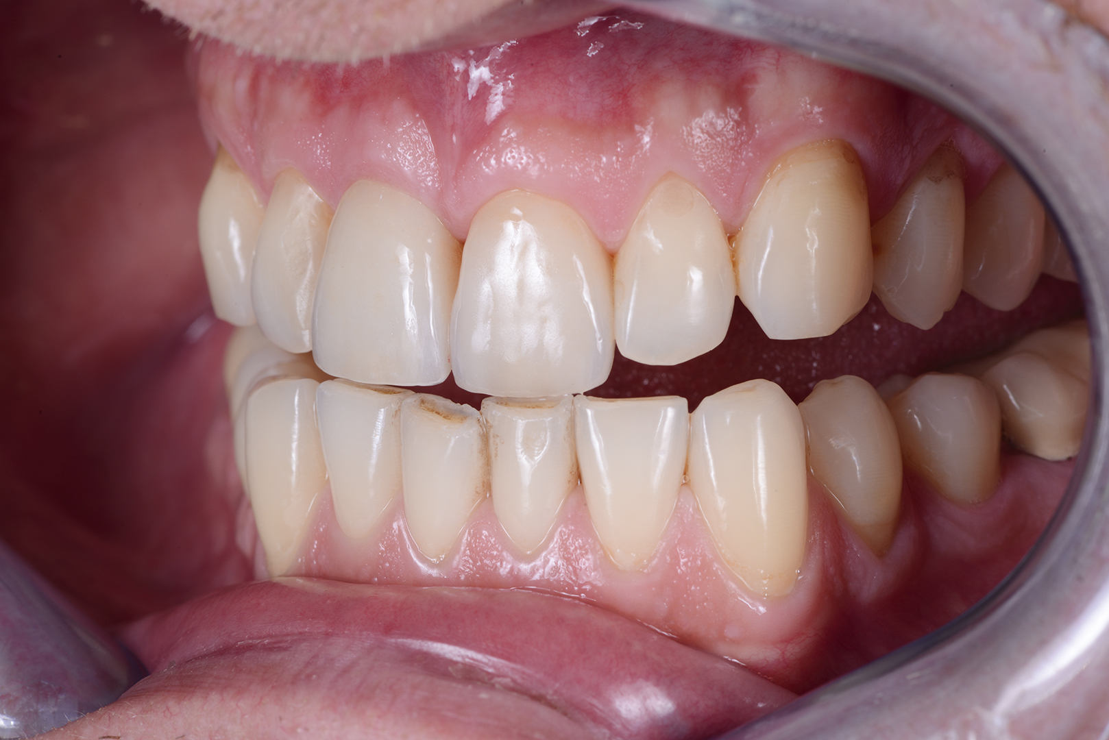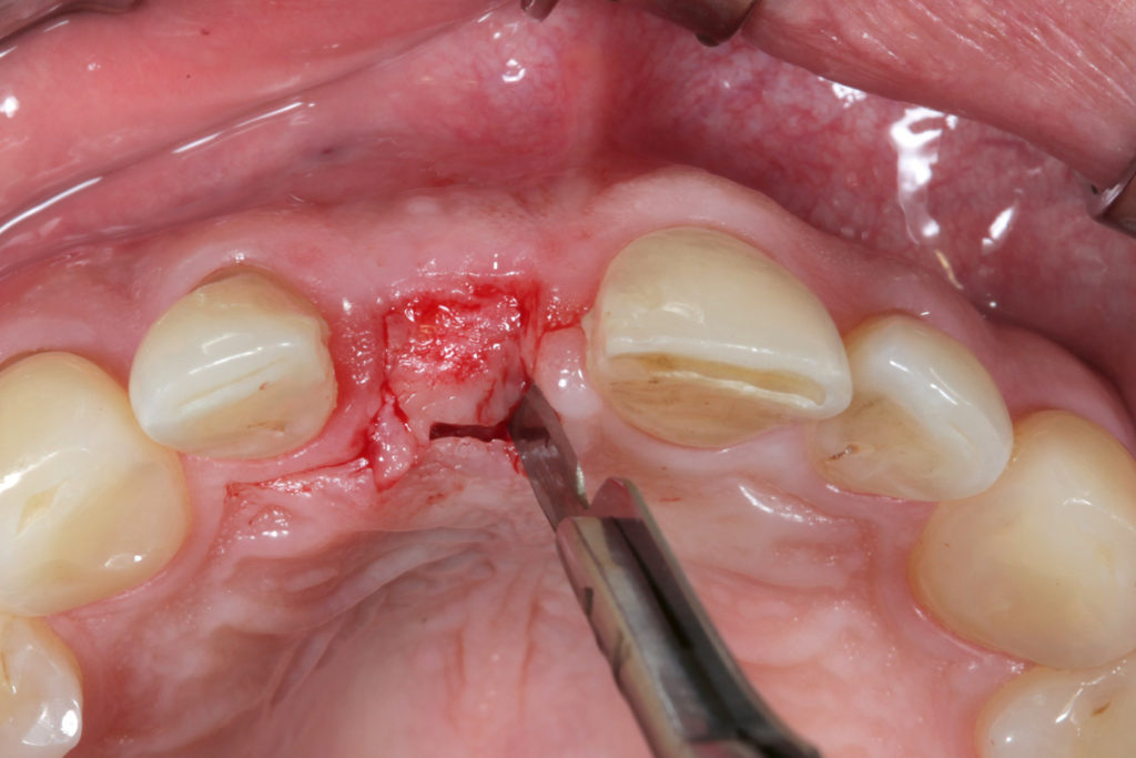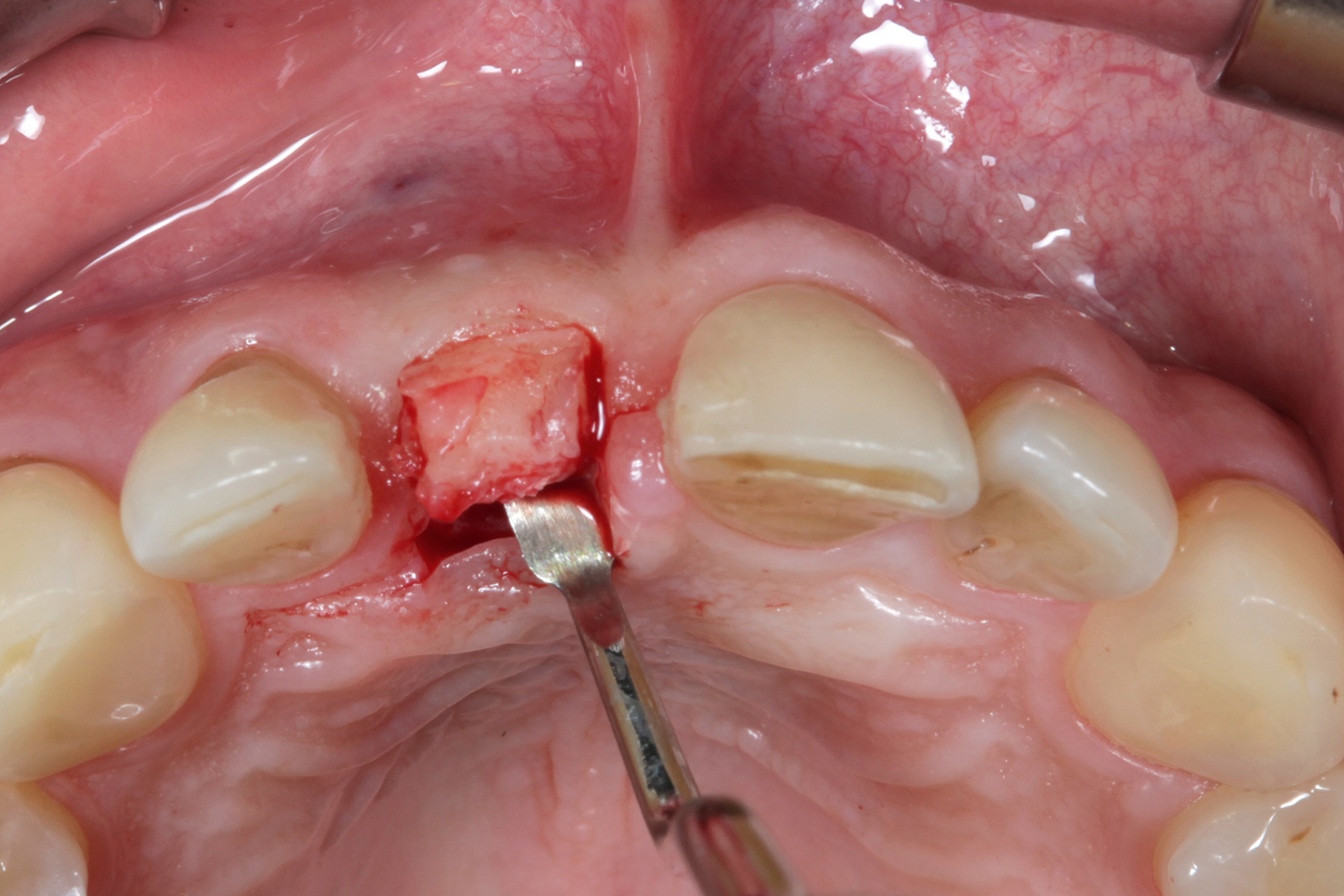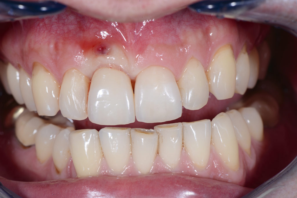 Nach der Explantation des Implantats regio 21 wurden in korrekter dreidimensionaler Position ein Implantat mit tiefer, konischer Verbindungsgeometrie und Indexierung inseriert und Hart- sowie Weichgewebe aufgebaut. Als Interimsersatz wurde der Patient während der Einheilphase mit einer provisorischen Klebebrücke versorgt (CoCr-Gerüst, mit Komposit verblendet).