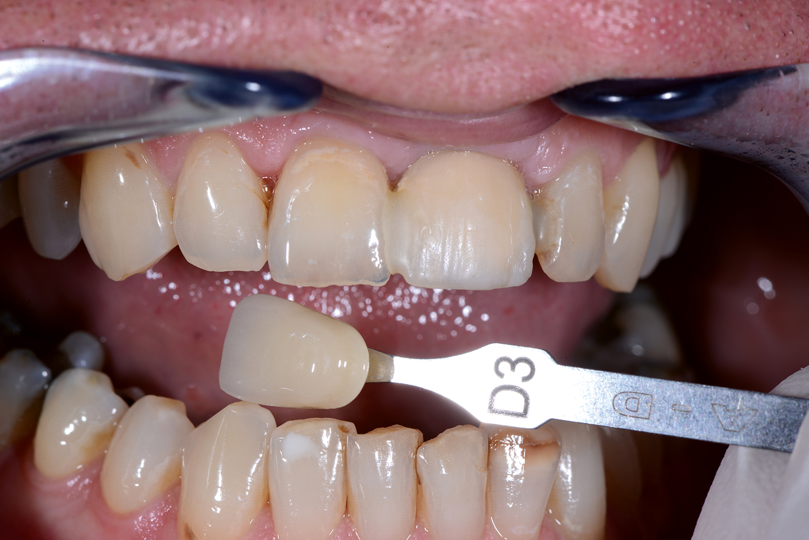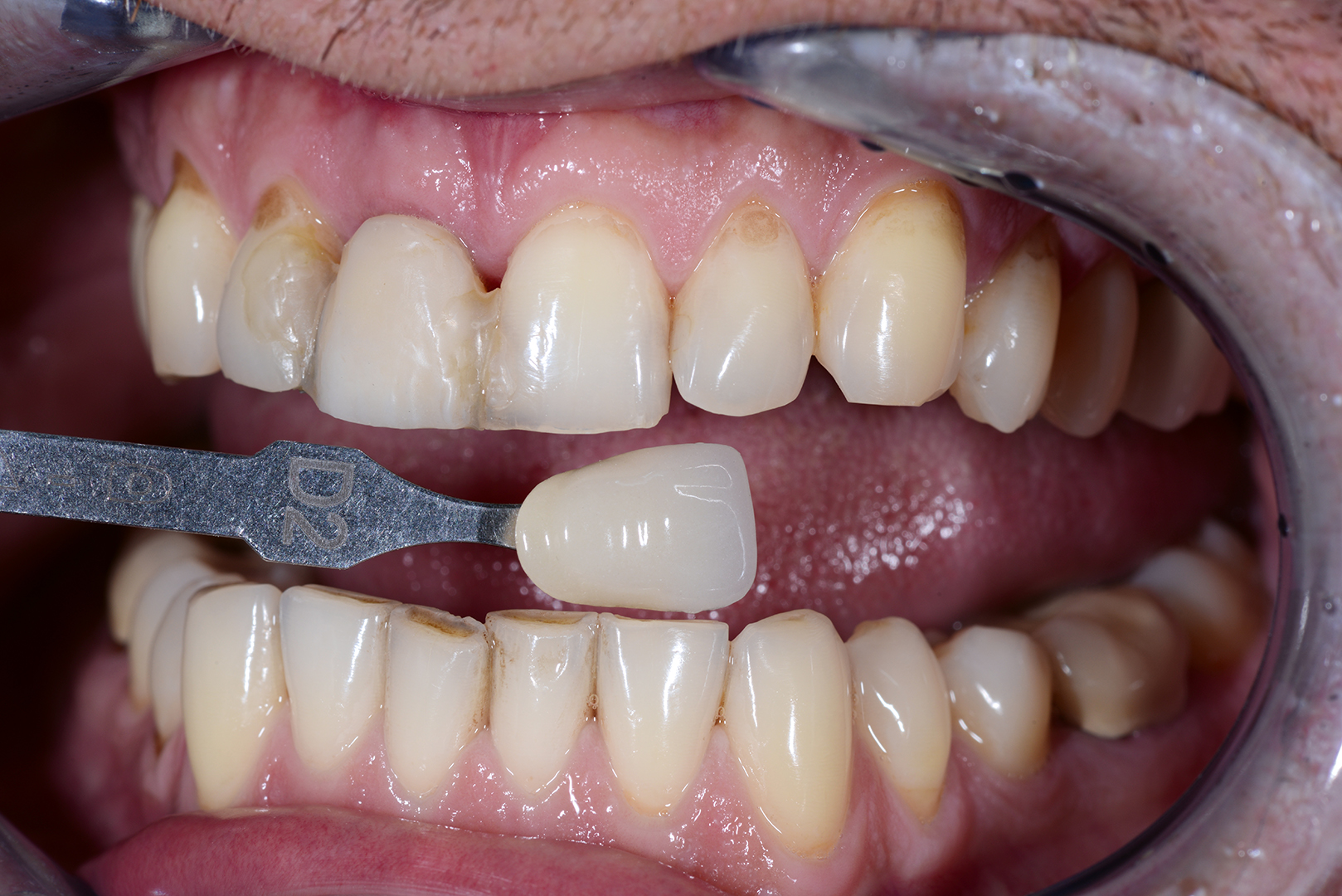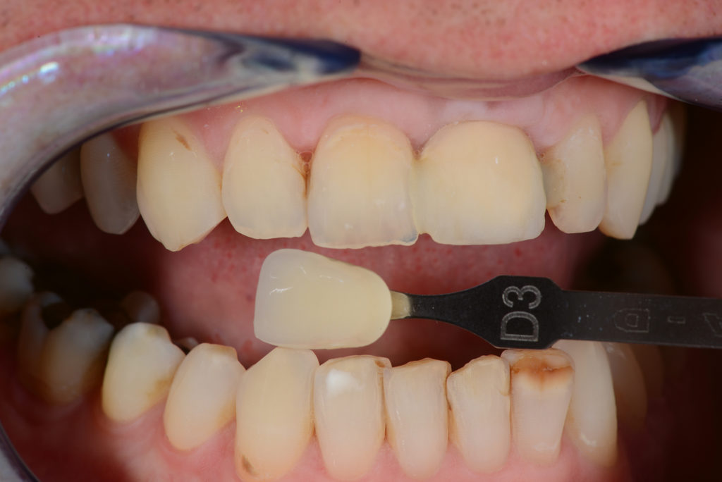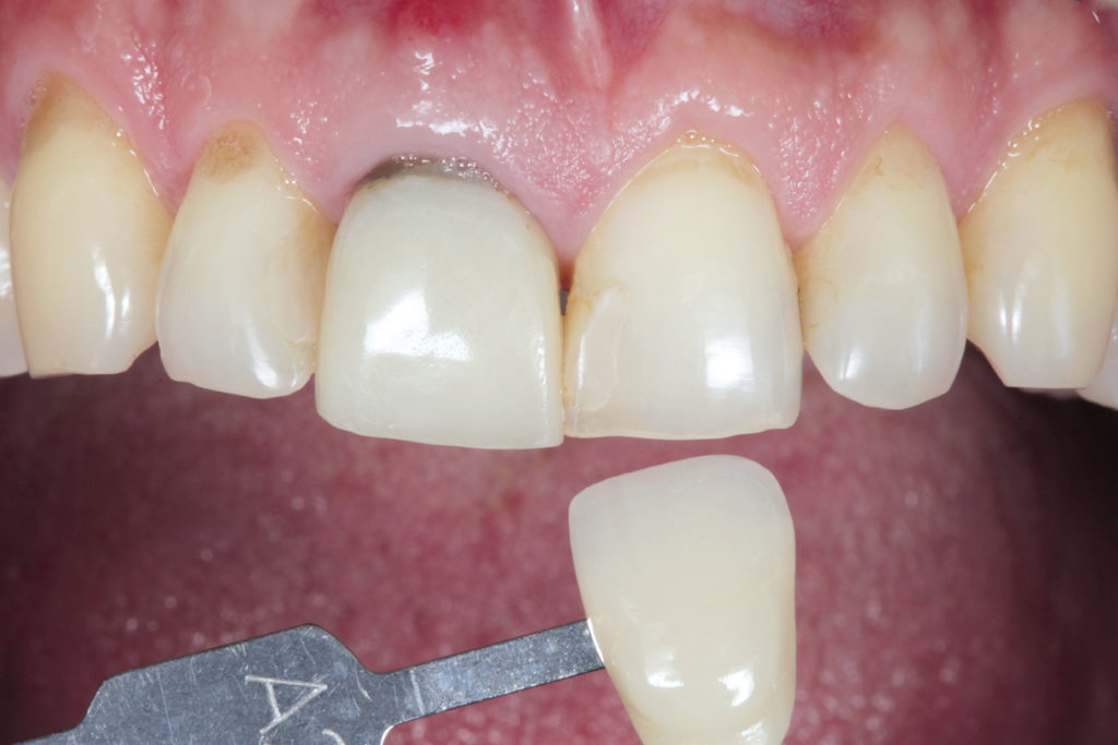Ästhetik, Einzelkronen, Farbnahme, Frontzahnimplantate, Frontzahnkronen, Gingivamanagement, Herausforderung, Implantatprothetik, Implantologie, Vollkeramik