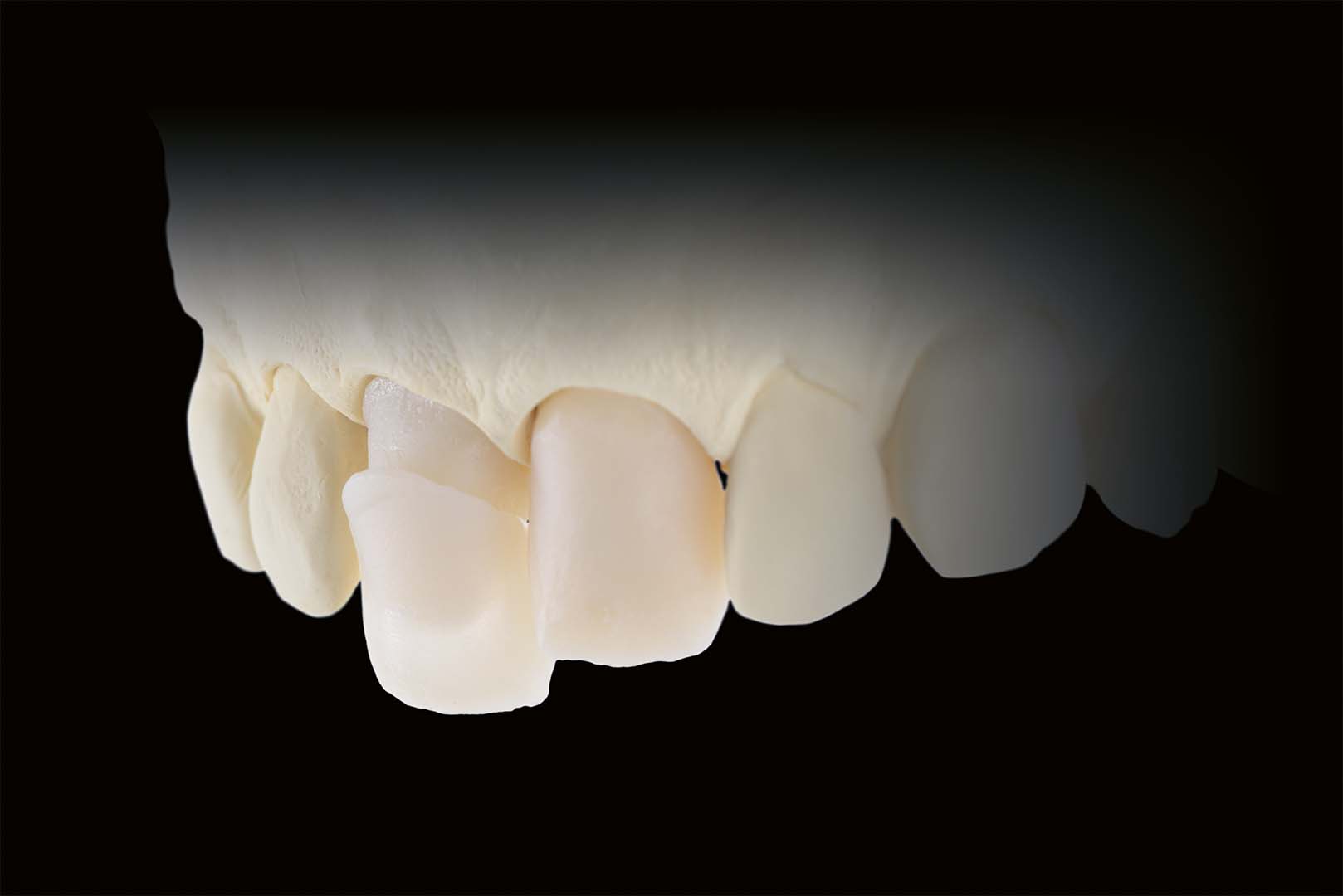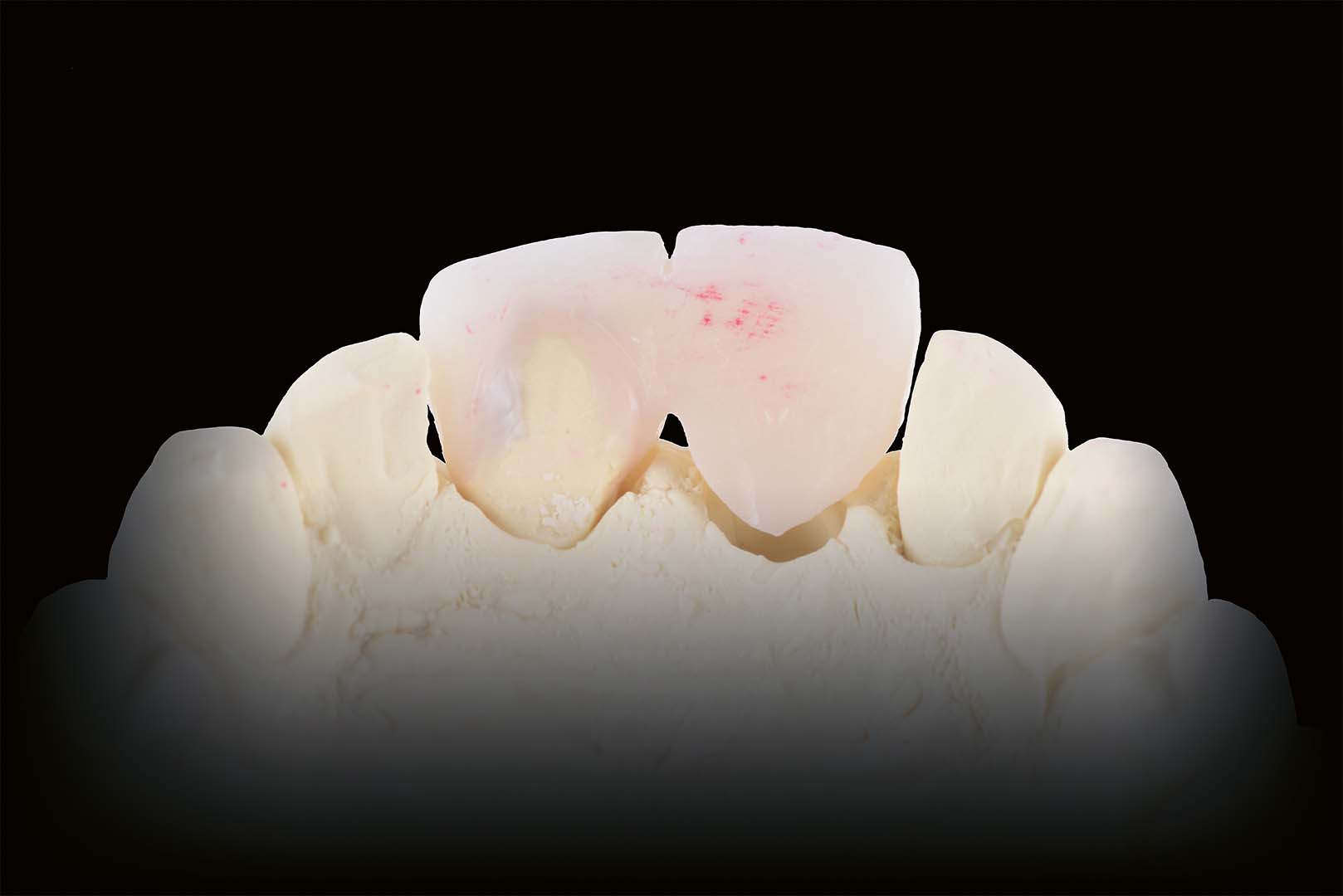 Während die Grundform der Zähne mit dem Prototyp definiert worden war, lag nun der Fokus vollends auf der keramischen Schichtung. Bei der Farbanalyse der natürlichen Zähne – insbesondere von Zahn 11 – zeigte sich ein lebendiges internes Farbspiel. Der Zahn wies starke Charakteristika auf, was sich auch noch nach der Präparation des Schmelzes zeigte. Diese farblich sensiblen Bereiche mussten als Grundierung auf das Zirkonoxid-Abutment überführt und dieses daher entsprechend koloriert werden (Abb. 20). Veneer und Implantatkrone wurden parallel zueinander geschichtet. Grundsätzlich wird immer mit dem gleichen Verblendkeramiksystem gearbeitet, um gleichmäßige lichtoptische Eigenschaften zu erzielen. In diesem Fall wurde als ein in sich geschlossenes System eine Verblendkeramik für Zirkonoxid verwendet. Mit dieser Keramik wurde also die Implantatkrone auf dem Zirkonoxid-Abutment und das Veneer auf einem feuerfesten Stumpf geschichtet. Beim ersten Brand wurden mit Dentin die Form erarbeitet und mit einer Melange aus Inzisalmasse und Dentin die natürliche Transluzenz der Schneidekante angelegt (Abb. 21 und 22). Für den zweiten Brand konnte bei der Schichtung dann der Fokus auf die Reproduktion der farblichen Charakteristika gelegt werden.