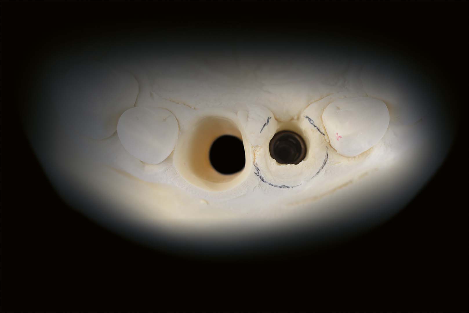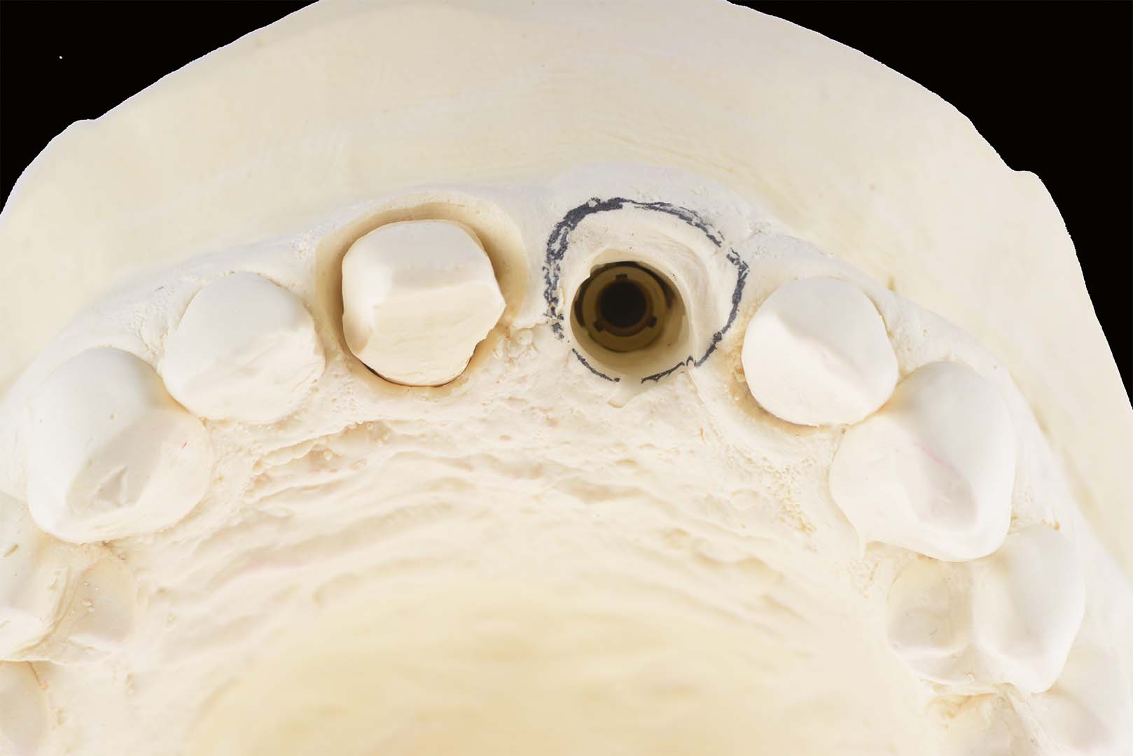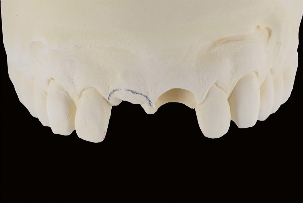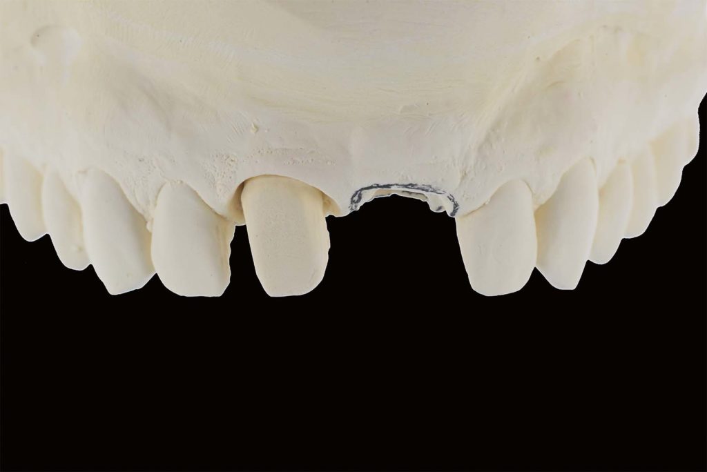 Bevor am Modell das Emergenzprofil entsprechend der gewünschten trichterförmigen Ausformung radiert werden kann, muss das Austrittsprofil für die Implantatkrone definiert werden. Dafür diente ein Prototyp aus Kunststoff, der CAD/CAM-gestützt hergestellt wurde. Ziel dieses Dummys ist es – im Sinne eines Set-ups –, die Zahnform zu definieren und auf diesem Weg den idealen Weichgewebeverlauf zu eruieren. Dafür wurde das Modell digitalisiert, sodass in der CAD-Software in regio 11 und 21 Konfektionszähne** aufgestellt werden konnten. Im Bereich des Implantats wurde der Zahn nicht in die Alveole konstruiert, sondern basal in Form eines Brückenglieds gestaltet. Nur so kann mittels der eigentlichen Zahnform ein natürlicher Austritt der Krone aus dem Weichgewebe realisiert werden. Der Prototyp wurde aus zahnfarbenem PMMA gefräst und auf das Modell gesetzt (Abb. 10 und 11). Da das „Brückenglied“ (die Implantatkrone) basal freiliegend gestaltet war, konnte der zervikale Anteil mit einem Skalpell beziehungsweise einem Stift imaginär verlängert und somit ein ideales Austrittsprofil auf dem Modell skizziert werden (Abb. 12 bis 15). Diese Skizze bildete die Vorgabe für das Radieren des Emergenzprofils. Das Radieren erfolgte mit einem Fissurenbohrer in einem Winkel von zirka 45°; die biologische Breite (Abb. 16) bleibt dabei unangetastet. Die Form der Radierung erinnert an einen Trichter oder einen Weinkelch.