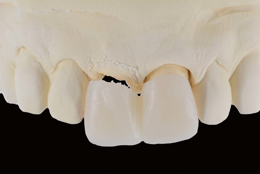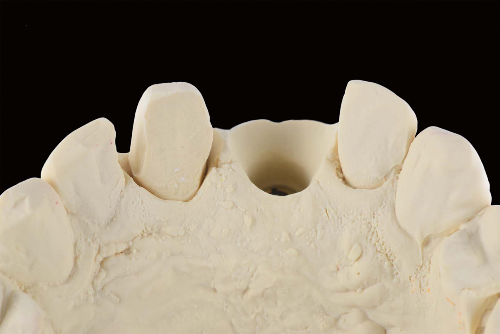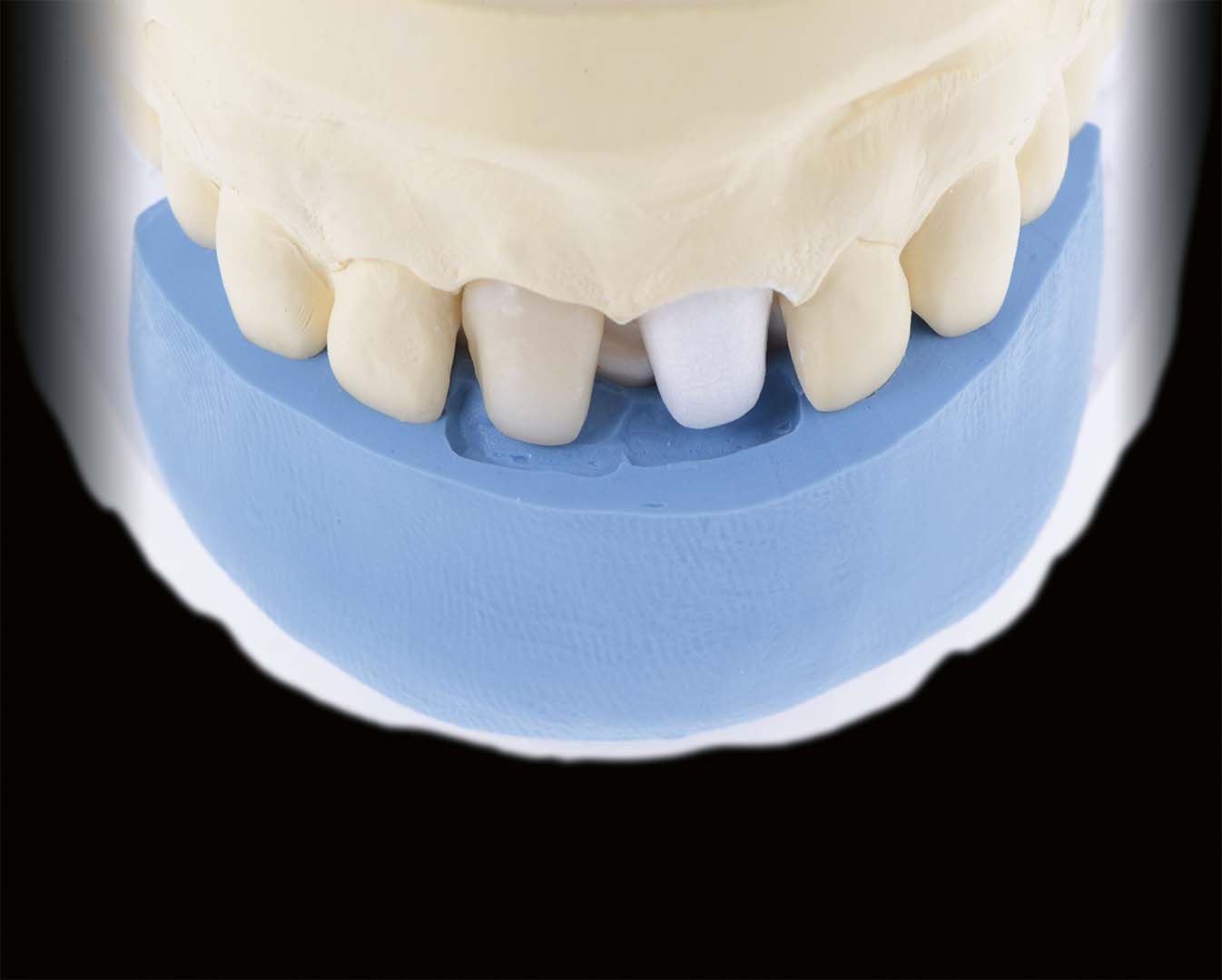 Auf eine abnehmbare Zahnfleischmaske wird in solchen Indikationen verzichtet. Zum einen lässt sich das Emergenzprofil auf einer Zahnfleischmaske schlecht radieren, zum anderen ist die Passungskontrolle aufgrund der Flexibilität des Materials erschwert. Auf dem Gipsmodell hingegen lassen sich eventuelle Störstellen sehr genau eruieren.