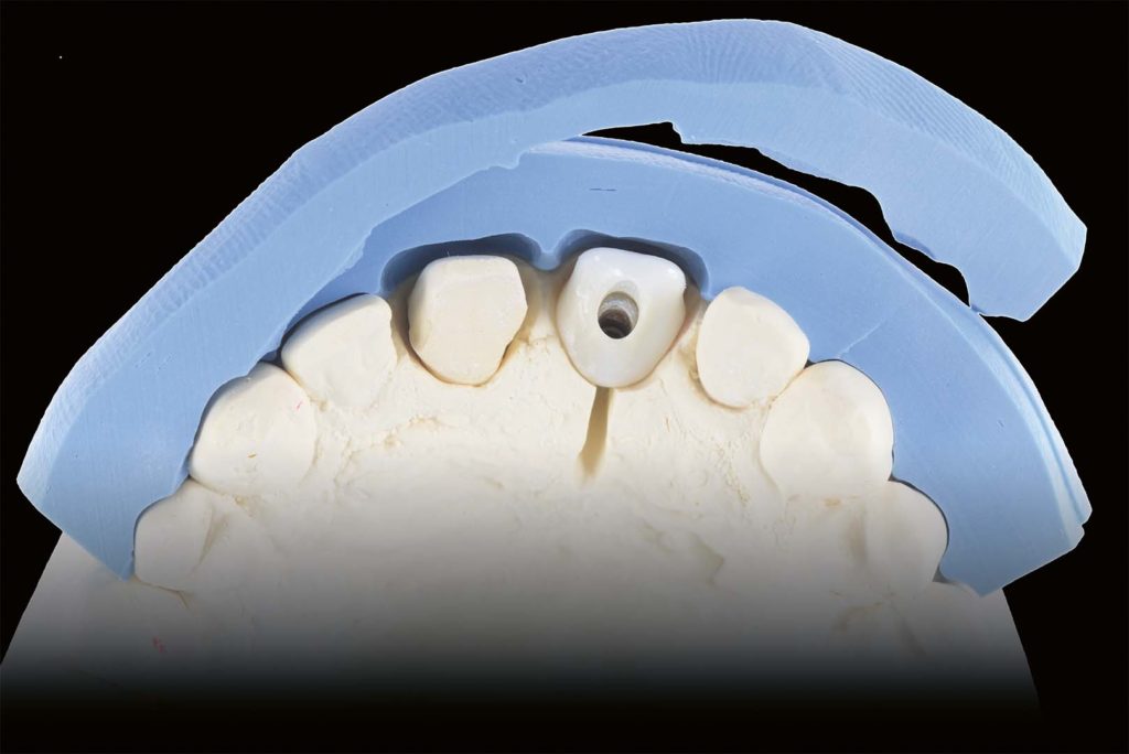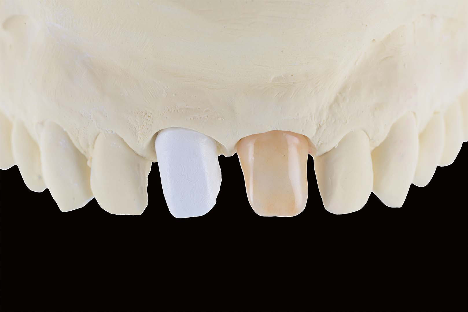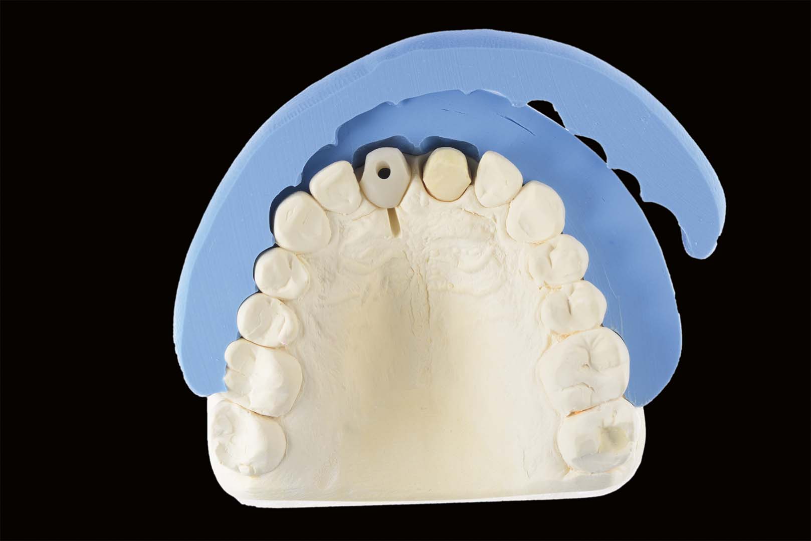 Auch das Abutment wurde CAD/CAM-gestützt aus Zirkonoxid gefertigt. Da die Breitenverhältnisse beider zentralen Inzisiven neu gestaltet werden sollten, galt es, den Nachbarzahn mit einem Veneer zu versorgen. Dies musste bei der Konstruktion des Abutments beachtet werden. Um gleichmäßige lichtoptische Eigenschaften der doch unterschiedlichen Restaurationsformen zu erzielen, mussten annähernd ähnliche Dimensionen erarbeitet werden. Daher wurde das Abutment adäquat zu der Form des präparierten Zahns 11 konstruiert. Über die Spiegel-Funktion der Software lässt sich dies relativ einfach umsetzen. Das Ergebnis waren zwei Pfeiler, die bezüglich ihrer Stärke, Dimension, Lichteinstrahlung, Lichtbrechung und so weiter eine fast identische Basis für die Verblendung und somit eine gleichmäßige Farbwirkung boten. Mit einem klassischen Silikonschlüssel konnte das aus Zirkonoxid gefräste Abutment hinsichtlich seiner Dimension und Passung auf dem Modell geprüft werden (Abb. 17 bis 19). Mittels eines kleinen Schlitzes im palatinalen Bereich des Modells lässt sich kontrollieren, ob das Abutment „satt“ auf dem Titanaufbau aufsitzt. Die Arbeit mit einer abnehmbaren Zahnfleischmaske*** kann diesbezüglich fehlerbehaftet sein.