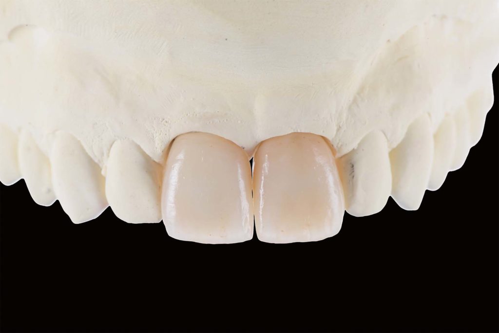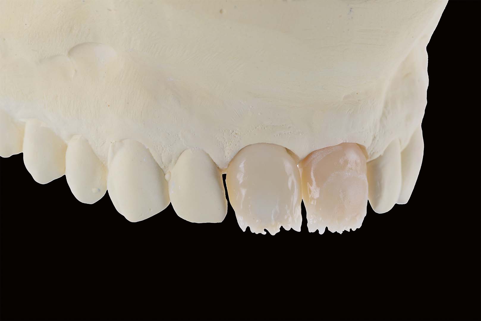 Häufig wird diskutiert, ob das Schichten auf einem gepressten Gerüst dem Schichten auf einem feuerfesten Stumpf vorzuziehen ist. Diese Frage ist individuell und fallspezifisch zu beantworten. In diesem Fall wurden als „Experiment“ beide Varianten ausprobiert (Abb. 57a/b).