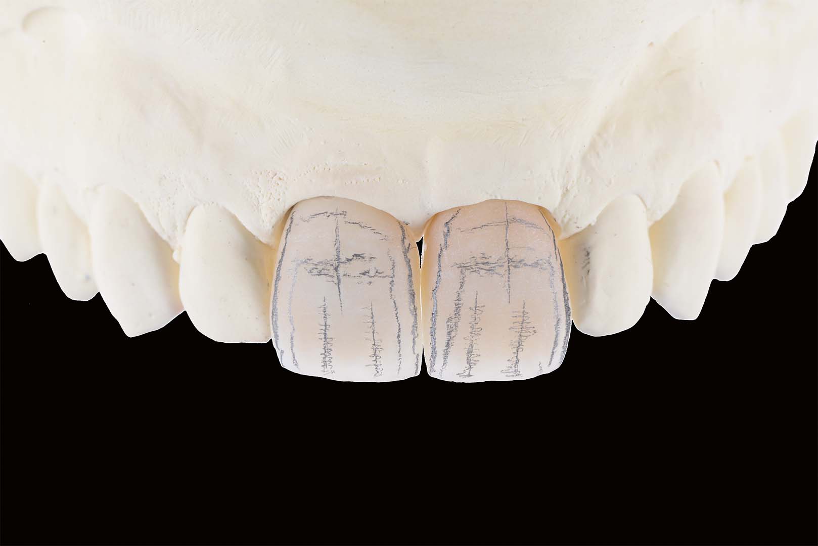 Auf die Anlage der farblichen Charakteristika folgten der Brand und das sorgfältige Ausarbeiten der Oberflächentopografie. Für das Einarbeiten der Makro- und Mikrotextur sowie das Ausarbeiten der Zahnform sind entsprechende Anzeichnungen auf den keramischen Restaurationen hilfreich. Werden die Anzeichnungen fotografisch festgehalten und am Bild vergrößert betrachtet, vereinfacht dies die Beurteilung der Texturen (Abb. 23). Die Makrostruktur wird primär von Randleisten und Wülsten geprägt, woraus das optische Erscheinen der Restaurationen resultiert. Lichtreflexionen, die durch Leisten hervorgerufen werden, beeinflussen die optische Wirkung der Zahnform. Die Mikrostruktur orientiert sich an den Oberflächencharakteristika der natürlichen Nachbarzähne. Mit einem Feinschliff wurden mit bloßem Auge kaum sichtbare Perikymatien sowie feine Rillen mit gewelltem Verlauf und zarte Grübchen eingearbeitet. Das Zusammenspiel vieler Feinheiten gipfelte in einer lebendigen Oberflächenstruktur.