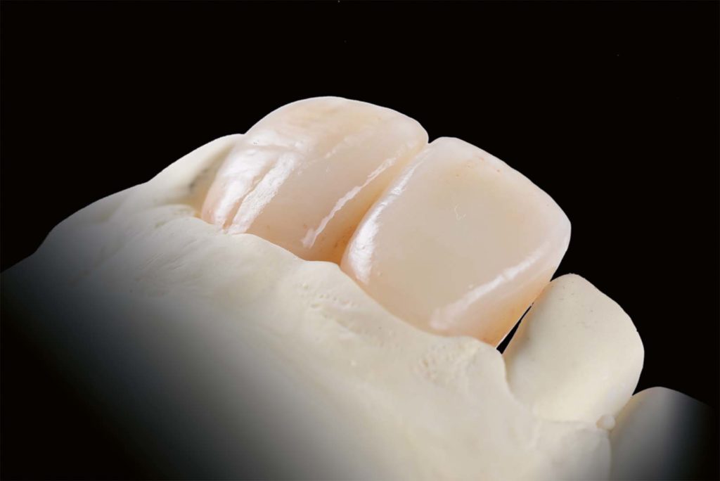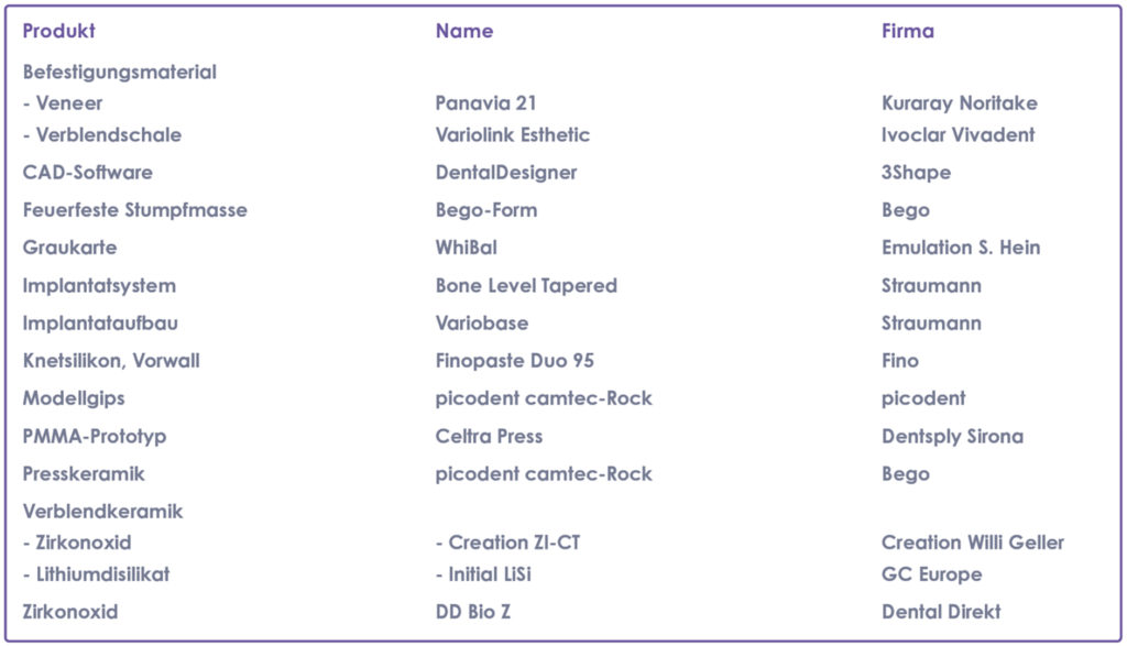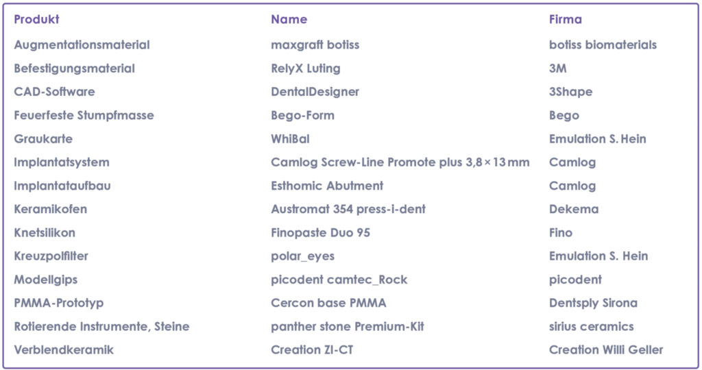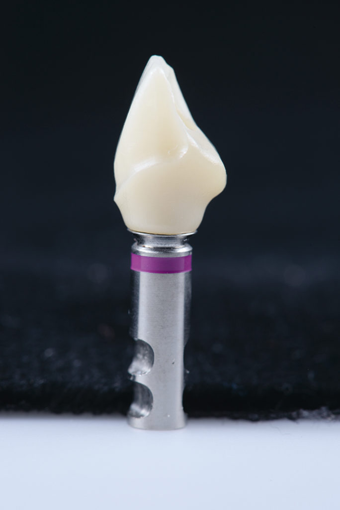 Herstellen von gepressten Gerüsten für das Zirkonoxidabutment sowie den präparierten Zahn und Verblenden mit einer Keramik für Lithiumdisilikat. Für den dauerhaften Verbund des gepressten Gerüsts auf dem Zirkonoxidabutment könnte ein Glaslot (zum Beispiel DCM hotbond) verwendet werden. Alternativ kann das Gerüst mit einem Befestigungskomposit auf das Abutment geklebt werden.