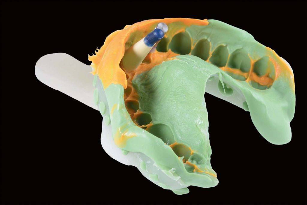 Nach dem Einheilen des Implantats erfolgten im ersten Schritt der zahntechnischen Arbeit die Farbanalyse sowie die ästhetisch-funktionelle Bewertung der Ausgangssituation. Die Dentalfotografie spielt dabei eine wichtige Rolle. Zur Beurteilung der Zahnfarbe dienten Aufnahmen mit einer klassischen Farbskala (Vita classical A1–D4 Farbskala) sowie ergänzend dazu Aufnahmen mit Kreuzpolarisationsfilter (Abb. 7 und 8). Mit diesem Filter lassen sich Reflexionen eliminieren und somit der Helligkeitswert und die Charakteristika der natürlichen Zähne identifizieren. Allerdings dienen die ermittelten Werte lediglich als Anhaltspunkt. Bei der Betrachtung der Ausgangssituation (vgl. Abb. 1) zeigte sich unter anderem, dass Zahn 11 an der Inzisalkante „ausgefranst“ ist, was jedoch die kleinere Herausforderung darstellte. Primär fällt die unterschiedliche Breite der beiden Frontzähne auf. Die Lücke in regio 21 war im Verhältnis zum Zahn 11 sehr breit. Um diese Diskrepanz auszugleichen und eine Balance beziehungsweise Harmonie der Zahnformen anstreben zu können, sollte Zahn 11 mit einem Veneer versorgt werden. Nach Abnahme der provisorischen Brücke und der Präparation des Zahns 11 erfolgte die Implantat-Überabformung (Abb. 9), sodass die Modelle hergestellt werden konnten (Steckstumpf- oder Geller-Modell).