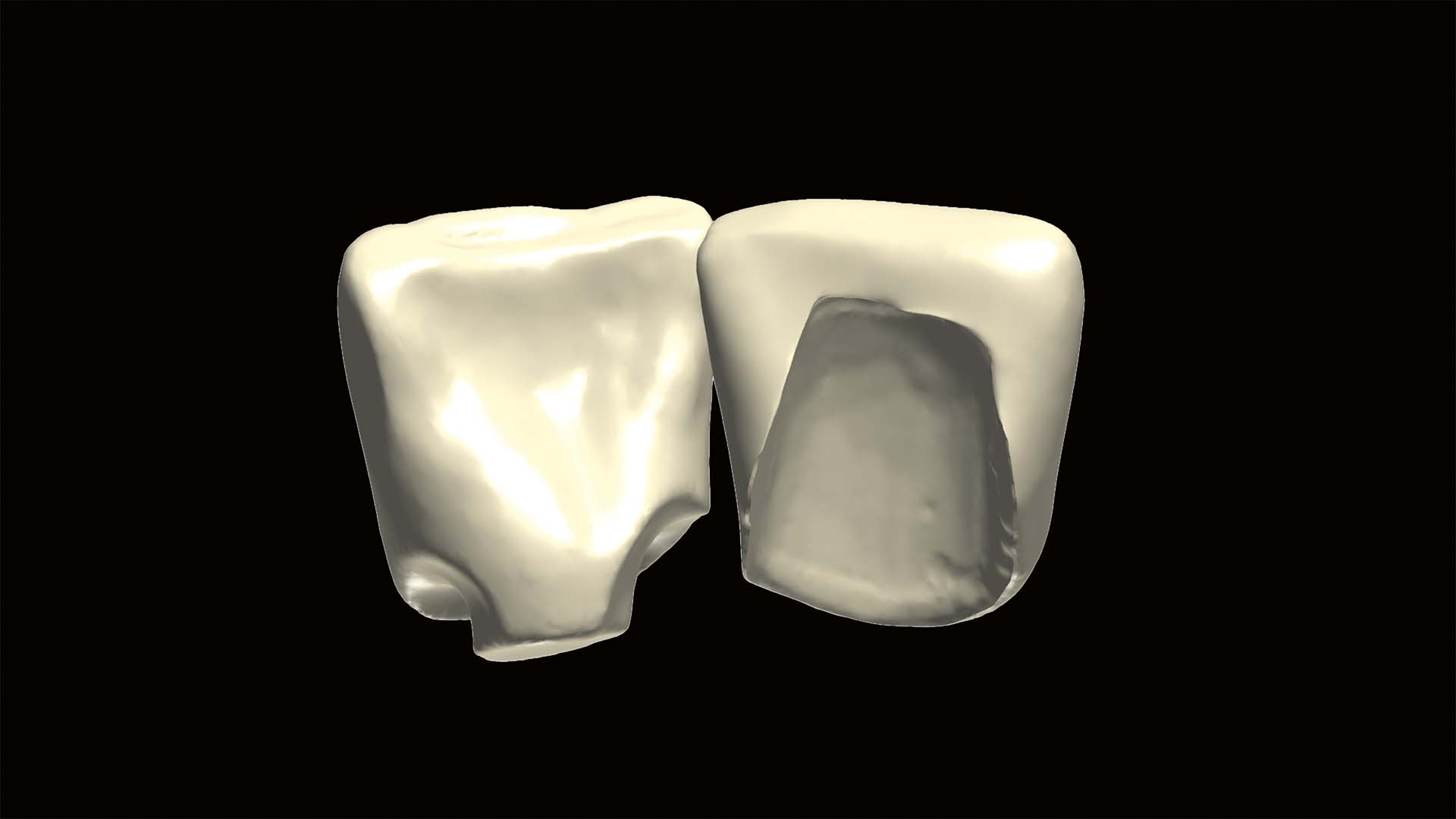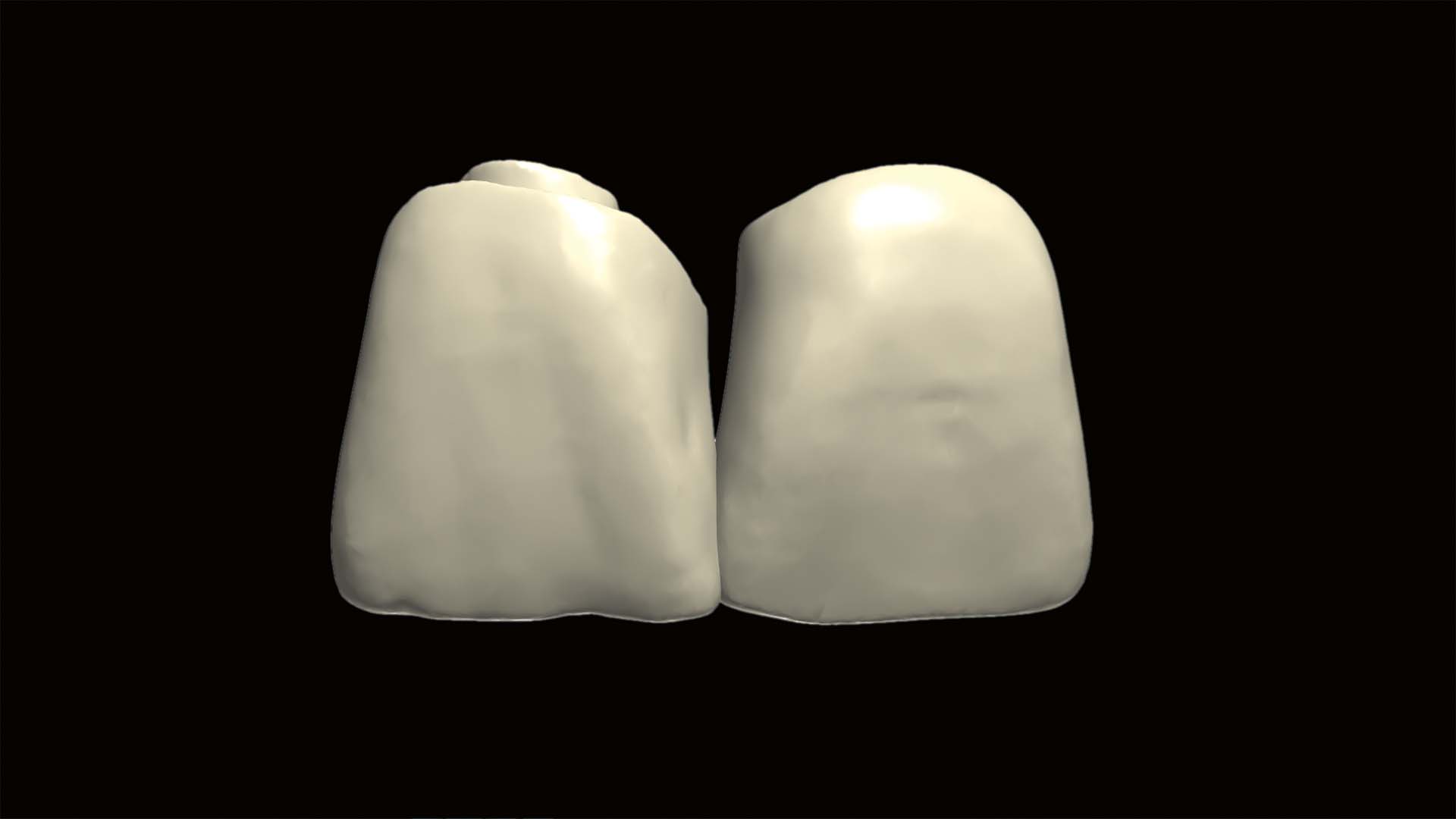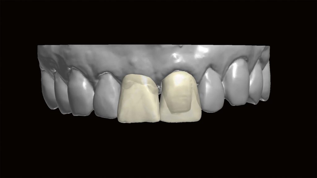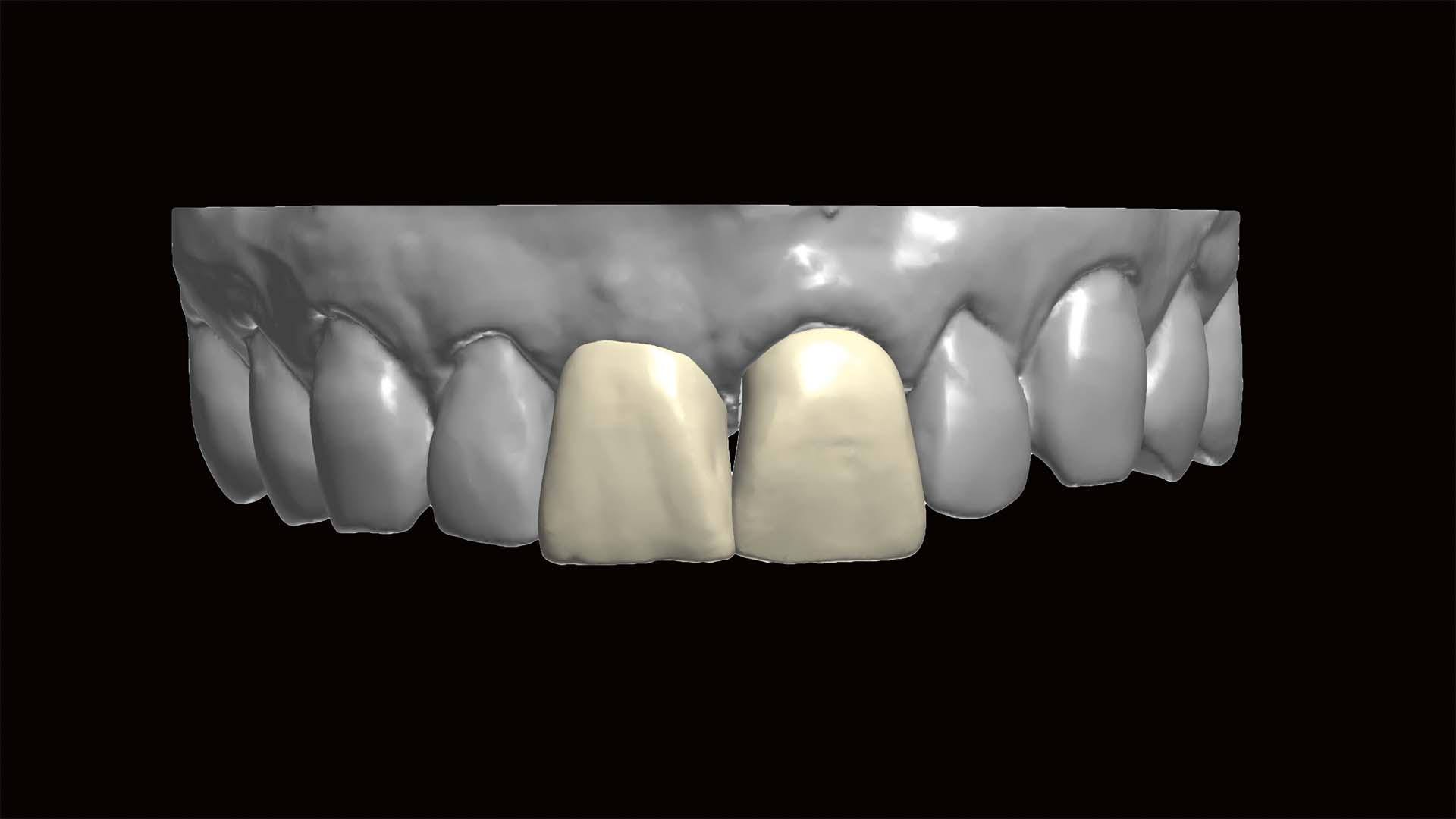 Der folgende Ablauf entspricht dem im Fall 1 vorgestellten Konzept. Zunächst erfolgte das Herstellen des Prototyps als Vorlage für das Radieren des Emergenzprofils. Nach dem Digitalisieren des Modells wurden aus der Bibliothek der CAD-Software eine adäquate Zahnform ausgewählt und die Zähne 11 und 21 aufgestellt (Abb. 47a – e). Im zervikalen Bereich wurde die Implantatkrone in der Software so zurückgerechnet, dass sie basal die Form eines Brückengliedes hatte. Diese Form hat nichts mit der eigentlichen subgingivalen Abutmentform gemein, sondern bildet vielmehr die natürliche Form des Zahnhalses ab.