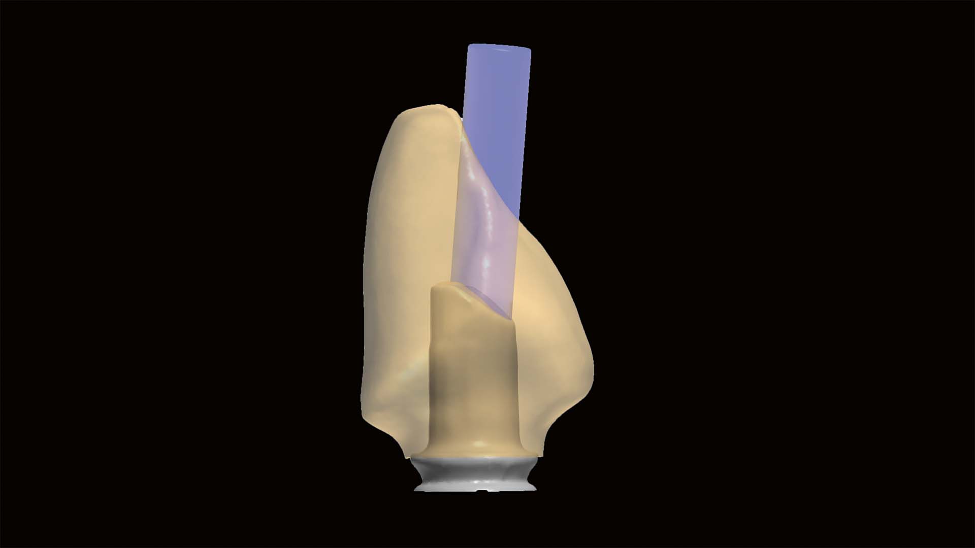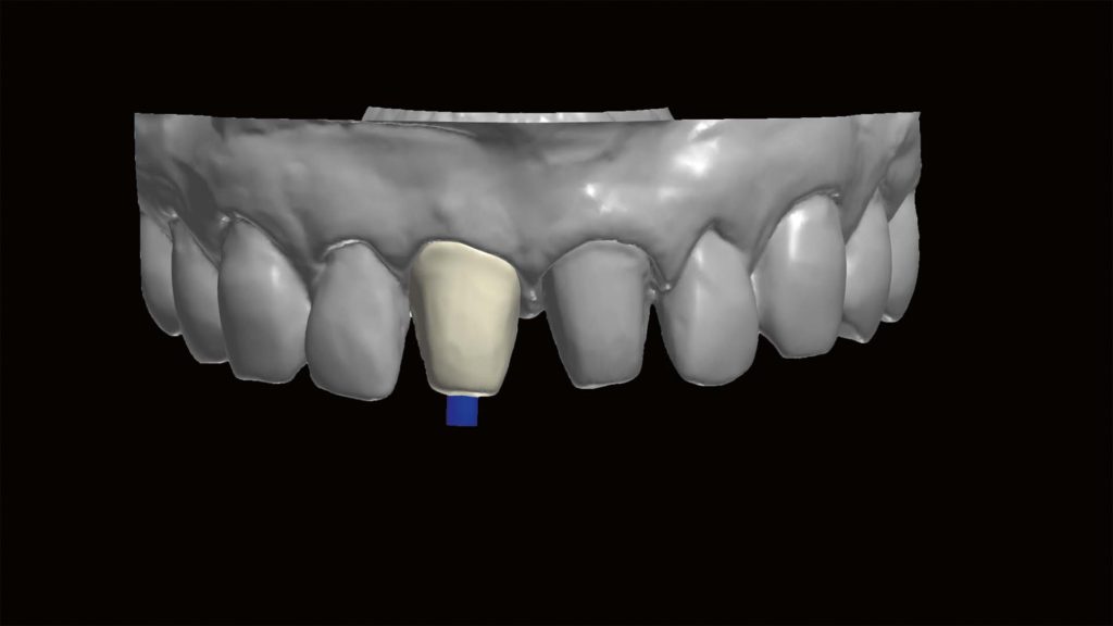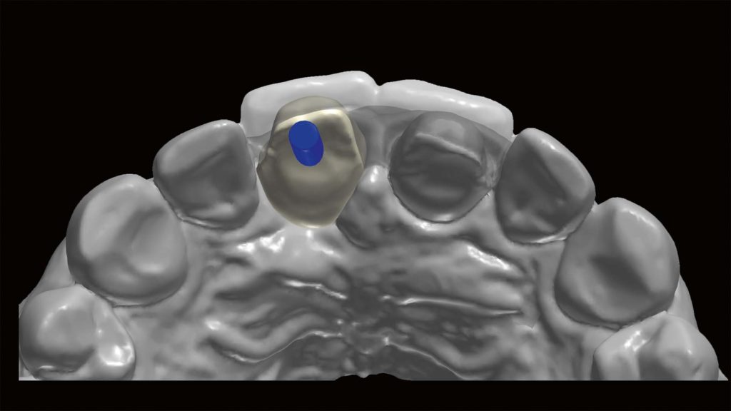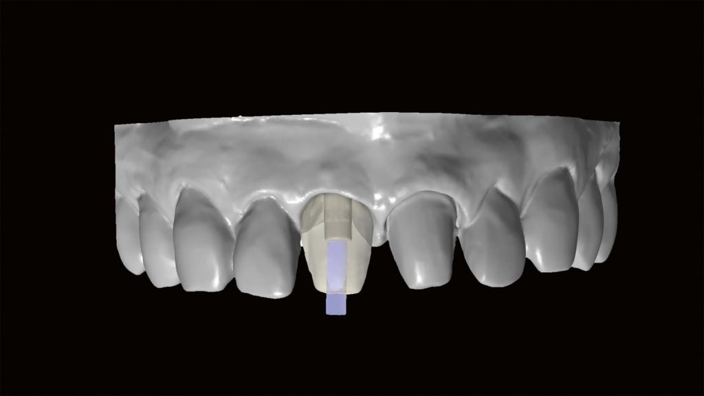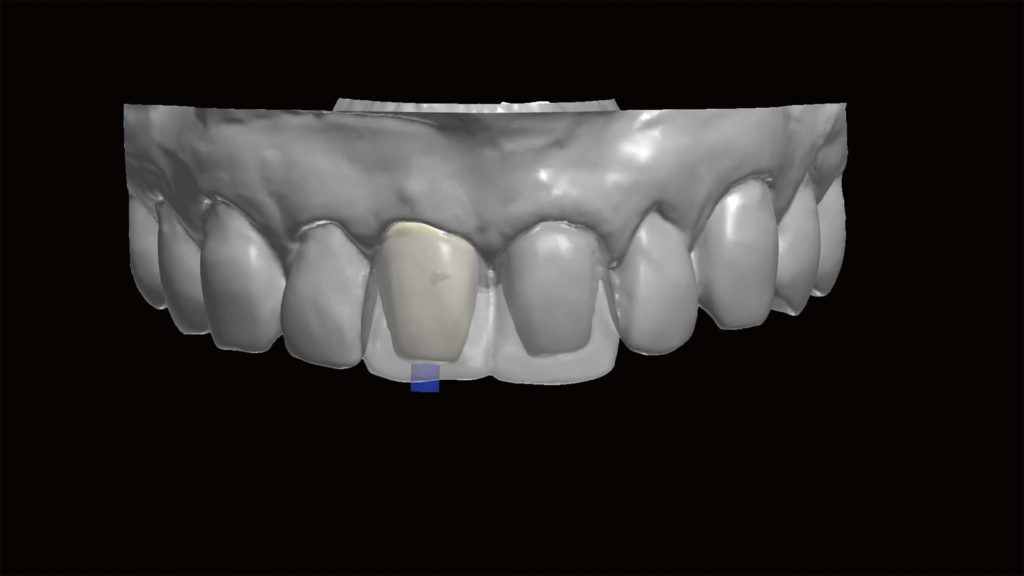 Um das Abutment CAD-gestützt konstruieren zu können, wurde das Implantat mitsamt einer Titanbasis eingescannt. Erneut galt der Anspruch, die „Stümpfe“ für die beiden doch so unterschiedlichen Restaurationen (Implantatkrone und Veneer) möglichst gleichmäßig zu dimensionieren. Nur so lässt sich die doppelte Herausforderung – Implantat trifft Veneer – erfolgreich bewältigen. Der präparierte Zahn 21 wurde dazu in der Software gespiegelt, auf die regio 11 übertragen und das Abutment entsprechend konstruiert (Abb. 53). Da auch die prothetische Planung in der Software hinterlegt war, konnte mittels Überblendmodus die Geometrie des Abutmentdesigns geprüft werden (Abb. 54a – d). In diesem Fall war Zahn 11 leicht nach vestibulär gekippt, was durch die Zahnstellung im Unterkiefer bedingt war und zugleich eine gewisse Dynamik in der Frontzahnreihe bewirken sollte. In der inzisalen Ansicht bestätigt sich im Überblendmodus, dass eine verschraubte Restauration möglich ist, auch wenn der Schraubenkanal nicht in 0° aus dem Aufbau austritt. Das Implantatsystem bietet dazu eine spezielle Titan-Klebebasis an, die eine angulierte Verschraubung bis zu einem gewissen Grad zulässt.