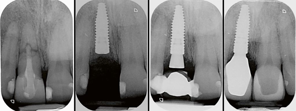 Nach der Eingliederung der beiden Restaurationen zeigte sich die gewünschte Harmonie zwischen den Restaurationen (Abb. 60), den Nachbarzähnen und dem Weichgewebe. Die Implantatkrone wirkt wie natürlich aus dem Kieferkamm gewachsen. Die Zahnformen konnten einander angeglichen werden; die beiden mittleren Schneidezähne wirken in ihrer Form und Dimension harmonisch. Die Chronologie der Röntgenaufnahmen verdeutlicht die klinischen Sequenzen während des Therapieverlaufs und unter anderem, wie wichtig ein entsprechend konfiguriertes Abutment ist (Abb. 61).