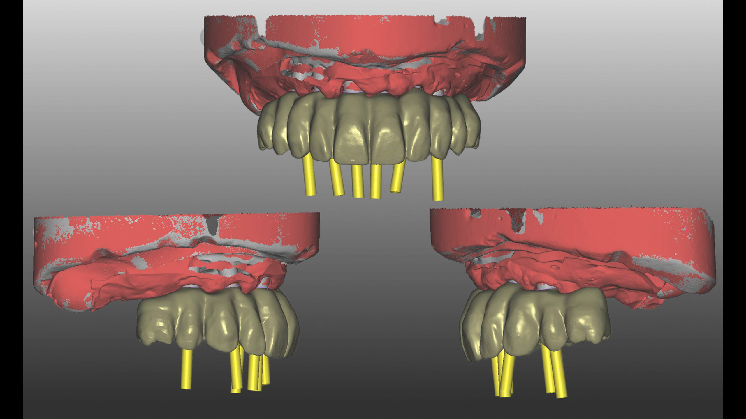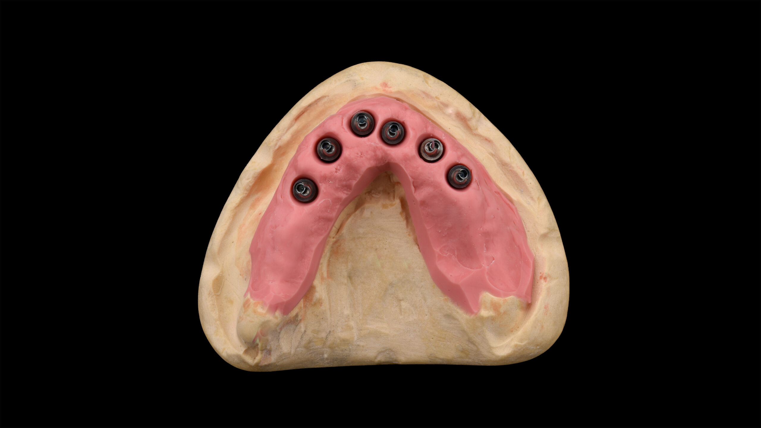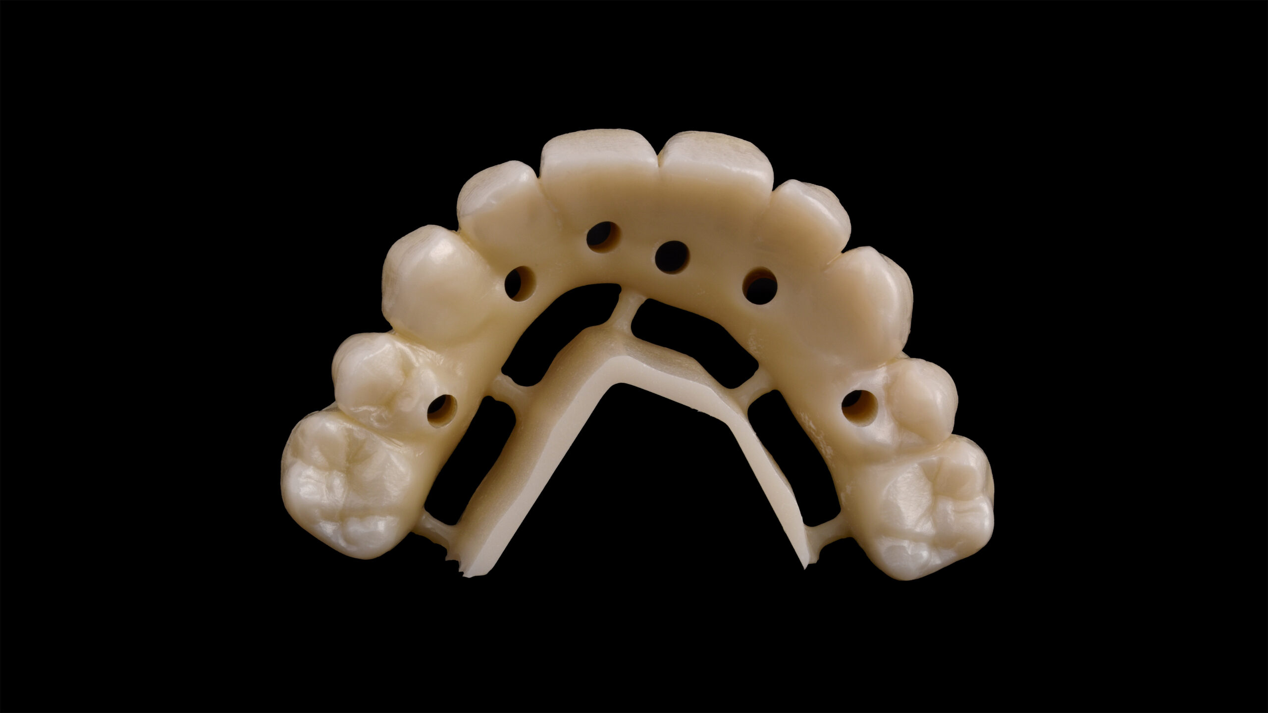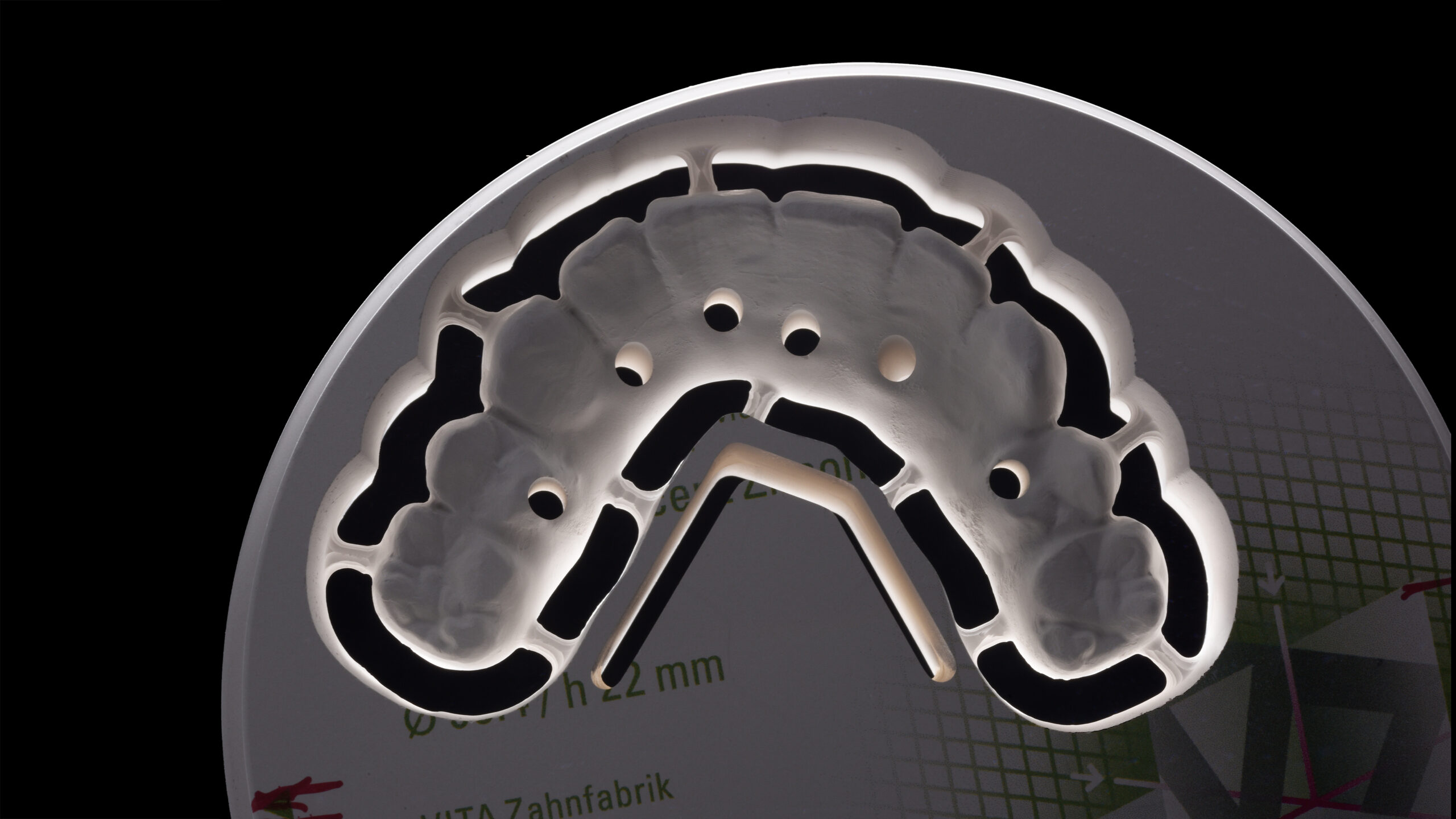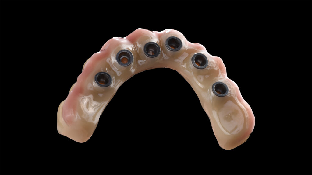 Ein Patient hatte aufgrund des häufigen Konsums von zuckerhaltigen Getränken und der daraus resultierenden kariösen Schädigung alle Zähne im Oberkiefer verloren. Da er sich mit Anfang sechzig wieder einen festsitzenden Zahnersatz wünschte, wurden insgesamt sechs Implantate inseriert. Nach Abheilung, Osseointegration und entsprechender Freilegung wurden Abformpfosten aufgeschraubt und die Situation konventionell abgeformt. Die digitale, umgebungsunabhängige Zahnfarbbestimmung mit dem Spektrofotometer Vita Easyshade V ergab an den natürlichen Unterkieferzähnen eine A3 im Vita classical A1-D4 Farbstandard. Für die definitive, implantatprothetische Ganzkieferversorgung wurde deswegen das supertransluzente und polychromatische Zirkondioxid Vita YZ STMulticolor in der entsprechenden Farbe A3 ausgewählt. Mit einer Biegefestigkeit von 1.200 MPa ist das Zirkonoxid mit einem Yttrium-Anteil von 4 mol% gerade für die starken Belastungen in der Implantatprothetik geeignet1 2. Andererseits bietet es gleichzeitig mit einer hohen Transluzenz von 46 % zahnähnliche optische Eigenschaften.3 4 Die Präzision beim Fräsvorgang und dem Sinterschrumpf sorgen für detailgetreue Fräsergebnisse und eine exzellente Passung bei der Integration von implantatprothetischen Schnittstellen5.