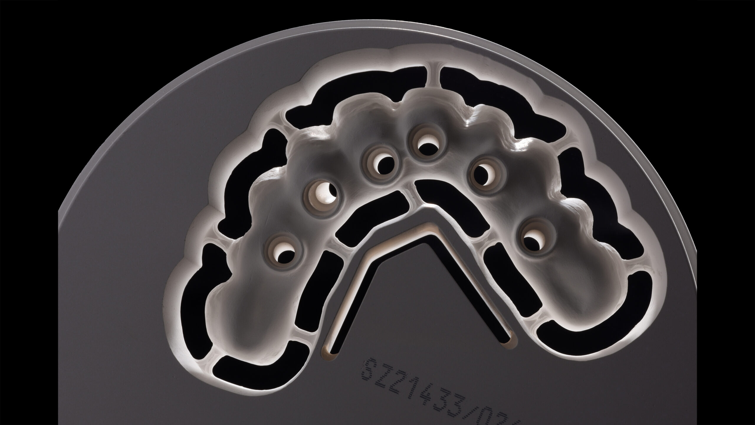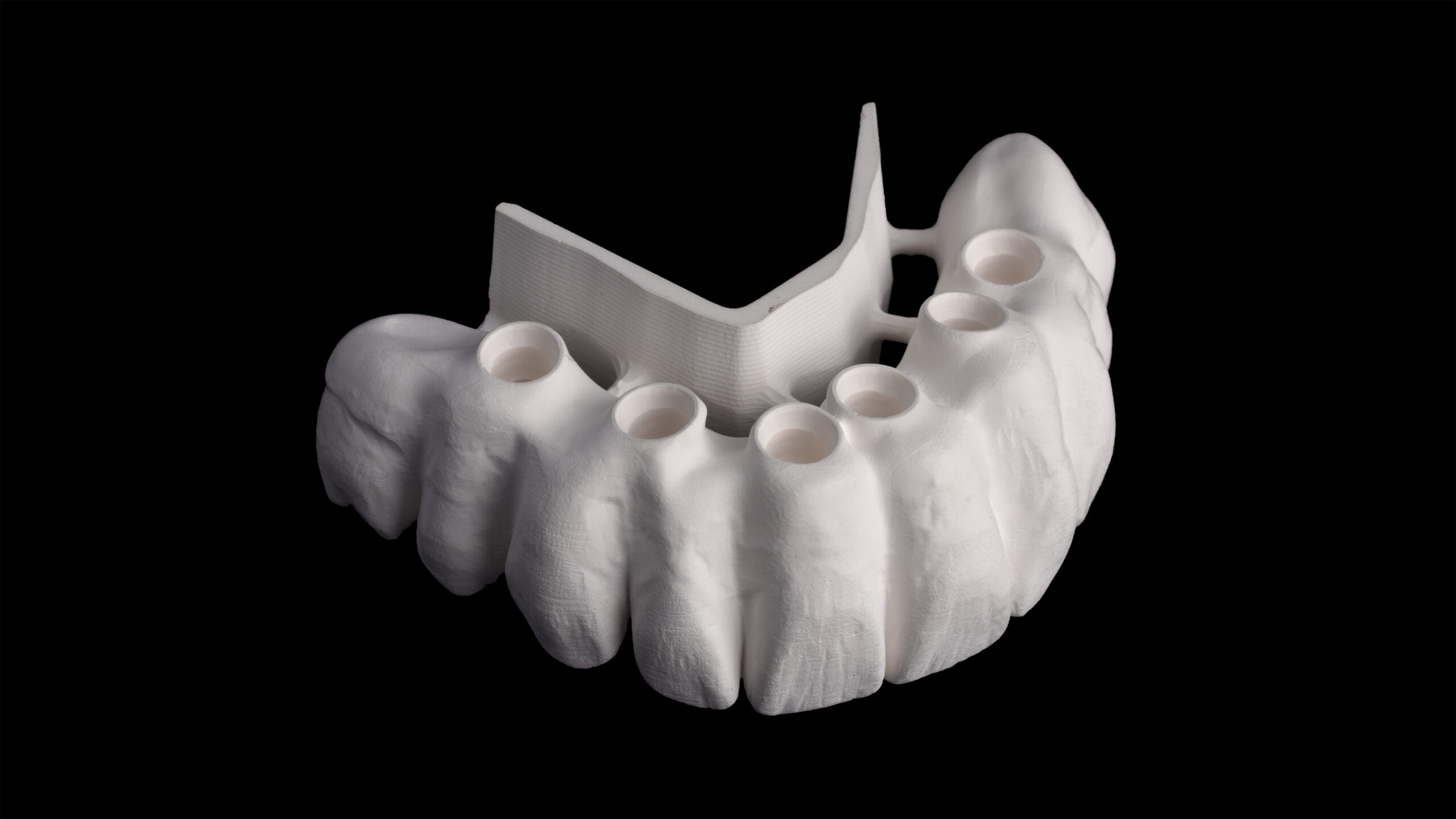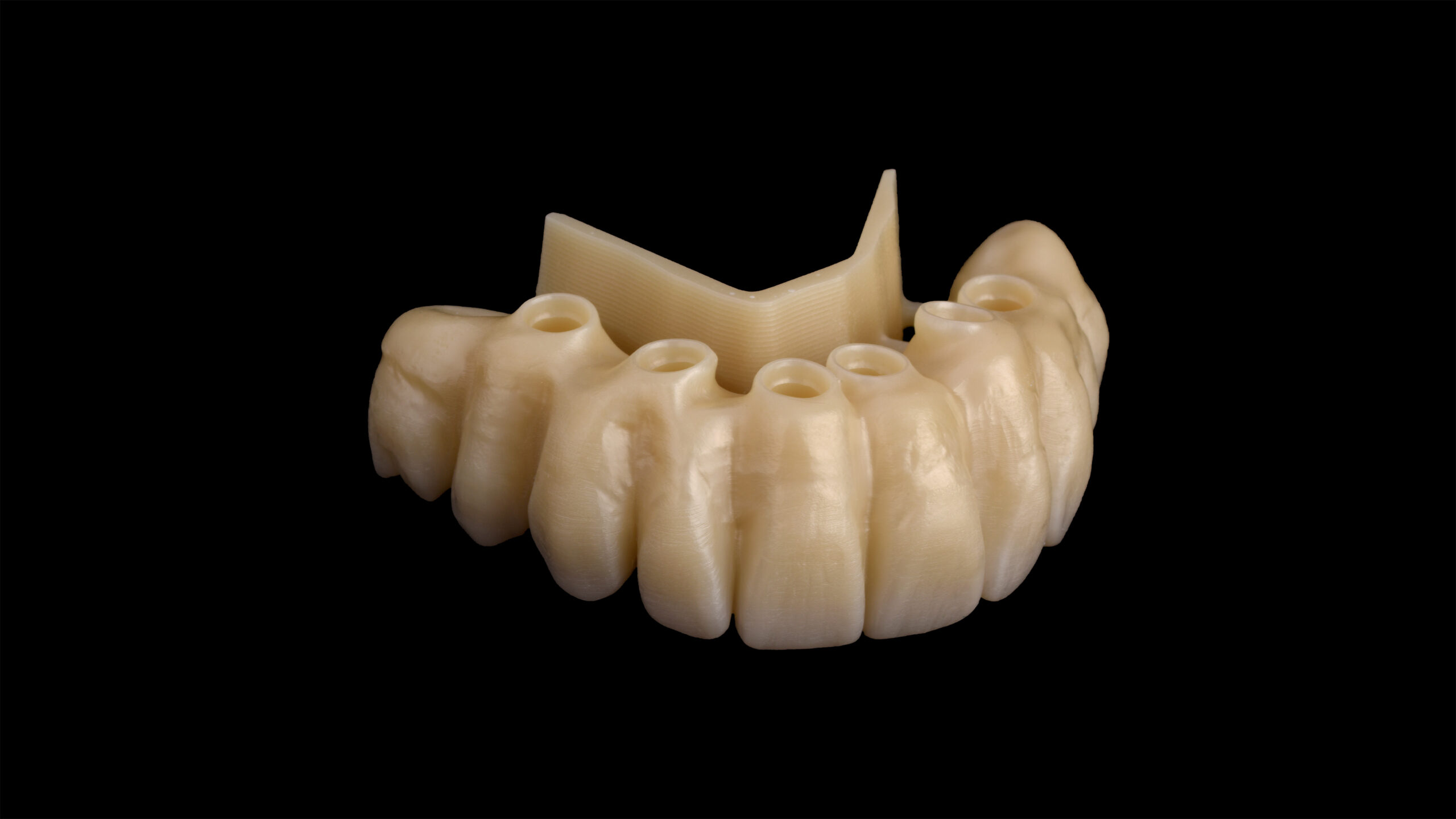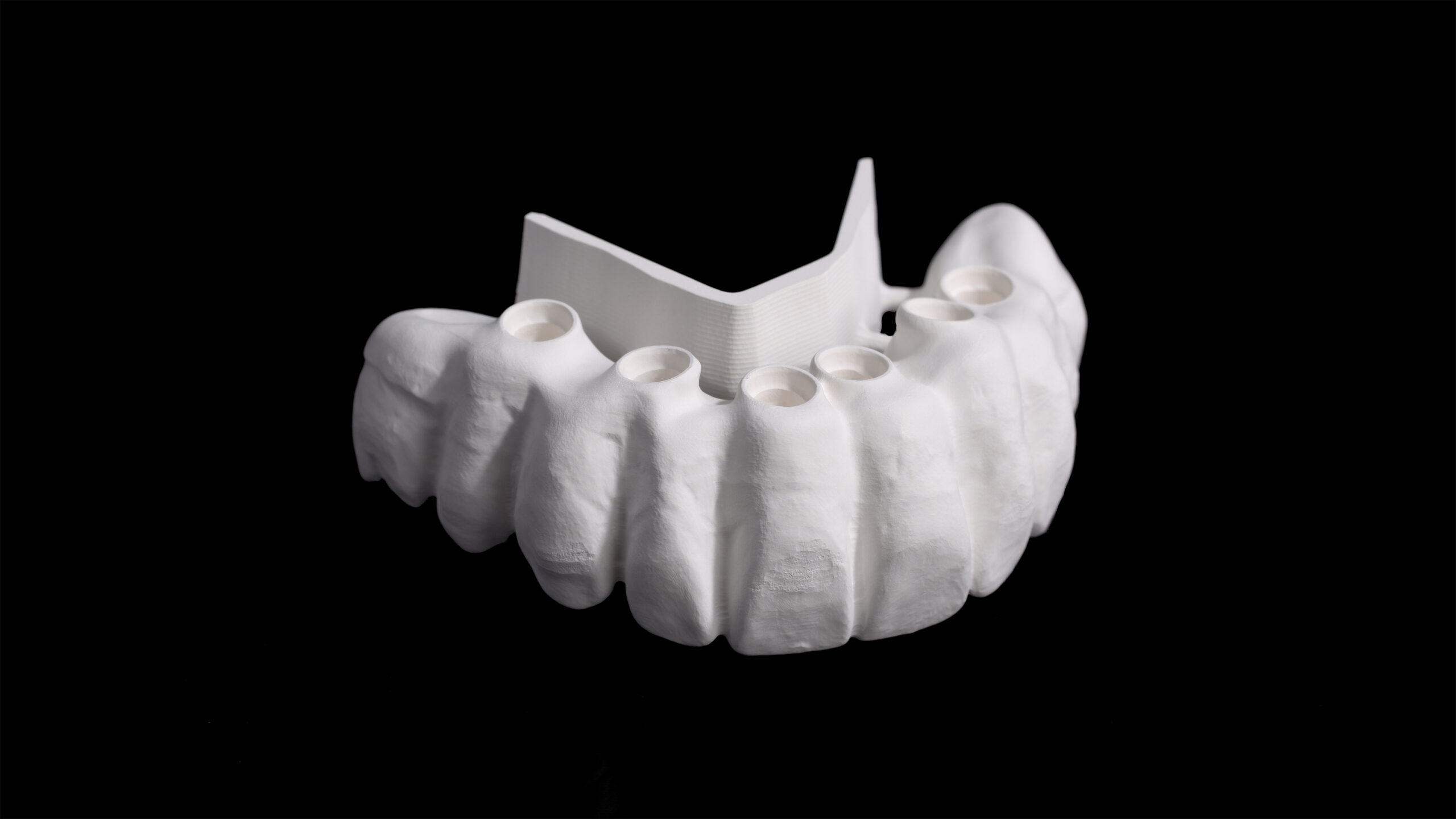 Ein Patient hatte aufgrund des häufigen Konsums von zuckerhaltigen Getränken und der daraus resultierenden kariösen Schädigung alle Zähne im Oberkiefer verloren. Da er sich mit Anfang sechzig wieder einen festsitzenden Zahnersatz wünschte, wurden insgesamt sechs Implantate inseriert. Nach Abheilung, Osseointegration und entsprechender Freilegung wurden Abformpfosten aufgeschraubt und die Situation konventionell abgeformt. Die digitale, umgebungsunabhängige Zahnfarbbestimmung mit dem Spektrofotometer Vita Easyshade V ergab an den natürlichen Unterkieferzähnen eine A3 im Vita classical A1-D4 Farbstandard. Für die definitive, implantatprothetische Ganzkieferversorgung wurde deswegen das supertransluzente und polychromatische Zirkondioxid Vita YZ STMulticolor in der entsprechenden Farbe A3 ausgewählt. Mit einer Biegefestigkeit von 1.200 MPa ist das Zirkonoxid mit einem Yttrium-Anteil von 4 mol% gerade für die starken Belastungen in der Implantatprothetik geeignet1 2. Andererseits bietet es gleichzeitig mit einer hohen Transluzenz von 46 % zahnähnliche optische Eigenschaften.3 4 Die Präzision beim Fräsvorgang und dem Sinterschrumpf sorgen für detailgetreue Fräsergebnisse und eine exzellente Passung bei der Integration von implantatprothetischen Schnittstellen5.