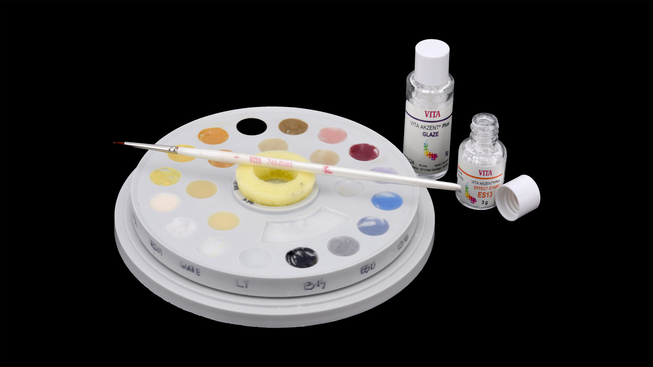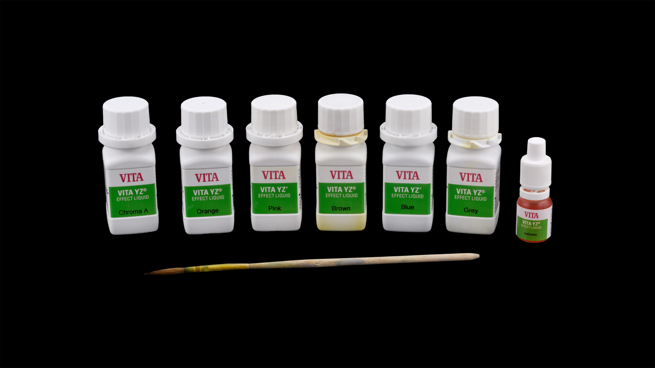 Zum Zirkonoxidsystem Vita YZ gehören auch die auf das Material abgestimmten Effect Liquids zur Infiltration vor der Sinterung. Auf diese Weise können patientenindividuelle Farbeffekte homogen bis in die Tiefe des Zirkonoxids erzeugt werden. Der Zervikalbereich wurde auf diese Weise mit dem Vita YZ Effect Liquid Chroma A farbintensiver gestaltet. Mit dem Effect Liquid Blue wurde eine bläuliche Transluzenz an den distalen und mesialen Leisten der Frontzähne und an den Höckerspitzen der Prämolaren und Molaren geschaffen. Die Einarbeitung eines vertikalen Farbspiels erfolgte vestibulär mit Linien aus Effect Liquid Chroma A. Die Tiefe der Kauflächen wurde mit Effect Liquid Chroma Orange dezent intensiviert. Nach entsprechender Trocknung unter einer Wärmelampe wurde die implantatprothetische Konstruktion abschließend gesintert.